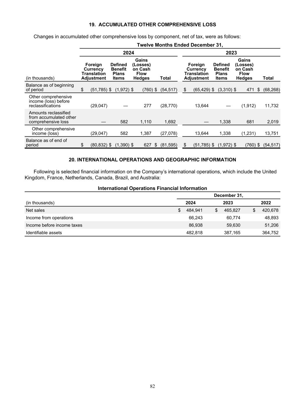 19.  ACCUMULATED OTHER COMPREHENSIVE LOSS Changes in accumulated other comprehensive loss by component, net of tax, were as follows: Twelve Months Ended December 31, 2024 2023 (in thousands) Foreign  Currency  Translation  Adjustment Defined  Benefit  Plans  Items Gains  (Losses)  on Cash  Flow  Hedges Total Foreign  Currency  Translation  Adjustment Defined  Benefit  Plans  Items Gains  (Losses)  on Cash  Flow  Hedges Total Balance as of beginning  of period $ (51,785) $ (1,972) $ (760) $ (54,517) $ (65,429) $ (3,310) $ 471 $ (68,268)  Other comprehensive   income (loss) before  reclassifications  (29,047)  —  277  (28,770)  13,644  —  (1,912)  11,732  Amounts reclassified  from accumulated other  comprehensive loss  —  582  1,110  1,692  —  1,338  681  2,019  Other comprehensive    income (loss)  (29,047)  582  1,387  (27,078)  13,644  1,338  (1,231)  13,751  Balance as of end of  period $ (80,832) $ (1,390) $ 627 $ (81,595) $ (51,785) $ (1,972) $ (760) $ (54,517)  20. INTERNATIONAL OPERATIONS AND GEOGRAPHIC INFORMATION   Following is selected financial information on the Company’s international operations, which include the United  Kingdom, France, Netherlands, Canada, Brazil, and Australia: International Operations Financial Information  December 31, (in thousands) 2024 2023 2022 Net sales $ 484,941 $ 465,827 $ 420,678  Income from operations  66,243  60,774  48,893  Income before income taxes  86,938  59,630  51,206  Identifiable assets  482,818  387,165  364,752  82