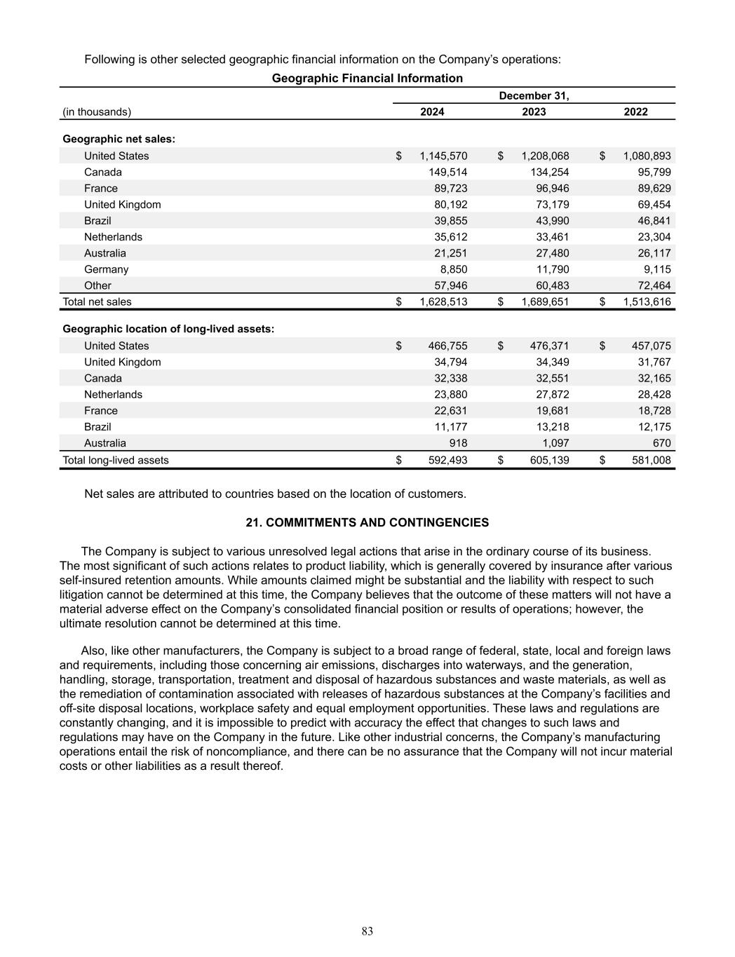 Following is other selected geographic financial information on the Company’s operations: Geographic Financial Information December 31, (in thousands) 2024 2023 2022   Geographic net sales: United States $ 1,145,570 $ 1,208,068 $ 1,080,893  Canada  149,514  134,254  95,799  France  89,723  96,946  89,629  United Kingdom  80,192  73,179  69,454  Brazil  39,855  43,990  46,841  Netherlands  35,612  33,461  23,304  Australia  21,251  27,480  26,117  Germany  8,850  11,790  9,115  Other  57,946  60,483  72,464  Total net sales $ 1,628,513 $ 1,689,651 $ 1,513,616    Geographic location of long-lived assets:    United States $ 466,755 $ 476,371 $ 457,075  United Kingdom  34,794  34,349  31,767  Canada  32,338  32,551  32,165  Netherlands  23,880  27,872  28,428  France  22,631  19,681  18,728  Brazil  11,177  13,218  12,175  Australia  918  1,097  670  Total long-lived assets $ 592,493 $ 605,139 $ 581,008         Net sales are attributed to countries based on the location of customers.   21. COMMITMENTS AND CONTINGENCIES The Company is subject to various unresolved legal actions that arise in the ordinary course of its business.   The most significant of such actions relates to product liability, which is generally covered by insurance after various  self-insured retention amounts. While amounts claimed might be substantial and the liability with respect to such  litigation cannot be determined at this time, the Company believes that the outcome of these matters will not have a  material adverse effect on the Company’s consolidated financial position or results of operations; however, the  ultimate resolution cannot be determined at this time.  Also, like other manufacturers, the Company is subject to a broad range of federal, state, local and foreign laws  and requirements, including those concerning air emissions, discharges into waterways, and the generation,  handling, storage, transportation, treatment and disposal of hazardous substances and waste materials, as well as  the remediation of contamination associated with releases of hazardous substances at the Company’s facilities and  off-site disposal locations, workplace safety and equal employment opportunities. These laws and regulations are  constantly changing, and it is impossible to predict with accuracy the effect that changes to such laws and  regulations may have on the Company in the future. Like other industrial concerns, the Company’s manufacturing  operations entail the risk of noncompliance, and there can be no assurance that the Company will not incur material  costs or other liabilities as a result thereof. 83