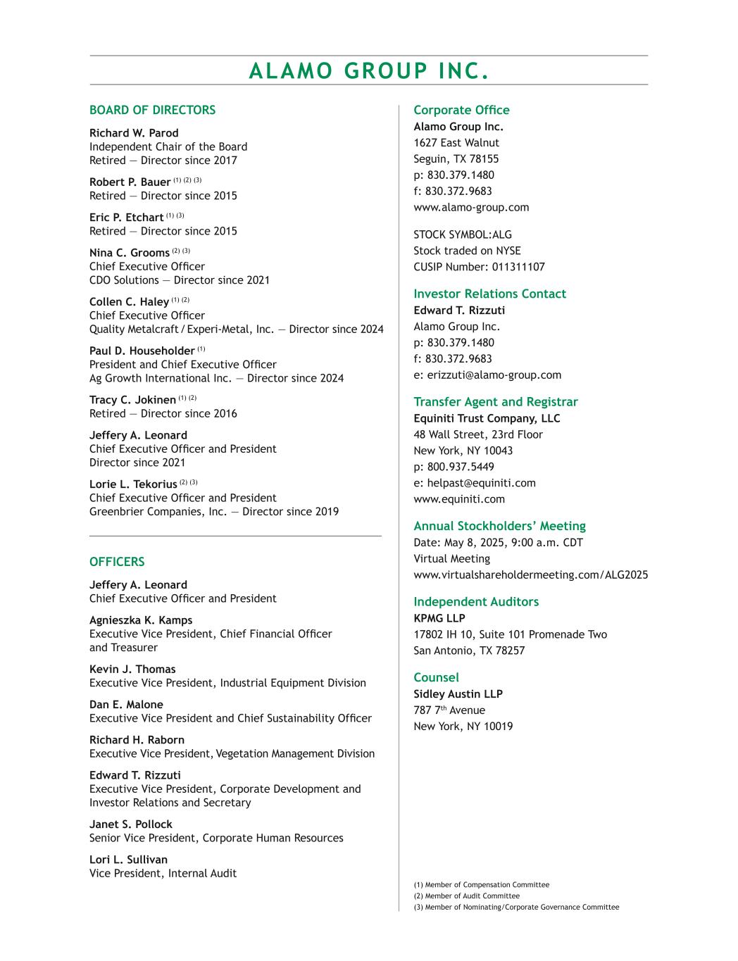 ALAMO GROUP INC. BOARD OF DIRECTORS  Richard W. Parod   Independent Chair of the Board   Retired — Director since 2017  Robert P. Bauer (1) (2) (3)   Retired — Director since 2015 Eric P. Etchart (1) (3)   Retired — Director since 2015 Nina C. Grooms (2) (3)  Chief Executive Officer  CDO Solutions — Director since 2021 Collen C. Haley (1) (2)  Chief Executive Officer  Quality Metalcraft / Experi-Metal, Inc. — Director since 2024 Paul D. Householder (1)  President and Chief Executive Officer  Ag Growth International Inc. — Director since 2024 Tracy C. Jokinen (1) (2)  Retired — Director since 2016 Jeffery A. Leonard  Chief Executive Officer and President  Director since 2021  Lorie L. Tekorius (2) (3)   Chief Executive Officer and President  Greenbrier Companies, Inc. — Director since 2019 OFFICERS Jeffery A. Leonard  Chief Executive Officer and President Agnieszka K. Kamps  Executive Vice President, Chief Financial Officer   and Treasurer Kevin J. Thomas  Executive Vice President, Industrial Equipment Division Dan E. Malone  Executive Vice President and Chief Sustainability Officer Richard H. Raborn  Executive Vice President, Vegetation Management Division Edward T. Rizzuti  Executive Vice President, Corporate Development and  Investor Relations and Secretary Janet S. Pollock  Senior Vice President, Corporate Human Resources Lori L. Sullivan  Vice President, Internal Audit Corporate Office Alamo Group Inc.  1627 East Walnut  Seguin, TX 78155  p: 830.379.1480  f: 830.372.9683  www.alamo-group.com STOCK SYMBOL:ALG  Stock traded on NYSE  CUSIP Number: 011311107 Investor Relations Contact  Edward T. Rizzuti  Alamo Group Inc.  p: 830.379.1480  f: 830.372.9683  e: erizzuti@alamo-group.com Transfer Agent and Registrar  Equiniti Trust Company, LLC  48 Wall Street, 23rd Floor  New York, NY 10043  p: 800.937.5449  e: helpast@equiniti.com  www.equiniti.com Annual Stockholders’ Meeting  Date: May 8, 2025, 9:00 a.m. CDT  Virtual Meeting  www.virtualshareholdermeeting.com/ALG2025 Independent Auditors  KPMG LLP  17802 IH 10, Suite 101 Promenade Two  San Antonio, TX 78257 Counsel  Sidley Austin LLP  787 7th Avenue  New York, NY 10019 (1) Member of Compensation Committee  (2) Member of Audit Committee  (3) Member of Nominating/Corporate Governance Committee