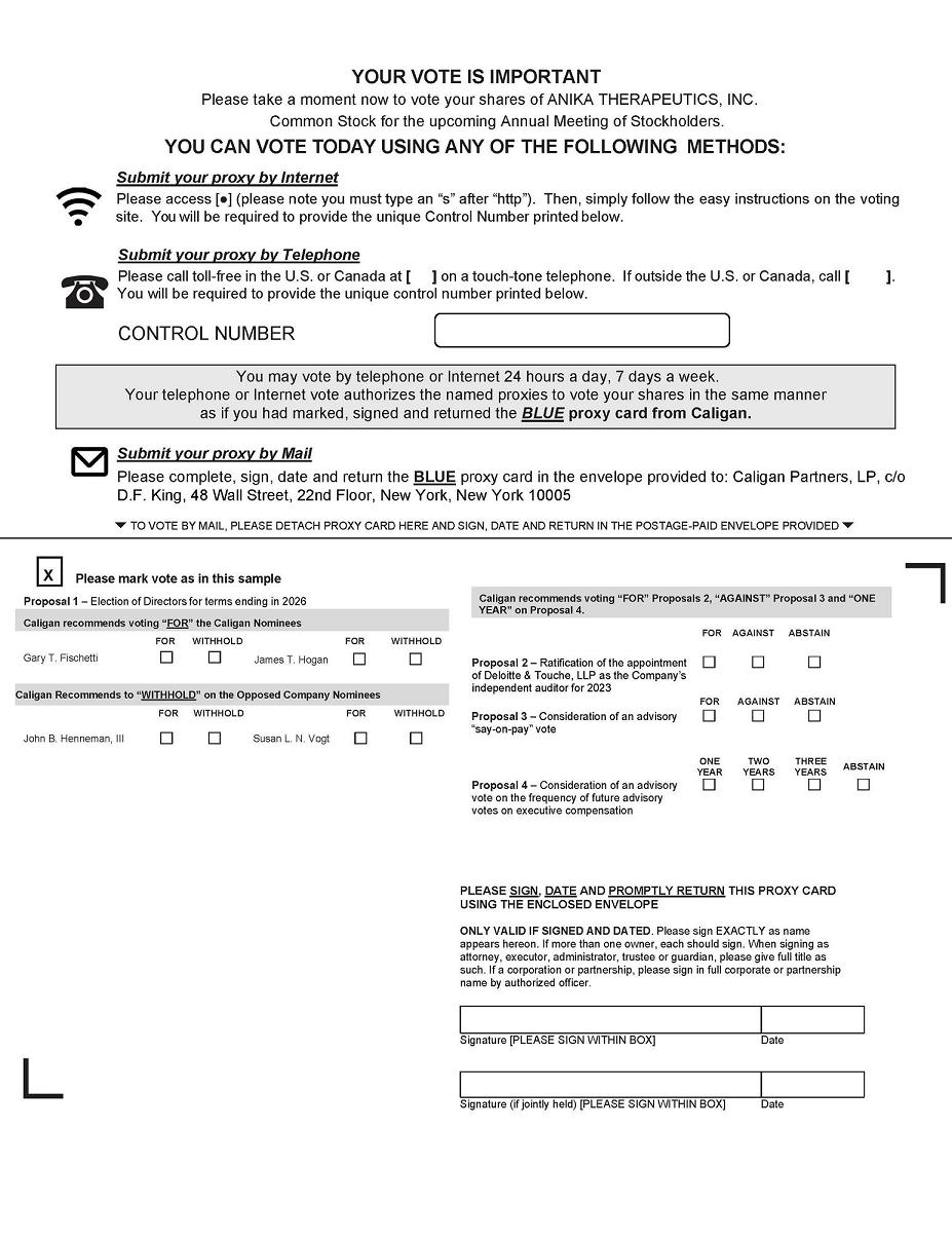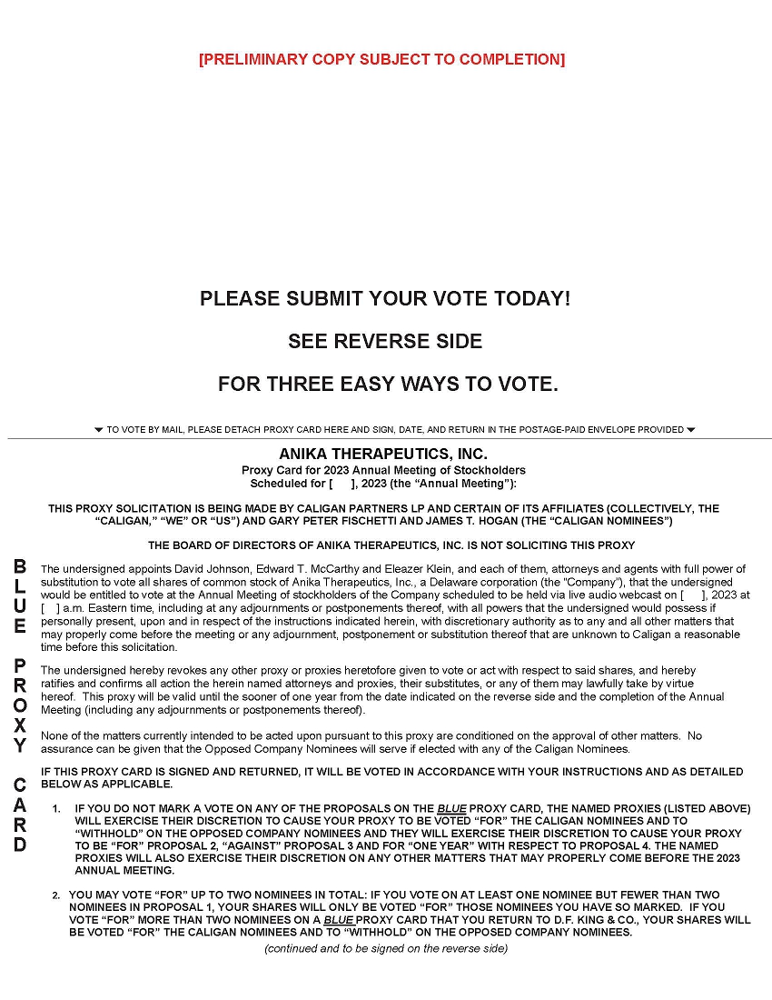 This Proxy Statement and the enclosed BLUE proxy card are being furnished by Caligan Partners LP and certain of its affiliates (as identified on Annex I, “Caligan”, “we” or “us”), and the two Caligan Nominees (defined below) named in Proposal 1 below in connection with the solicitation of proxies (the “Proxy Solicitation”) from the stockholders of Anika Therapeutics, Inc., a Delaware corporation (“Anika” or the “Company”), to elect our highly qualified Caligan Nominees to the Board of Directors of the Company (the “Board”).