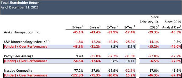 Despite its well-capitalized balance sheet, with ~$90MM in cash, no debt, and positive adjusted EBITDA, Anika’s total shareholder return (“TSR”) has underperformed both its self-selected peer group6 and broader indices over all relevant time horizons, specifically since the Company announced a strategic pivot in September 2019 and since Dr. Blanchard became CEO in February 2020.