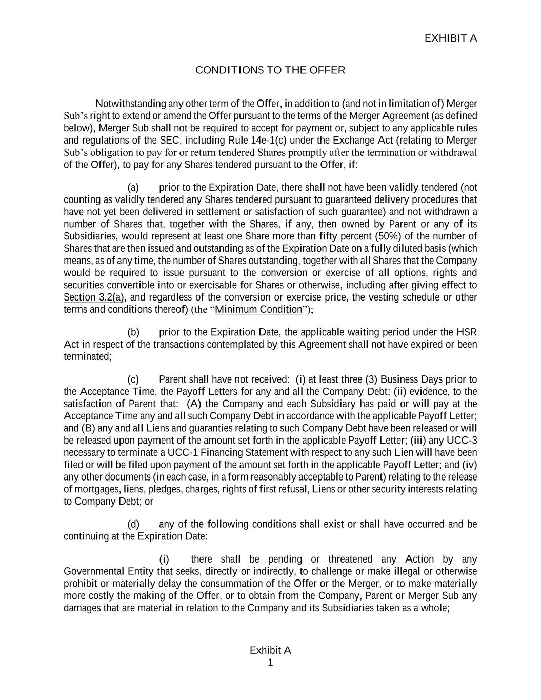 EXHIBIT A Exhibit A 1 CONDITIONS TO THE OFFER Notwithstanding any other term of the Offer, in addition to (and not in limitation of) Merger Sub’s right to extend or amend the Offer pursuant to the terms of the Merger Agreement (as defined below), Merger Sub shall not be required to accept for payment or, subject to any applicable rules and regulations of the SEC, including Rule 14e-1(c) under the Exchange Act (relating to Merger Sub’s obligation to pay for or return tendered Shares promptly after the termination or withdrawal of the Offer), to pay for any Shares tendered pursuant to the Offer, if: (a) prior to the Expiration Date, there shall not have been validly tendered (not counting as validly tendered any Shares tendered pursuant to guaranteed delivery procedures that have not yet been delivered in settlement or satisfaction of such guarantee) and not withdrawn a number of Shares that, together with the Shares, if any, then owned by Parent or any of its Subsidiaries, would represent at least one Share more than fifty percent (50%) of the number of Shares that are then issued and outstanding as of the Expiration Date on a fully diluted basis (which means, as of any time, the number of Shares outstanding, together with all Shares that the Company would be required to issue pursuant to the conversion or exercise of all options, rights and securities convertible into or exercisable for Shares or otherwise, including after giving effect to Section 3.2(a), and regardless of the conversion or exercise price, the vesting schedule or other terms and conditions thereof) (the “Minimum Condition”); (b) prior to the Expiration Date, the applicable waiting period under the HSR Act in respect of the transactions contemplated by this Agreement shall not have expired or been terminated; (c) Parent shall have not received: (i) at least three (3) Business Days prior to the Acceptance Time, the Payoff Letters for any and all the Company Debt; (ii) evidence, to the satisfaction of Parent that: (A) the Company and each Subsidiary has paid or will pay at the Acceptance Time any and all such Company Debt in accordance with the applicable Payoff Letter; and (B) any and all Liens and guaranties relating to such Company Debt have been released or will be released upon payment of the amount set forth in the applicable Payoff Letter; (iii) any UCC-3 necessary to terminate a UCC-1 Financing Statement with respect to any such Lien will have been filed or will be filed upon payment of the amount set forth in the applicable Payoff Letter; and (iv) any other documents (in each case, in a form reasonably acceptable to Parent) relating to the release of mortgages, liens, pledges, charges, rights of first refusal, Liens or other security interests relating to Company Debt; or (d) any of the following conditions shall exist or shall have occurred and be continuing at the Expiration Date: (i) there shall be pending or threatened any Action by any Governmental Entity that seeks, directly or indirectly, to challenge or make illegal or otherwise prohibit or materially delay the consummation of the Offer or the Merger, or to make materially more costly the making of the Offer, or to obtain from the Company, Parent or Merger Sub any damages that are material in relation to the Company and its Subsidiaries taken as a whole;
