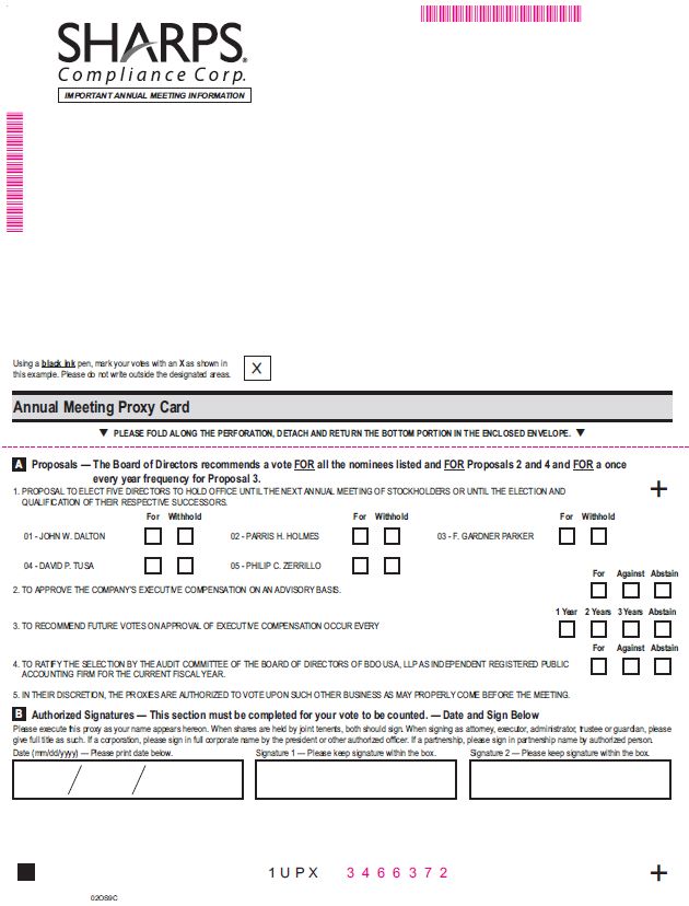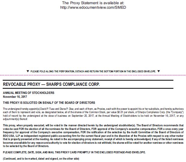 The Proxy Statement is available at: http://www.edocumentview.com/SMED PLEASE FOLD ALONG THE PERFORATION, DETACH AND RETURN THE BOTTOM PORTION IN THE ENCLOSED ENVELOPE. REVOCABLE PROXY — SHARPS COMPLIANCE CORP. ANNUAL MEETING OF STOCKHOLDERS November 16, 2017 THIS PROXY IS SOLICITED ON BEHALF OF THE BOARD OF DIRECTORS The undersigned hereby appoint(s) David P. Tusa and Diana P. Diaz, and each of them, as Proxies, each with the power to appoint his or her substitute, and hereby authorizes each of them to represent and vote, as designated below, all of the shares of the Common Stock, par value $0.01 per share, of Sharps Compliance Corp. (the “Company”) held of record by the undersigned at the close of business on September 25, 2017, at the Annual Meeting of Stockholders to be held on November 16, 2017, or any adjournment(s) thereof. This proxy, when properly executed, will be voted in the manner directed herein by the undersigned stockholder(s). The Board of Directors recommends that votes be cast FOR the election of all the nominees for the Board of Directors, FOR approval of the Company’s executive compensation, FOR a once every year frequency for approval of the Company’s executive compensation, FOR the ratification of the selection by the Audit Committee of the Board of Directors of BDO USA, LLP as independent registered public accounting firm for the current fiscal year and in the discretion of the Proxies with respect to any other matter that is properly presented at the meeting. As noted in the accompanying proxy statement, receipt of which is hereby acknowledged, if any of the listed nominees becomes unavailable for any reason and authority to vote for election of directors is not withheld, the shares will be voted for another nominee or other nominees to be selected by the Board of Directors. PLEASE COMPLETE, DATE, SIGN, AND MAIL THIS PROXY CARD PROMPTLY IN THE ENCLOSED POSTAGE-PAID ENVELOPE. (Continued, and to be marked, dated and signed, on the other side)