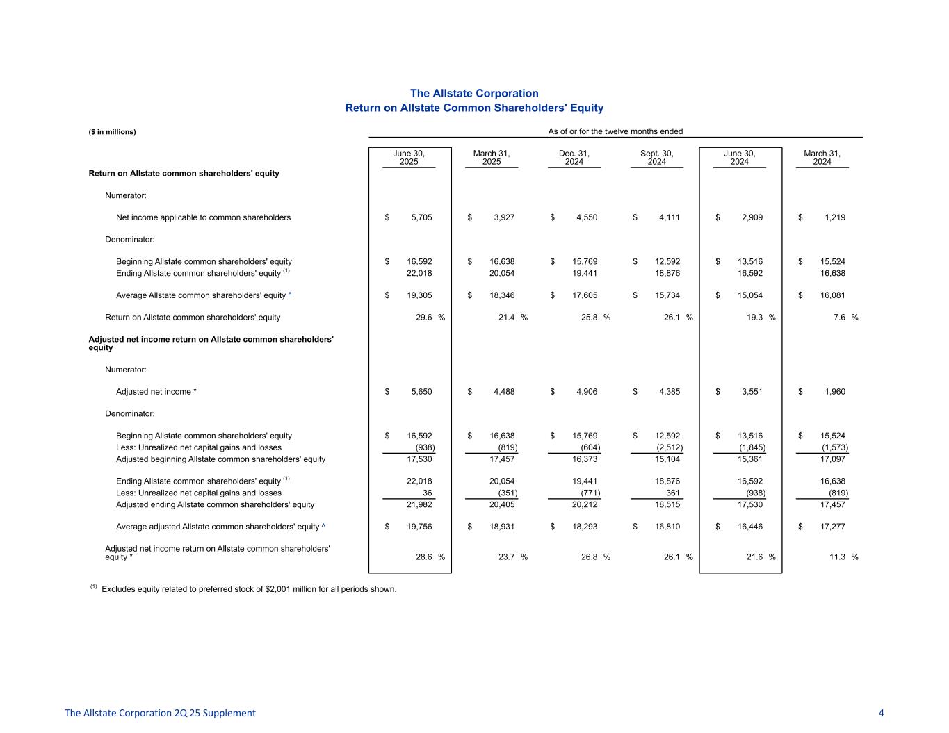 The Allstate Corporation Return on Allstate Common Shareholders' Equity ($ in millions) As of or for the twelve months ended June 30, 2025 March 31, 2025 Dec. 31, 2024 Sept. 30, 2024 June 30, 2024 March 31, 2024 Return on Allstate common shareholders' equity Numerator: Net income applicable to common shareholders $ 5,705 $ 3,927 $ 4,550 $ 4,111 $ 2,909 $ 1,219 Denominator: Beginning Allstate common shareholders' equity $ 16,592 $ 16,638 $ 15,769 $ 12,592 $ 13,516 $ 15,524 Ending Allstate common shareholders' equity (1) 22,018 20,054 19,441 18,876 16,592 16,638 Average Allstate common shareholders' equity ^ $ 19,305 $ 18,346 $ 17,605 $ 15,734 $ 15,054 $ 16,081 Return on Allstate common shareholders' equity 29.6 % 21.4 % 25.8 % 26.1 % 19.3 % 7.6 % Adjusted net income return on Allstate common shareholders' equity Numerator: Adjusted net income * $ 5,650 $ 4,488 $ 4,906 $ 4,385 $ 3,551 $ 1,960 Denominator: Beginning Allstate common shareholders' equity $ 16,592 $ 16,638 $ 15,769 $ 12,592 $ 13,516 $ 15,524 Less: Unrealized net capital gains and losses (938) (819) (604) (2,512) (1,845) (1,573) Adjusted beginning Allstate common shareholders' equity 17,530 17,457 16,373 15,104 15,361 17,097 Ending Allstate common shareholders' equity (1) 22,018 20,054 19,441 18,876 16,592 16,638 Less: Unrealized net capital gains and losses 36 (351) (771) 361 (938) (819) Adjusted ending Allstate common shareholders' equity 21,982 20,405 20,212 18,515 17,530 17,457 Average adjusted Allstate common shareholders' equity ^ $ 19,756 $ 18,931 $ 18,293 $ 16,810 $ 16,446 $ 17,277 Adjusted net income return on Allstate common shareholders' equity * 28.6 % 23.7 % 26.8 % 26.1 % 21.6 % 11.3 % (1) Excludes equity related to preferred stock of $2,001 million for all periods shown. The Allstate Corporation 2Q 25 Supplement 4