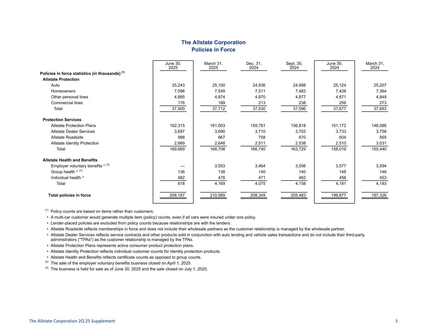 The Allstate Corporation Policies in Force June 30, 2025 March 31, 2025 Dec. 31, 2024 Sept. 30, 2024 June 30, 2024 March 31, 2024 Policies in force statistics (in thousands) (1) Allstate Protection Auto 25,243 25,100 24,936 24,998 25,124 25,207 Homeowners 7,596 7,549 7,511 7,483 7,426 7,364 Other personal lines 4,885 4,874 4,870 4,877 4,871 4,849 Commercial lines 176 189 213 238 256 273 Total 37,900 37,712 37,530 37,596 37,677 37,693 Protection Services Allstate Protection Plans 162,315 161,503 159,761 156,818 151,172 148,086 Allstate Dealer Services 3,697 3,690 3,710 3,703 3,733 3,758 Allstate Roadside 988 867 758 670 604 565 Allstate Identity Protection 2,669 2,648 2,511 2,538 2,510 3,031 Total 169,669 168,708 166,740 163,729 158,019 155,440 Allstate Health and Benefits Employer voluntary benefits ^ (2) — 3,553 3,464 3,556 3,577 3,594 Group health ^ (3) 136 138 140 140 148 146 Individual health ^ 482 478 471 462 456 453 Total 618 4,169 4,075 4,158 4,181 4,193 Total policies in force 208,187 210,589 208,345 205,483 199,877 197,326 (1) Policy counts are based on items rather than customers. • A multi-car customer would generate multiple item (policy) counts, even if all cars were insured under one policy. • Lender-placed policies are excluded from policy counts because relationships are with the lenders. • Allstate Roadside reflects memberships in force and does not include their wholesale partners as the customer relationship is managed by the wholesale partner. • Allstate Dealer Services reflects service contracts and other products sold in conjunction with auto lending and vehicle sales transactions and do not include their third-party administrators ("TPAs") as the customer relationship is managed by the TPAs. • Allstate Protection Plans represents active consumer product protection plans. • Allstate Identity Protection reflects individual customer counts for identity protection products. • Allstate Health and Benefits reflects certificate counts as opposed to group counts. (2) The sale of the employer voluntary benefits business closed on April 1, 2025. (3) The business is held for sale as of June 30, 2025 and the sale closed on July 1, 2025. The Allstate Corporation 2Q 25 Supplement 5