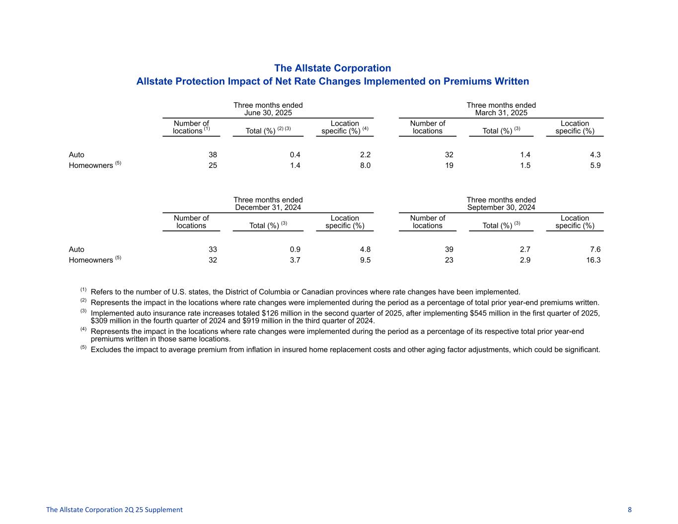 The Allstate Corporation Allstate Protection Impact of Net Rate Changes Implemented on Premiums Written Three months ended June 30, 2025 Three months ended March 31, 2025 Number of locations (1) Total (%) (2) (3) Location specific (%) (4) Number of locations Total (%) (3) Location specific (%) Auto 38 0.4 2.2 32 1.4 4.3 Homeowners (5) 25 1.4 8.0 19 1.5 5.9 Three months ended December 31, 2024 Three months ended September 30, 2024 Number of locations Total (%) (3) Location specific (%) Number of locations Total (%) (3) Location specific (%) Auto 33 0.9 4.8 39 2.7 7.6 Homeowners (5) 32 3.7 9.5 23 2.9 16.3 (1) Refers to the number of U.S. states, the District of Columbia or Canadian provinces where rate changes have been implemented. (2) Represents the impact in the locations where rate changes were implemented during the period as a percentage of total prior year-end premiums written. (3) Implemented auto insurance rate increases totaled $126 million in the second quarter of 2025, after implementing $545 million in the first quarter of 2025, $309 million in the fourth quarter of 2024 and $919 million in the third quarter of 2024. (4) Represents the impact in the locations where rate changes were implemented during the period as a percentage of its respective total prior year-end premiums written in those same locations. (5) Excludes the impact to average premium from inflation in insured home replacement costs and other aging factor adjustments, which could be significant. The Allstate Corporation 2Q 25 Supplement 8