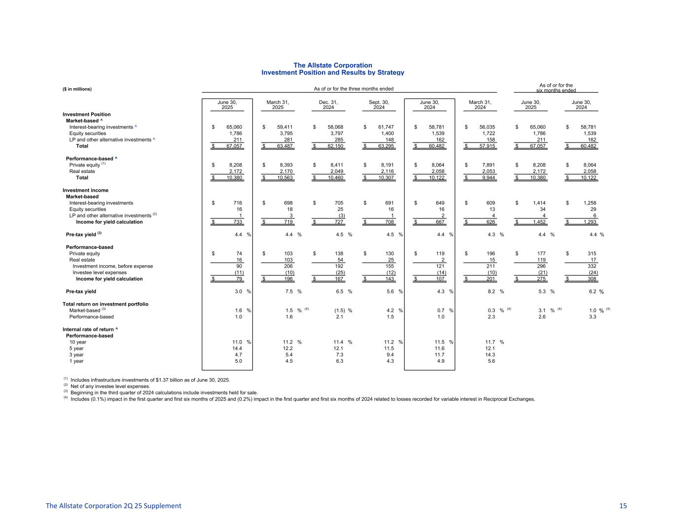 The Allstate Corporation Investment Position and Results by Strategy ($ in millions) As of or for the three months ended As of or for the six months ended June 30, 2025 March 31, 2025 Dec. 31, 2024 Sept. 30, 2024 June 30, 2024 March 31, 2024 June 30, 2025 June 30, 2024 Investment Position Market-based ^ Interest-bearing investments ^ $ 65,060 $ 59,411 $ 58,068 $ 61,747 $ 58,781 $ 56,035 $ 65,060 $ 58,781 Equity securities 1,786 3,795 3,797 1,400 1,539 1,722 1,786 1,539 LP and other alternative investments ^ 211 281 285 148 162 158 211 162 Total $ 67,057 $ 63,487 $ 62,150 $ 63,295 $ 60,482 $ 57,915 $ 67,057 $ 60,482 Performance-based ^ Private equity (1) $ 8,208 $ 8,393 $ 8,411 $ 8,191 $ 8,064 $ 7,891 $ 8,208 $ 8,064 Real estate 2,172 2,170 2,049 2,116 2,058 2,053 2,172 2,058 Total $ 10,380 $ 10,563 $ 10,460 $ 10,307 $ 10,122 $ 9,944 $ 10,380 $ 10,122 Investment income Market-based Interest-bearing investments $ 716 $ 698 $ 705 $ 691 $ 649 $ 609 $ 1,414 $ 1,258 Equity securities 16 18 25 16 16 13 34 29 LP and other alternative investments (2) 1 3 (3) 1 2 4 4 6 Income for yield calculation $ 733 $ 719 $ 727 $ 708 $ 667 $ 626 $ 1,452 $ 1,293 Pre-tax yield (3) 4.4 % 4.4 % 4.5 % 4.5 % 4.4 % 4.3 % 4.4 % 4.4 % Performance-based Private equity $ 74 $ 103 $ 138 $ 130 $ 119 $ 196 $ 177 $ 315 Real estate 16 103 54 25 2 15 119 17 Investment income, before expense 90 206 192 155 121 211 296 332 Investee level expenses (11) (10) (25) (12) (14) (10) (21) (24) Income for yield calculation $ 79 $ 196 $ 167 $ 143 $ 107 $ 201 $ 275 $ 308 Pre-tax yield 3.0 % 7.5 % 6.5 % 5.6 % 4.3 % 8.2 % 5.3 % 6.2 % Total return on investment portfolio Market-based (3) 1.6 % 1.5 % (4) (1.5) % 4.2 % 0.7 % 0.3 % (4) 3.1 % (4) 1.0 % (4) Performance-based 1.0 1.6 2.1 1.5 1.0 2.3 2.6 3.3 Internal rate of return ^ Performance-based 10 year 11.0 % 11.2 % 11.4 % 11.2 % 11.5 % 11.7 % 5 year 14.4 12.2 12.1 11.5 11.6 12.1 3 year 4.7 5.4 7.3 9.4 11.7 14.3 1 year 5.0 4.5 6.3 4.3 4.9 5.6 (1) Includes infrastructure investments of $1.37 billion as of June 30, 2025. (2) Net of any investee level expenses. (3) Beginning in the third quarter of 2024 calculations include investments held for sale. (4) Includes (0.1%) impact in the first quarter and first six months of 2025 and (0.2%) impact in the first quarter and first six months of 2024 related to losses recorded for variable interest in Reciprocal Exchanges. The Allstate Corporation 2Q 25 Supplement 15