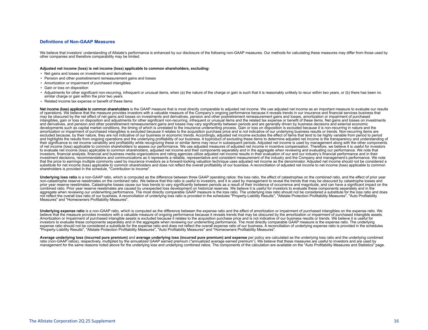 Definitions of Non-GAAP Measures We believe that investors’ understanding of Allstate’s performance is enhanced by our disclosure of the following non-GAAP measures. Our methods for calculating these measures may differ from those used by other companies and therefore comparability may be limited. Adjusted net income (loss) is net income (loss) applicable to common shareholders, excluding: • Net gains and losses on investments and derivatives • Pension and other postretirement remeasurement gains and losses • Amortization or impairment of purchased intangibles • Gain or loss on disposition • Adjustments for other significant non-recurring, infrequent or unusual items, when (a) the nature of the charge or gain is such that it is reasonably unlikely to recur within two years, or (b) there has been no similar charge or gain within the prior two years • Related income tax expense or benefit of these items Net income (loss) applicable to common shareholders is the GAAP measure that is most directly comparable to adjusted net income. We use adjusted net income as an important measure to evaluate our results of operations. We believe that the measure provides investors with a valuable measure of the Company’s ongoing performance because it reveals trends in our insurance and financial services business that may be obscured by the net effect of net gains and losses on investments and derivatives, pension and other postretirement remeasurement gains and losses, amortization or impairment of purchased intangibles, gain or loss on disposition and adjustments for other significant non-recurring, infrequent or unusual items and the related tax expense or benefit of these items. Net gains and losses on investments and derivatives, and pension and other postretirement remeasurement gains and losses may vary significantly between periods and are generally driven by business decisions and external economic developments such as capital market conditions, the timing of which is unrelated to the insurance underwriting process. Gain or loss on disposition is excluded because it is non-recurring in nature and the amortization or impairment of purchased intangibles is excluded because it relates to the acquisition purchase price and is not indicative of our underlying business results or trends. Non-recurring items are excluded because, by their nature, they are not indicative of our business or economic trends. Accordingly, adjusted net income excludes the effect of items that tend to be highly variable from period to period and highlights the results from ongoing operations and the underlying profitability of our business. A byproduct of excluding these items to determine adjusted net income is the transparency and understanding of their significance to net income variability and profitability while recognizing these or similar items may recur in subsequent periods. Adjusted net income is used by management along with the other components of net income (loss) applicable to common shareholders to assess our performance. We use adjusted measures of adjusted net income in incentive compensation. Therefore, we believe it is useful for investors to evaluate net income (loss) applicable to common shareholders, adjusted net income and their components separately and in the aggregate when reviewing and evaluating our performance. We note that investors, financial analysts, financial and business media organizations and rating agencies utilize adjusted net income results in their evaluation of our and our industry’s financial performance and in their investment decisions, recommendations and communications as it represents a reliable, representative and consistent measurement of the industry and the Company and management’s performance. We note that the price to earnings multiple commonly used by insurance investors as a forward-looking valuation technique uses adjusted net income as the denominator. Adjusted net income should not be considered a substitute for net income (loss) applicable to common shareholders and does not reflect the overall profitability of our business. A reconciliation of adjusted net income to net income (loss) applicable to common shareholders is provided in the schedule, "Contribution to Income". Underlying loss ratio is a non-GAAP ratio, which is computed as the difference between three GAAP operating ratios: the loss ratio, the effect of catastrophes on the combined ratio, and the effect of prior year non-catastrophe reserve reestimates on the combined ratio. We believe that this ratio is useful to investors, and it is used by management to reveal the trends that may be obscured by catastrophe losses and prior year reserve reestimates. Catastrophe losses cause our loss trends to vary significantly between periods as a result of their incidence of occurrence and magnitude, and can have a significant impact on the combined ratio. Prior year reserve reestimates are caused by unexpected loss development on historical reserves. We believe it is useful for investors to evaluate these components separately and in the aggregate when reviewing our underwriting performance. The most directly comparable GAAP measure is the loss ratio. The underlying loss ratio should not be considered a substitute for the loss ratio and does not reflect the overall loss ratio of our business. A reconciliation of underlying loss ratio is provided in the schedules "Property-Liability Results", "Allstate Protection Profitability Measures", "Auto Profitability Measures" and "Homeowners Profitability Measures". Underlying expense ratio is a non-GAAP ratio, which is computed as the difference between the expense ratio and the effect of amortization or impairment of purchased intangibles on the expense ratio. We believe that the measure provides investors with a valuable measure of ongoing performance because it reveals trends that may be obscured by the amortization or impairment of purchased intangib