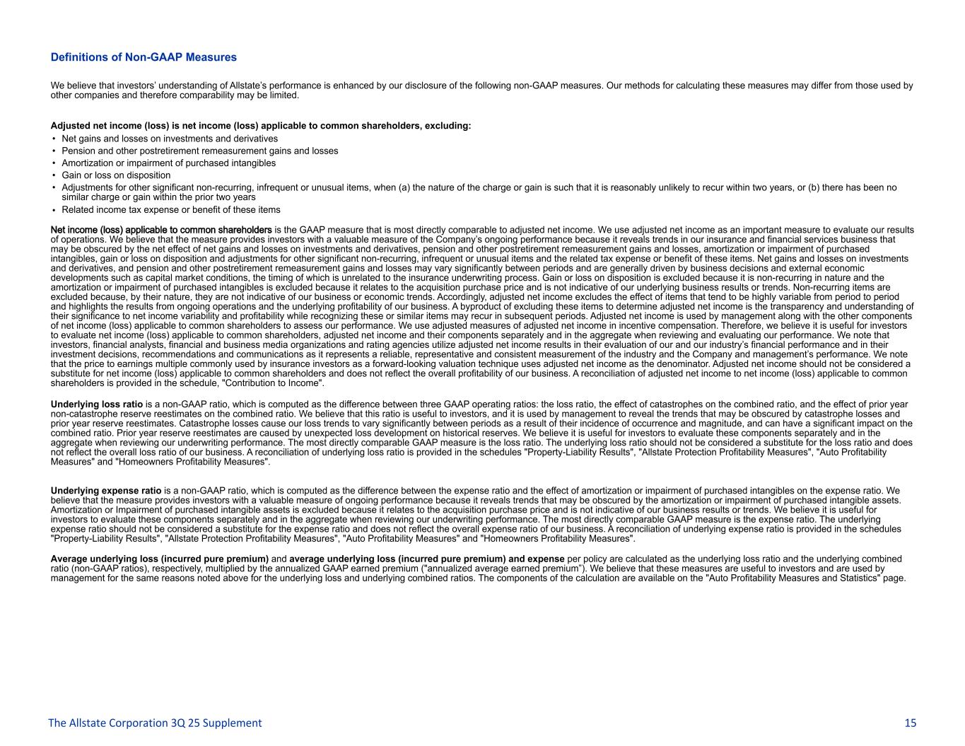 Definitions of Non-GAAP Measures We believe that investors’ understanding of Allstate’s performance is enhanced by our disclosure of the following non-GAAP measures. Our methods for calculating these measures may differ from those used by other companies and therefore comparability may be limited. Adjusted net income (loss) is net income (loss) applicable to common shareholders, excluding: • Net gains and losses on investments and derivatives • Pension and other postretirement remeasurement gains and losses • Amortization or impairment of purchased intangibles • Gain or loss on disposition • Adjustments for other significant non-recurring, infrequent or unusual items, when (a) the nature of the charge or gain is such that it is reasonably unlikely to recur within two years, or (b) there has been no similar charge or gain within the prior two years • Related income tax expense or benefit of these items Net income (loss) applicable to common shareholders is the GAAP measure that is most directly comparable to adjusted net income. We use adjusted net income as an important measure to evaluate our results of operations. We believe that the measure provides investors with a valuable measure of the Company’s ongoing performance because it reveals trends in our insurance and financial services business that may be obscured by the net effect of net gains and losses on investments and derivatives, pension and other postretirement remeasurement gains and losses, amortization or impairment of purchased intangibles, gain or loss on disposition and adjustments for other significant non-recurring, infrequent or unusual items and the related tax expense or benefit of these items. Net gains and losses on investments and derivatives, and pension and other postretirement remeasurement gains and losses may vary significantly between periods and are generally driven by business decisions and external economic developments such as capital market conditions, the timing of which is unrelated to the insurance underwriting process. Gain or loss on disposition is excluded because it is non-recurring in nature and the amortization or impairment of purchased intangibles is excluded because it relates to the acquisition purchase price and is not indicative of our underlying business results or trends. Non-recurring items are excluded because, by their nature, they are not indicative of our business or economic trends. Accordingly, adjusted net income excludes the effect of items that tend to be highly variable from period to period and highlights the results from ongoing operations and the underlying profitability of our business. A byproduct of excluding these items to determine adjusted net income is the transparency and understanding of their significance to net income variability and profitability while recognizing these or similar items may recur in subsequent periods. Adjusted net income is used by management along with the other components of net income (loss) applicable to common shareholders to assess our performance. We use adjusted measures of adjusted net income in incentive compensation. Therefore, we believe it is useful for investors to evaluate net income (loss) applicable to common shareholders, adjusted net income and their components separately and in the aggregate when reviewing and evaluating our performance. We note that investors, financial analysts, financial and business media organizations and rating agencies utilize adjusted net income results in their evaluation of our and our industry’s financial performance and in their investment decisions, recommendations and communications as it represents a reliable, representative and consistent measurement of the industry and the Company and management’s performance. We note that the price to earnings multiple commonly used by insurance investors as a forward-looking valuation technique uses adjusted net income as the denominator. Adjusted net income should not be considered a substitute for net income (loss) applicable to common shareholders and does not reflect the overall profitability of our business. A reconciliation of adjusted net income to net income (loss) applicable to common shareholders is provided in the schedule, "Contribution to Income". Underlying loss ratio is a non-GAAP ratio, which is computed as the difference between three GAAP operating ratios: the loss ratio, the effect of catastrophes on the combined ratio, and the effect of prior year non-catastrophe reserve reestimates on the combined ratio. We believe that this ratio is useful to investors, and it is used by management to reveal the trends that may be obscured by catastrophe losses and prior year reserve reestimates. Catastrophe losses cause our loss trends to vary significantly between periods as a result of their incidence of occurrence and magnitude, and can have a significant impact on the combined ratio. Prior year reserve reestimates are caused by unexpected loss development on historical reserves. We believe it is useful for investors to evaluate these components separately and in the aggregate when reviewing our underwriting performance. The most directly comparable GAAP measure is the loss ratio. The underlying loss ratio should not be considered a substitute for the loss ratio and does not reflect the overall loss ratio of our business. A reconciliation of underlying loss ratio is provided in the schedules "Property-Liability Results", "Allstate Protection Profitability Measures", "Auto Profitability Measures" and "Homeowners Profitability Measures". Underlying expense ratio is a non-GAAP ratio, which is computed as the difference between the expense ratio and the effect of amortization or impairment of purchased intangibles on the expense ratio. We believe that the measure provides investors with a valuable measure of ongoing performance because it reveals trends that may be obscured by the amortization or impairment of purchased intangib