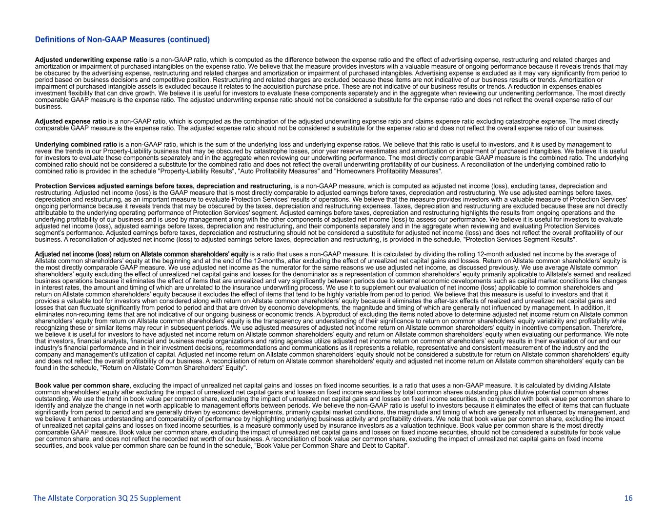 Definitions of Non-GAAP Measures (continued) Adjusted underwriting expense ratio is a non-GAAP ratio, which is computed as the difference between the expense ratio and the effect of advertising expense, restructuring and related charges and amortization or impairment of purchased intangibles on the expense ratio. We believe that the measure provides investors with a valuable measure of ongoing performance because it reveals trends that may be obscured by the advertising expense, restructuring and related charges and amortization or impairment of purchased intangibles. Advertising expense is excluded as it may vary significantly from period to period based on business decisions and competitive position. Restructuring and related charges are excluded because these items are not indicative of our business results or trends. Amortization or impairment of purchased intangible assets is excluded because it relates to the acquisition purchase price. These are not indicative of our business results or trends. A reduction in expenses enables investment flexibility that can drive growth. We believe it is useful for investors to evaluate these components separately and in the aggregate when reviewing our underwriting performance. The most directly comparable GAAP measure is the expense ratio. The adjusted underwriting expense ratio should not be considered a substitute for the expense ratio and does not reflect the overall expense ratio of our business. Adjusted expense ratio is a non-GAAP ratio, which is computed as the combination of the adjusted underwriting expense ratio and claims expense ratio excluding catastrophe expense. The most directly comparable GAAP measure is the expense ratio. The adjusted expense ratio should not be considered a substitute for the expense ratio and does not reflect the overall expense ratio of our business. Underlying combined ratio is a non-GAAP ratio, which is the sum of the underlying loss and underlying expense ratios. We believe that this ratio is useful to investors, and it is used by management to reveal the trends in our Property-Liability business that may be obscured by catastrophe losses, prior year reserve reestimates and amortization or impairment of purchased intangibles. We believe it is useful for investors to evaluate these components separately and in the aggregate when reviewing our underwriting performance. The most directly comparable GAAP measure is the combined ratio. The underlying combined ratio should not be considered a substitute for the combined ratio and does not reflect the overall underwriting profitability of our business. A reconciliation of the underlying combined ratio to combined ratio is provided in the schedule "Property-Liability Results", "Auto Profitability Measures" and "Homeowners Profitability Measures". Protection Services adjusted earnings before taxes, depreciation and restructuring, is a non-GAAP measure, which is computed as adjusted net income (loss), excluding taxes, depreciation and restructuring. Adjusted net income (loss) is the GAAP measure that is most directly comparable to adjusted earnings before taxes, depreciation and restructuring. We use adjusted earnings before taxes, depreciation and restructuring, as an important measure to evaluate Protection Services' results of operations. We believe that the measure provides investors with a valuable measure of Protection Services' ongoing performance because it reveals trends that may be obscured by the taxes, depreciation and restructuring expenses. Taxes, depreciation and restructuring are excluded because these are not directly attributable to the underlying operating performance of Protection Services' segment. Adjusted earnings before taxes, depreciation and restructuring highlights the results from ongoing operations and the underlying profitability of our business and is used by management along with the other components of adjusted net income (loss) to assess our performance. We believe it is useful for investors to evaluate adjusted net income (loss), adjusted earnings before taxes, depreciation and restructuring, and their components separately and in the aggregate when reviewing and evaluating Protection Services segment’s performance. Adjusted earnings before taxes, depreciation and restructuring should not be considered a substitute for adjusted net income (loss) and does not reflect the overall profitability of our business. A reconciliation of adjusted net income (loss) to adjusted earnings before taxes, depreciation and restructuring, is provided in the schedule, "Protection Services Segment Results". Adjusted net income (loss) return on Allstate common shareholders’ equity is a ratio that uses a non-GAAP measure. It is calculated by dividing the rolling 12-month adjusted net income by the average of Allstate common shareholders’ equity at the beginning and at the end of the 12-months, after excluding the effect of unrealized net capital gains and losses. Return on Allstate common shareholders’ equity is the most directly comparable GAAP measure. We use adjusted net income as the numerator for the same reasons we use adjusted net income, as discussed previously. We use average Allstate common shareholders’ equity excluding the effect of unrealized net capital gains and losses for the denominator as a representation of common shareholders’ equity primarily applicable to Allstate's earned and realized business operations because it eliminates the effect of items that are unrealized and vary significantly between periods due to external economic developments such as capital market conditions like changes in interest rates, the amount and timing of which are unrelated to the insurance underwriting process. We use it to supplement our evaluation of net income (loss) applicable to common shareholders and return on Allstate common shareholders’ equity because it excludes the effect of items that tend to be highly variable from period to p