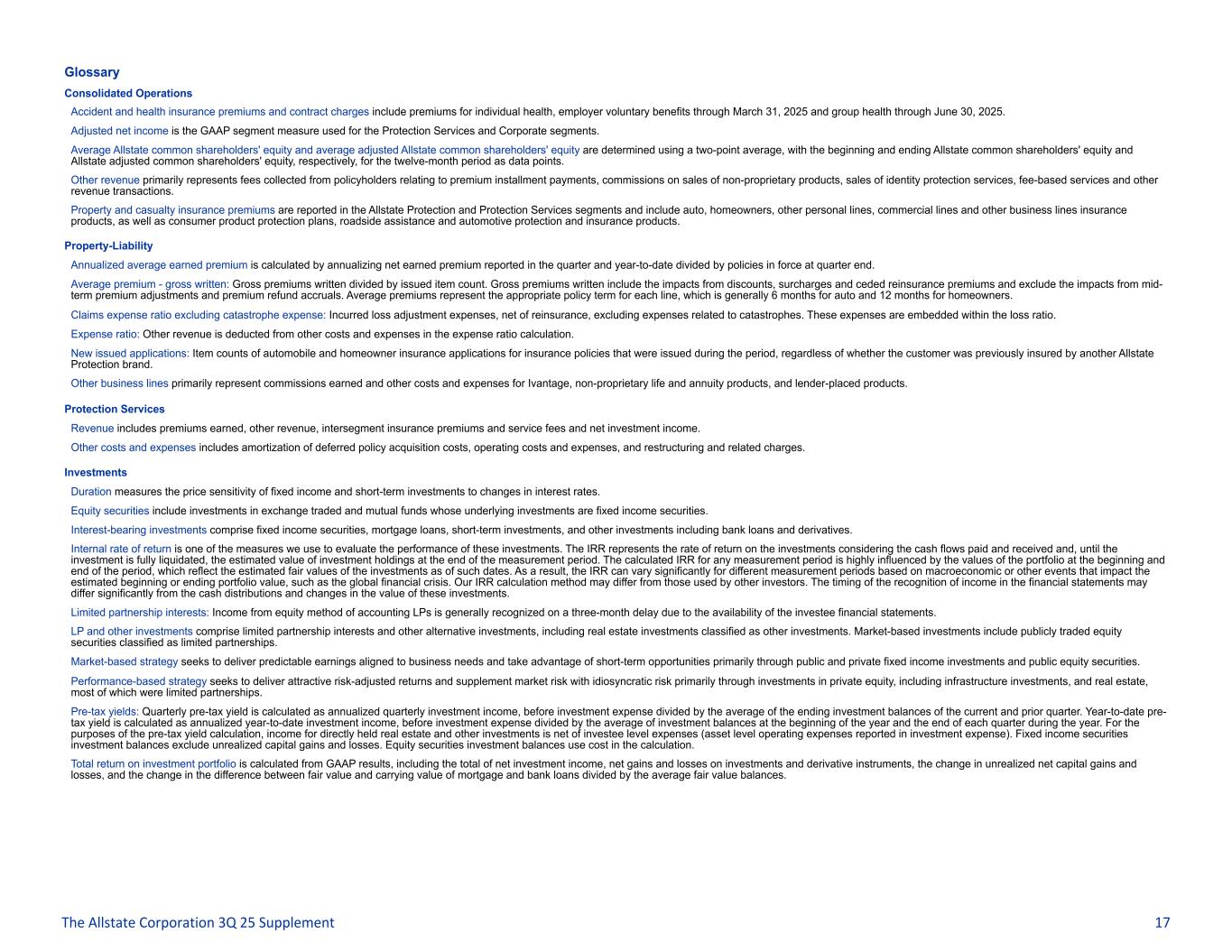 Glossary Consolidated Operations Accident and health insurance premiums and contract charges include premiums for individual health, employer voluntary benefits through March 31, 2025 and group health through June 30, 2025. Adjusted net income is the GAAP segment measure used for the Protection Services and Corporate segments. Average Allstate common shareholders' equity and average adjusted Allstate common shareholders' equity are determined using a two-point average, with the beginning and ending Allstate common shareholders' equity and Allstate adjusted common shareholders' equity, respectively, for the twelve-month period as data points. Other revenue primarily represents fees collected from policyholders relating to premium installment payments, commissions on sales of non-proprietary products, sales of identity protection services, fee-based services and other revenue transactions. Property and casualty insurance premiums are reported in the Allstate Protection and Protection Services segments and include auto, homeowners, other personal lines, commercial lines and other business lines insurance products, as well as consumer product protection plans, roadside assistance and automotive protection and insurance products. Property-Liability Annualized average earned premium is calculated by annualizing net earned premium reported in the quarter and year-to-date divided by policies in force at quarter end. Average premium - gross written: Gross premiums written divided by issued item count. Gross premiums written include the impacts from discounts, surcharges and ceded reinsurance premiums and exclude the impacts from mid- term premium adjustments and premium refund accruals. Average premiums represent the appropriate policy term for each line, which is generally 6 months for auto and 12 months for homeowners. Claims expense ratio excluding catastrophe expense: Incurred loss adjustment expenses, net of reinsurance, excluding expenses related to catastrophes. These expenses are embedded within the loss ratio. Expense ratio: Other revenue is deducted from other costs and expenses in the expense ratio calculation. New issued applications: Item counts of automobile and homeowner insurance applications for insurance policies that were issued during the period, regardless of whether the customer was previously insured by another Allstate Protection brand. Other business lines primarily represent commissions earned and other costs and expenses for Ivantage, non-proprietary life and annuity products, and lender-placed products. Protection Services Revenue includes premiums earned, other revenue, intersegment insurance premiums and service fees and net investment income. Other costs and expenses includes amortization of deferred policy acquisition costs, operating costs and expenses, and restructuring and related charges. Investments Duration measures the price sensitivity of fixed income and short-term investments to changes in interest rates. Equity securities include investments in exchange traded and mutual funds whose underlying investments are fixed income securities. Interest-bearing investments comprise fixed income securities, mortgage loans, short-term investments, and other investments including bank loans and derivatives. Internal rate of return is one of the measures we use to evaluate the performance of these investments. The IRR represents the rate of return on the investments considering the cash flows paid and received and, until the investment is fully liquidated, the estimated value of investment holdings at the end of the measurement period. The calculated IRR for any measurement period is highly influenced by the values of the portfolio at the beginning and end of the period, which reflect the estimated fair values of the investments as of such dates. As a result, the IRR can vary significantly for different measurement periods based on macroeconomic or other events that impact the estimated beginning or ending portfolio value, such as the global financial crisis. Our IRR calculation method may differ from those used by other investors. The timing of the recognition of income in the financial statements may differ significantly from the cash distributions and changes in the value of these investments. Limited partnership interests: Income from equity method of accounting LPs is generally recognized on a three-month delay due to the availability of the investee financial statements. LP and other investments comprise limited partnership interests and other alternative investments, including real estate investments classified as other investments. Market-based investments include publicly traded equity securities classified as limited partnerships. Market-based strategy seeks to deliver predictable earnings aligned to business needs and take advantage of short-term opportunities primarily through public and private fixed income investments and public equity securities. Performance-based strategy seeks to deliver attractive risk-adjusted returns and supplement market risk with idiosyncratic risk primarily through investments in private equity, including infrastructure investments, and real estate, most of which were limited partnerships. Pre-tax yields: Quarterly pre-tax yield is calculated as annualized quarterly investment income, before investment expense divided by the average of the ending investment balances of the current and prior quarter. Year-to-date pre- tax yield is calculated as annualized year-to-date investment income, before investment expense divided by the average of investment balances at the beginning of the year and the end of each quarter during the year. For the purposes of the pre-tax yield calculation, income for directly held real estate and other investments is net of investee level expenses (asset level operating expenses reported in investment expense). Fixed income securities investment balances exclude unrealized capital gains and losses. Equity s