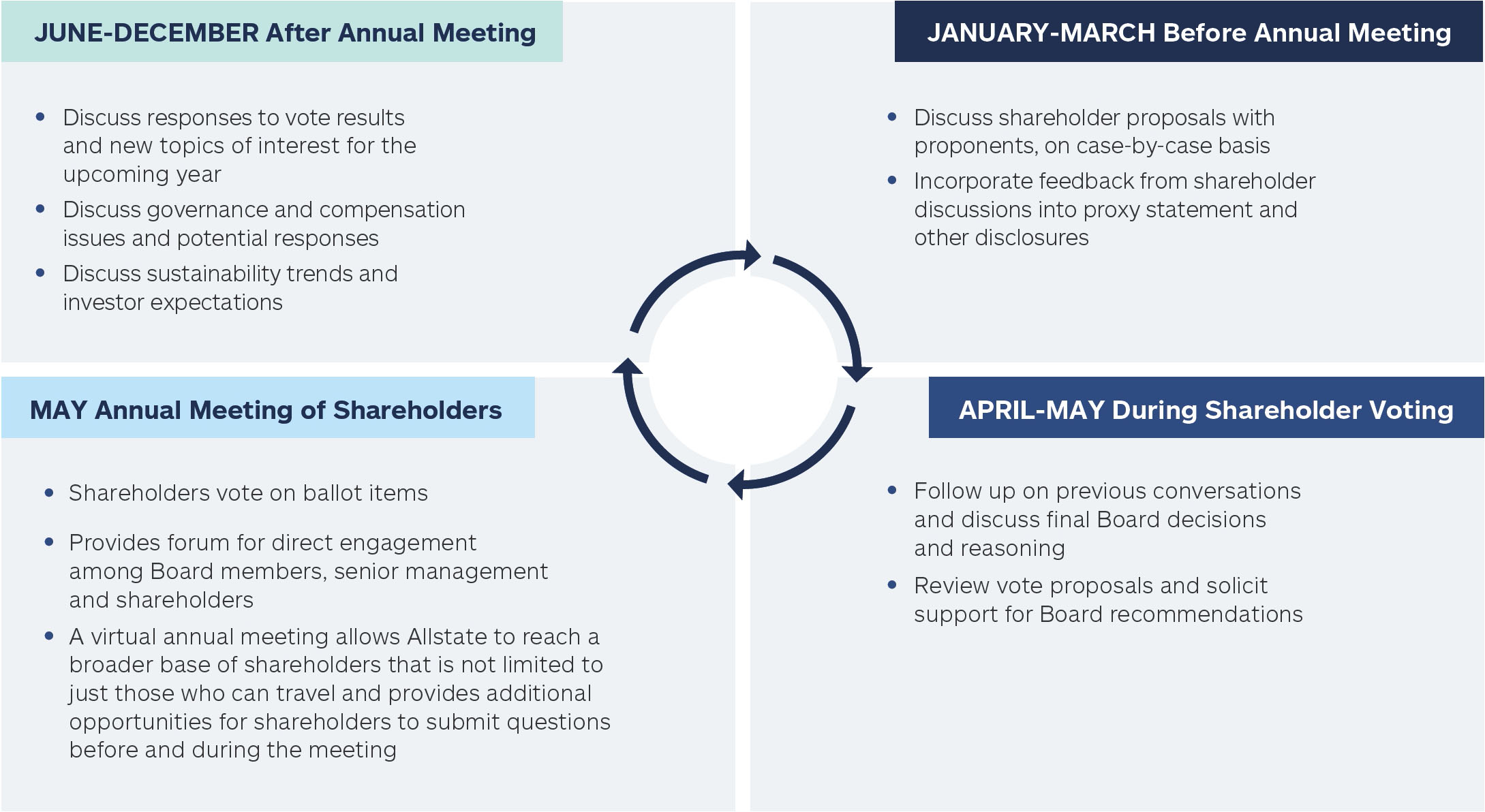 Shareholders of record are invited to attend the annual meeting of The Allstate Corporation on Tuesday, May 14, 2024, 11:00 a.m. Central time. The company will be hosting the meeting live via the Internet. To attend the virtual meeting please visit www. virtualshareholdermeeting.com/ALL2024. Holders of common stock of record at the close of business on March 18, 2024 are entitled to vote during the meeting. A notice of meeting, proxy statement and proxy card and/or voting instructions were provided to shareholders with this annual report.