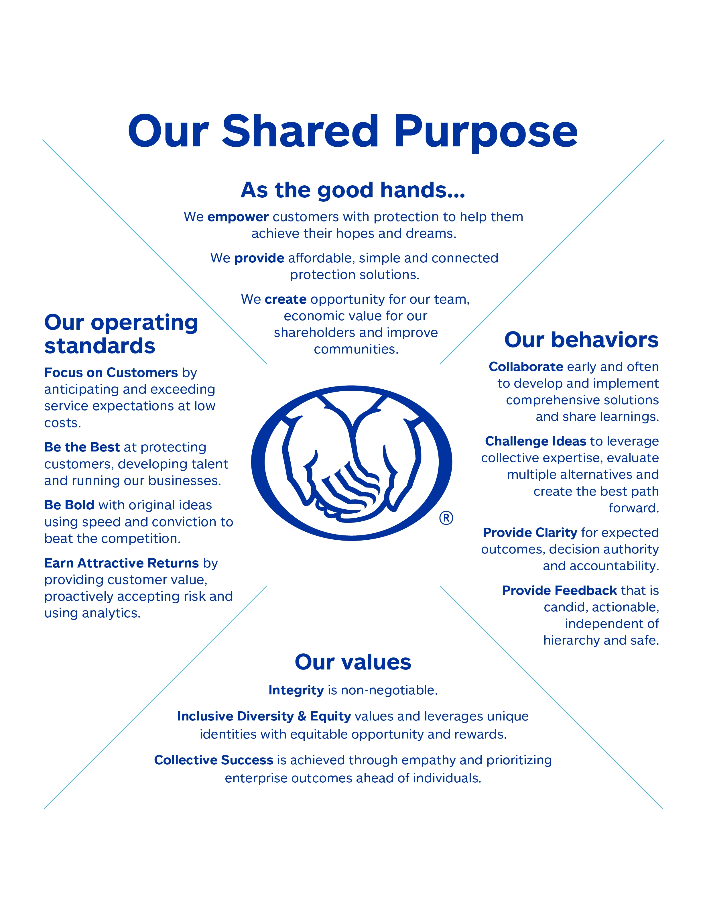 Our Shared Purpose has guided Allstate for 17 years by focusing on the customer. This creates value for shareholders, opportunity for the Allstate team and improves communities.