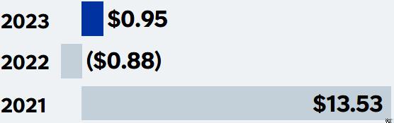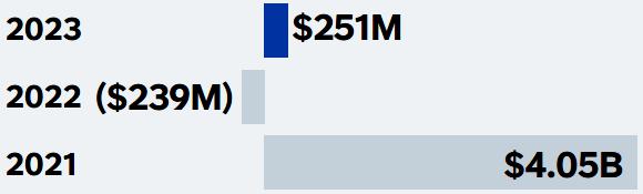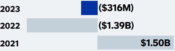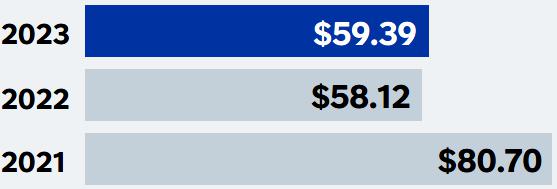 Revenues reached $57.1 billion, 11.1% higher than 2022, reflecting significant increases in average auto and home insurance premiums. Auto insurance profitability improved throughout the year which reduced the underwriting loss by $1.9 billion from 2022. Catastrophe losses, however, were 81% higher ($2.5 billion), resulting in an underwriting loss for 2023. Investment performance was strong with a 6.7% total return and $2.5 billion of net investment income. Health & Benefits and Protection Services businesses generated $348 million of Adjusted Net Income, which reduced the overall net loss to $316 million for the year. Adjusted Net Income*, which excludes some non-operating items, was $251 million for the year and the return on adjusted equity* of 1.5% was below our target of 14-17%.