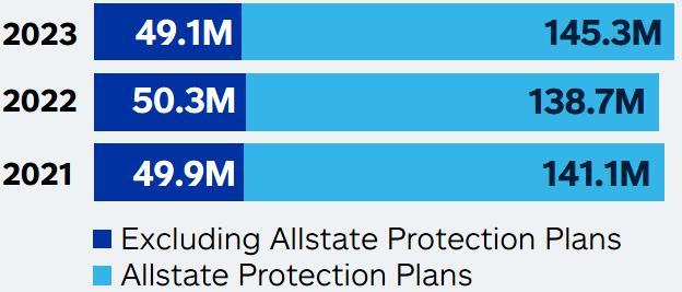 Total enterprise policies in force increased by 2.8% to 194 million as growth in homeowners insurance and protection plans offset a decline in auto insurance policies. Auto insurance policies declined from 26.0 million to 25.3 million reflecting rate increases. National General auto policies rose by 13.3% in 2023 due to increased volume from independent agencies. Homeowners insurance policies were up by 1.1% to 7.3 million despite rate increases of over 12% last year, highlighting the strength of Allstate's competitive position. Protection plans grew by 4.7% as international expansion offset slower growth through North American retailers.