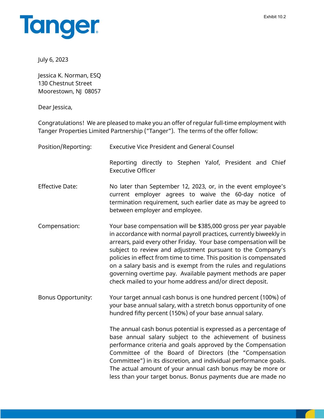 July 6, 2023 Jessica K. Norman, ESQ 130 Chestnut Street Moorestown, NJ 08057 Dear Jessica, Congratulations! We are pleased to make you an offer of regular full-time employment with Tanger Properties Limited Partnership (“Tanger”). The terms of the offer follow: Position/Reporting: Executive Vice President and General Counsel Reporting directly to Stephen Yalof, President and Chief Executive Officer Effective Date: No later than September 12, 2023, or, in the event employee’s current employer agrees to waive the 60-day notice of termination requirement, such earlier date as may be agreed to between employer and employee. Compensation: Your base compensation will be $385,000 gross per year payable in accordance with normal payroll practices, currently biweekly in arrears, paid every other Friday. Your base compensation will be subject to review and adjustment pursuant to the Company’s policies in effect from time to time. This position is compensated on a salary basis and is exempt from the rules and regulations governing overtime pay. Available payment methods are paper check mailed to your home address and/or direct deposit. Bonus Opportunity: Your target annual cash bonus is one hundred percent (100%) of your base annual salary, with a stretch bonus opportunity of one hundred fifty percent (150%) of your base annual salary. The annual cash bonus potential is expressed as a percentage of base annual salary subject to the achievement of business performance criteria and goals approved by the Compensation Committee of the Board of Directors (the “Compensation Committee”) in its discretion, and individual performance goals. The actual amount of your annual cash bonus may be more or less than your target bonus. Bonus payments due are made no Exhibit 10.2