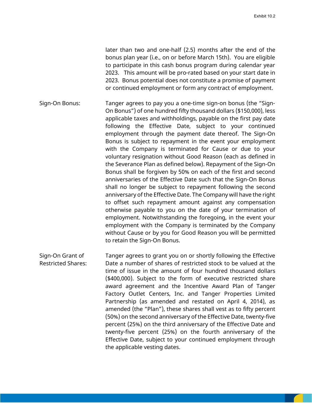 Sign-On Bonus: Sign-On Grant of Restricted Shares: later than two and one-half (2.5) months after the end of the bonus plan year (i.e., on or before March 15th). You are eligible to participate in this cash bonus program during calendar year 2023. This amount will be pro-rated based on your start date in 2023. Bonus potential does not constitute a promise of payment or continued employment or form any contract of employment. Tanger agrees to pay you a one-time sign-on bonus (the “Sign- On Bonus”) of one hundred fifty thousand dollars ($150,000), less applicable taxes and withholdings, payable on the first pay date following the Effective Date, subject to your continued employment through the payment date thereof. The Sign-On Bonus is subject to repayment in the event your employment with the Company is terminated for Cause or due to your voluntary resignation without Good Reason (each as defined in the Severance Plan as defined below). Repayment of the Sign-On Bonus shall be forgiven by 50% on each of the first and second anniversaries of the Effective Date such that the Sign-On Bonus shall no longer be subject to repayment following the second anniversary of the Effective Date. The Company will have the right to offset such repayment amount against any compensation otherwise payable to you on the date of your termination of employment. Notwithstanding the foregoing, in the event your employment with the Company is terminated by the Company without Cause or by you for Good Reason you will be permitted to retain the Sign-On Bonus. Tanger agrees to grant you on or shortly following the Effective Date a number of shares of restricted stock to be valued at the time of issue in the amount of four hundred thousand dollars ($400,000). Subject to the form of executive restricted share award agreement and the Incentive Award Plan of Tanger Factory Outlet Centers, Inc. and Tanger Properties Limited Partnership (as amended and restated on April 4, 2014), as amended (the “Plan”), these shares shall vest as to fifty percent (50%) on the second anniversary of the Effective Date, twenty-five percent (25%) on the third anniversary of the Effective Date and twenty-five percent (25%) on the fourth anniversary of the Effective Date, subject to your continued employment through the applicable vesting dates. Exhibit 10.2