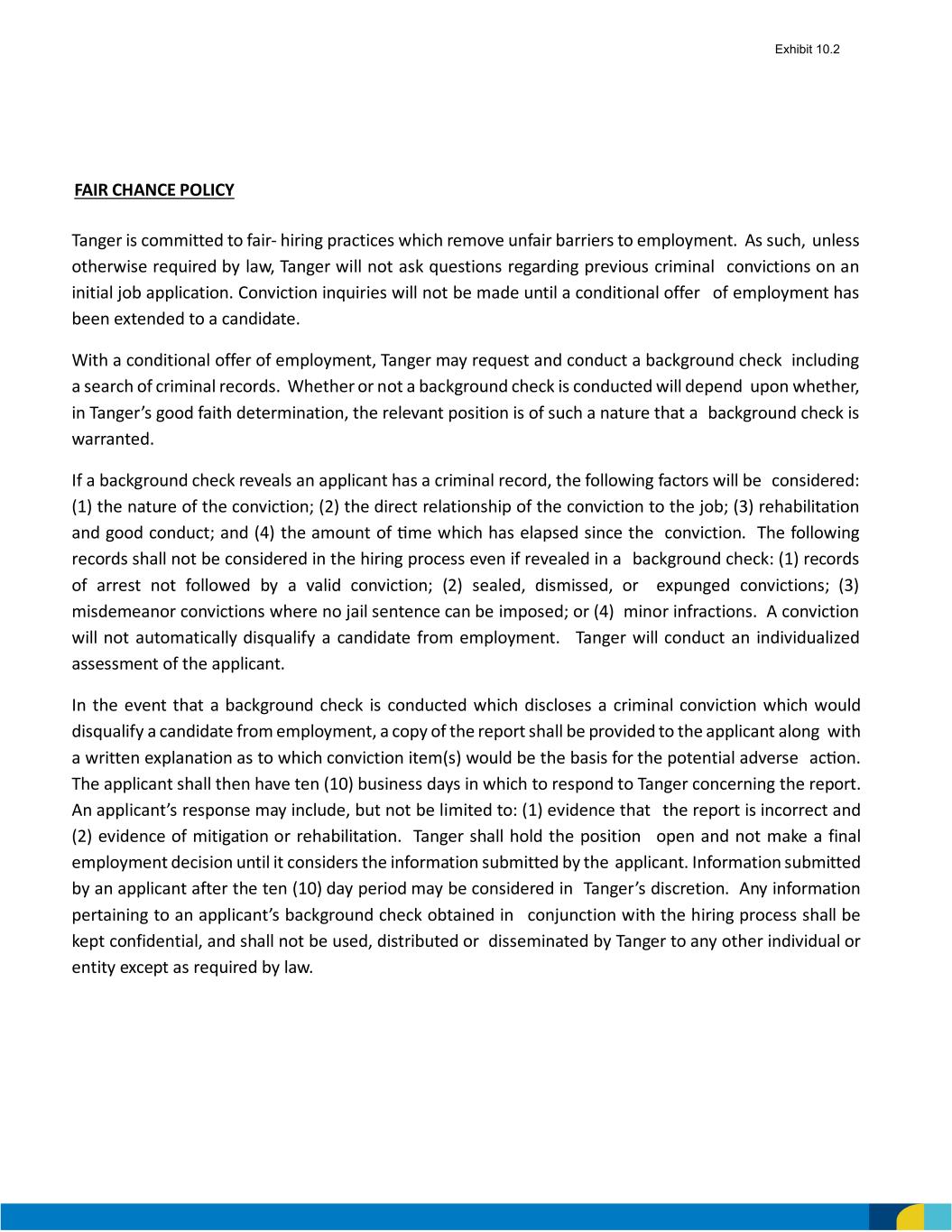 FAIR CHANCE POLICY Tanger is committed to fair- hiring practices which remove unfair barriers to employment. As such, unless otherwise required by law, Tanger will not ask questions regarding previous criminal convictions on an initial job application. Conviction inquiries will not be made until a conditional offer of employment has been extended to a candidate. With a conditional offer of employment, Tanger may request and conduct a background check including a search of criminal records. Whether or not a background check is conducted will depend upon whether, in Tanger’s good faith determination, the relevant position is of such a nature that a background check is warranted. If a background check reveals an applicant has a criminal record, the following factors will be considered: (1) the nature of the conviction; (2) the direct relationship of the conviction to the job; (3) rehabilitation and good conduct; and (4) the amount of �me which has elapsed since the conviction. The following records shall not be considered in the hiring process even if revealed in a background check: (1) records of arrest not followed by a valid conviction; (2) sealed, dismissed, or expunged convictions; (3) misdemeanor convictions where no jail sentence can be imposed; or (4) minor infractions. A conviction will not automatically disqualify a candidate from employment. Tanger will conduct an individualized assessment of the applicant. In the event that a background check is conducted which discloses a criminal conviction which would disqualify a candidate from employment, a copy of the report shall be provided to the applicant along with a written explanation as to which conviction item(s) would be the basis for the potential adverse ac�on. The applicant shall then have ten (10) business days in which to respond to Tanger concerning the report. An applicant’s response may include, but not be limited to: (1) evidence that the report is incorrect and (2) evidence of mitigation or rehabilitation. Tanger shall hold the position open and not make a final employment decision until it considers the information submitted by the applicant. Information submitted by an applicant after the ten (10) day period may be considered in Tanger’s discretion. Any information pertaining to an applicant’s background check obtained in conjunction with the hiring process shall be kept confidential, and shall not be used, distributed or disseminated by Tanger to any other individual or entity except as required by law. Exhibit 10.2