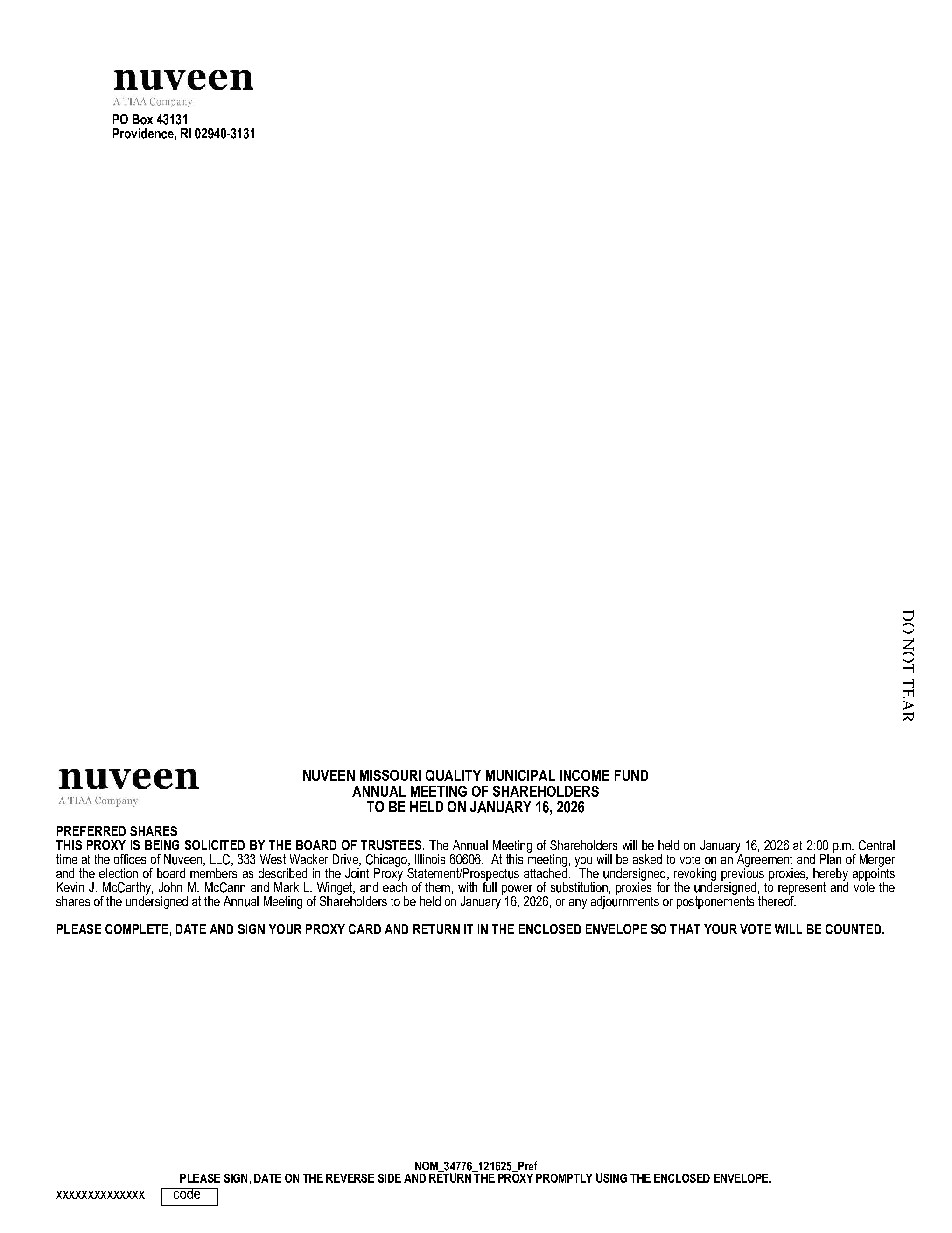 A.You are receiving the Joint Proxy Statement as a holder of Variable Rate Demand Preferred Shares (“VRDP Shares”) of Nuveen New Jersey Quality Municipal Income Fund (“New Jersey Municipal” or a “Target Fund”) or of Nuveen Pennsylvania Quality Municipal Income Fund (“Pennsylvania Municipal” or a “Target Fund”), or as a holder of MuniFund Preferred Shares (“MFP Shares”) of Nuveen Missouri Quality Municipal Income Fund (“Missouri Municipal” or a “Target Fund”, and together with New Jersey Municipal and Pennsylvania Municipal, the “Target Funds”) in connection with the solicitation of proxies by each Fund’s Board of Trustees (each, a “Board” and each Trustee, a “Board Member”) for use at the annual meetings of shareholders of New Jersey Municipal, Pennsylvania Municipal, and Missouri Municipal (each, a “Meeting” and together, the “Meetings”).