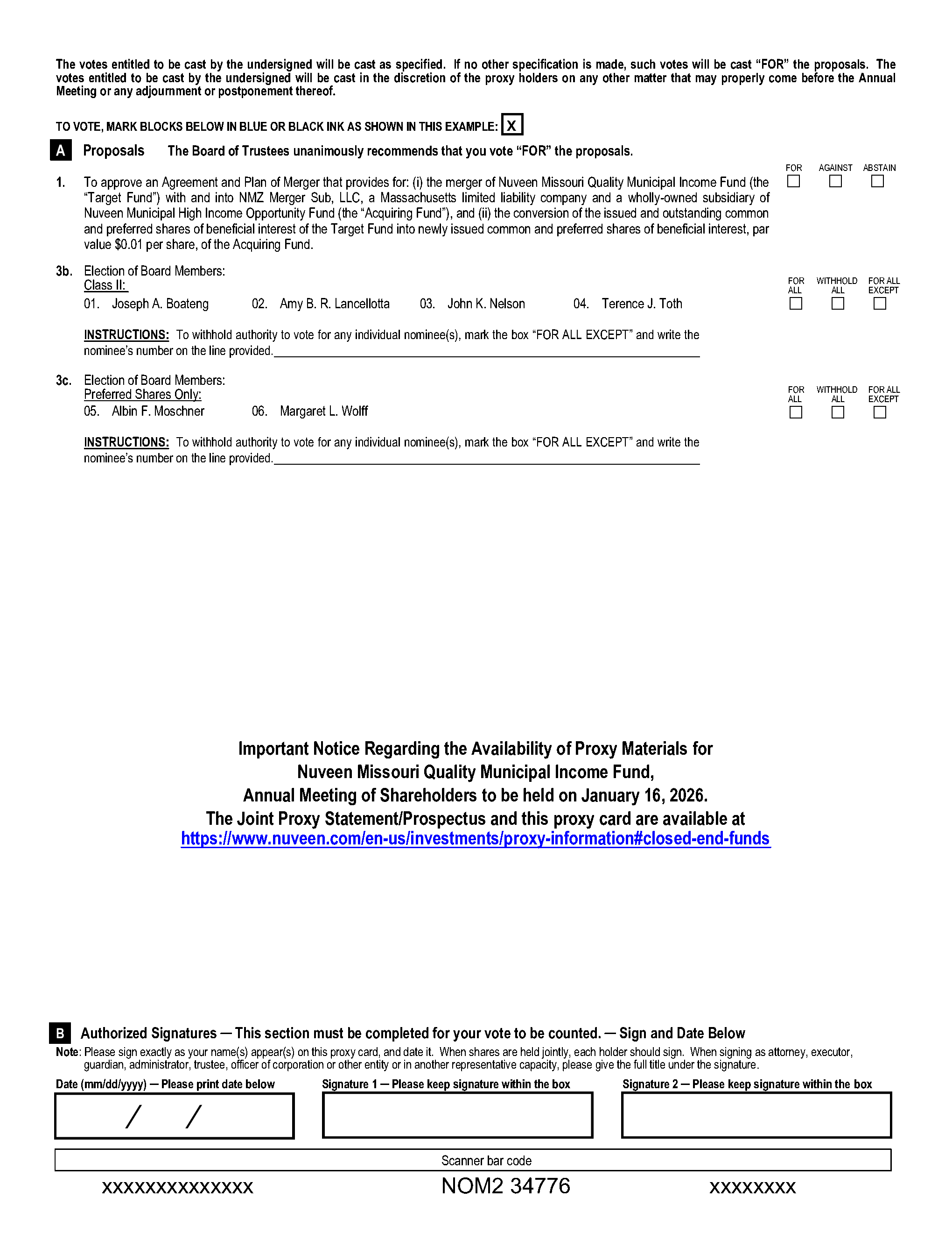 •To approve an Agreement and Plan of Merger (the “Agreement”) pursuant to which the proposed combination (each, a “Merger” and together, the “Mergers”) of the Target Fund and Nuveen Municipal High Income Opportunity Fund (the “Acquiring Fund,” and together with the Target Funds, the “Funds” or each individually, a “Fund”) will be effected; and