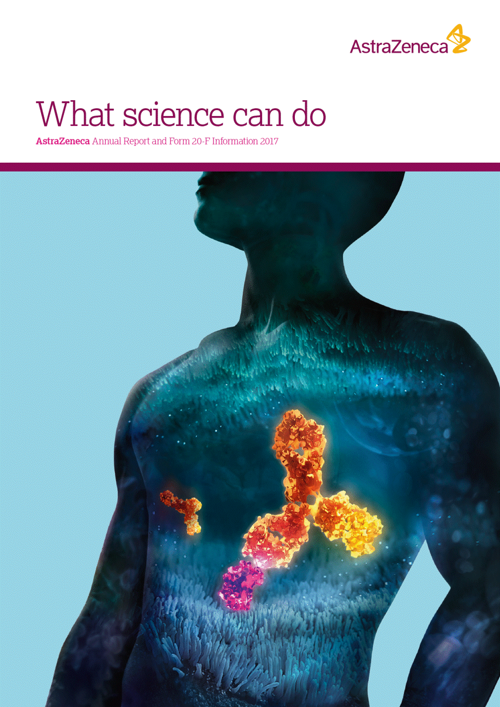 Welcome We are a global, science-led biopharmaceutical business and in this Annual Report we report on the progress we made in 2017 in pushing the boundaries of science to deliver life-changing medicines. Front cover and inside front cover image: Upstream intervention in the inflammatory cascade. Important information for readers of this Annual Report For more information in relation to the inclusion of Reported performance, Core financial measures and constant exchange rate (CER) growth rates as used in this Annual Report, please see the Financial Review on page 66. Directors’ Report The following sections make up the Directors’ Report, which has been prepared in accordance with the requirements of the Companies Act 2006: When lungs are stressed by allergens, pathogens or irritants, epithelial cells produce cytokines that trigger multiple downstream inflammatory pathways in the lungs. AstraZeneca is researching antibodies that bind to these upstream epithelial cytokines to prevent a range of inflammatory responses. > > > > > > Chairman’s Statement Chief Executive Officer’s Review Business Review Therapy Area Review Financial Review: Financial risk management Corporate Governance: including the Audit Committee Report and Corporate Governance Report Directors’ Responsibility Statement Development Pipeline Sustainability: supplementary information Shareholder Information Definitions The Glossary and the Market definitions table from page 235 are intended to provide a useful guide to terms and AstraZeneca’s definitions of markets, as well as to acronyms and abbreviations, used in this Annual Report. > > > > Use of terms In this Annual Report, unless the context otherwise requires, ‘AstraZeneca’, ‘the Group’, ‘we’, ‘us’ and ‘our’ refer to AstraZeneca PLC and its consolidated entities. Strategic Report The following sections make up the Strategic Report, which has been prepared in accordance with the requirements of the Companies Act 2006: Cautionary statement regarding forward-looking statements A cautionary statement regarding forward-looking statements and other essential information relating to this Annual Report can be found on page 240. > > > > > > > > > > AstraZeneca at a glance Chairman’s Statement Chief Executive Officer’s Review Marketplace Business model and life-cycle of a medicine Strategy and Key Performance Indicators Business Review Therapy Area Review Risk Overview Financial Review can Science Expand treatment options Oncology | From page 48 Understand disease Cardiovascular & Metabolic Diseases | From page 52 Transform outcomes Respiratory | From page 56