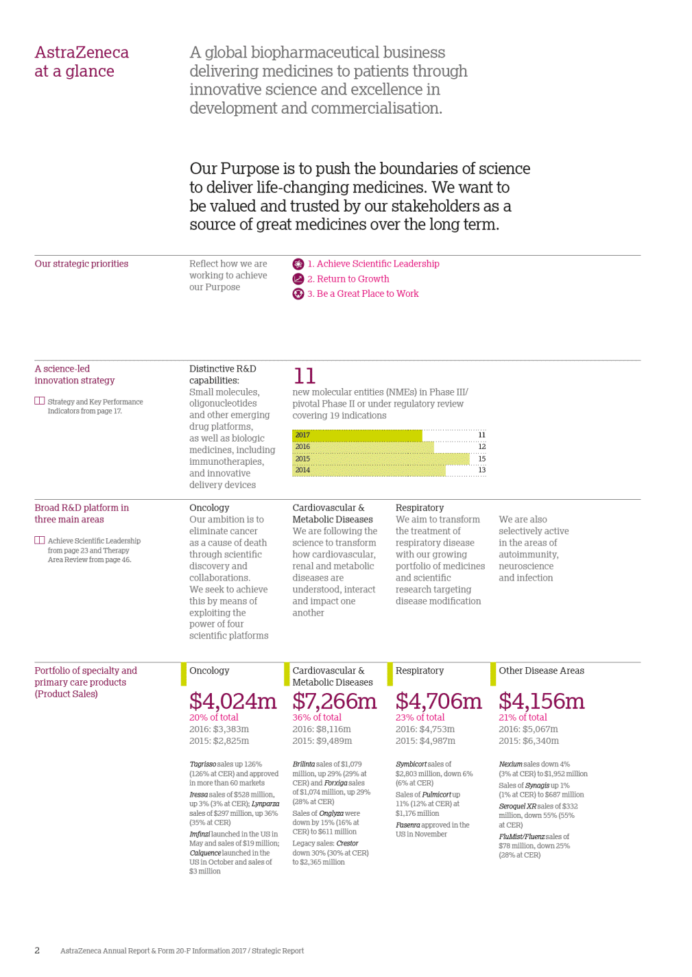 AstraZeneca at a glance A global biopharmaceutical business delivering medicines to patients through innovative science and excellence in development and commercialisation. Our Purpose is to push the boundaries of science to deliver life-changing medicines. We want to be valued and trusted by our stakeholders as a source of great medicines over the long term. Our strategic priorities Reflect how we are working to achieve our Purpose 1. Achieve Scientific Leadership 2. Return to Growth 3. Be a Great Place to Work A science-led innovation strategy Distinctive R&D capabilities: Small molecules, oligonucleotides and other emerging drug platforms, as well as biologic medicines, including immunotherapies, and innovative delivery devices 11 new molecular entities (NMEs) in Phase III/ pivotal Phase II or under regulatory review covering 19 indications Strategy and Key Performance Indicators from page 17. Broad R&D platform in three main areas Oncology Our ambition is to eliminate cancer as a cause of death through scientific discovery and collaborations. We seek to achieve this by means of exploiting the power of four scientific platforms Cardiovascular & Metabolic Diseases We are following the science to transform how cardiovascular, renal and metabolic diseases are understood, interact and impact one another Respiratory We aim to transform the treatment of respiratory disease with our growing portfolio of medicines and scientific research targeting disease modification We are also selectively active in the areas of autoimmunity, neuroscience and infection Achieve Scientific Leadership from page 23 and Therapy Area Review from page 46. (Product Sales) $4,024m 20% of total 2016: $3,383m 2015: $2,825m $7,266m 36% of total 2016: $8,116m 2015: $9,489m $4,706m 23% of total 2016: $4,753m 2015: $4,987m $4,156m 21% of total 2016: $5,067m 2015: $6,340m Tagrisso sales up 126% (126% at CER) and approved in more than 60 markets Iressa sales of $528 million, up 3% (3% at CER); Lynparza sales of $297 million, up 36% (35% at CER) Imfinzi launched in the US in May and sales of $19 million; Calquence launched in the US in October and sales of $3 million Brilinta sales of $1,079 million, up 29% (29% at CER) and Forxiga sales of $1,074 million, up 29% (28% at CER) Sales of Onglyza were down by 15% (16% at CER) to $611 million Legacy sales: Crestor down 30% (30% at CER) to $2,365 million Symbicort sales of $2,803 million, down 6% (6% at CER) Sales of Pulmicort up 11% (12% at CER) at $1,176 million Fasenra approved in the US in November Nexium sales down 4% (3% at CER) to $1,952 million Sales of Synagis up 1% (1% at CER) to $687 million Seroquel XR sales of $332 million, down 55% (55% at CER) FluMist/Fluenz sales of $78 million, down 25% (28% at CER) 2 AstraZeneca Annual Report & Form 20-F Information 2017 / Strategic Report Portfolio of specialty and primary care products Oncology Cardiovascular & Metabolic Diseases Respiratory Other Disease Areas 2017 11 2016 12 2015 15 2014 13