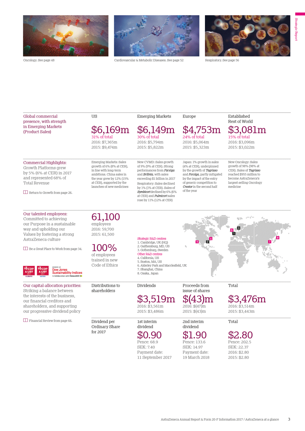 Oncology. See page 48 Cardiovascular & Metabolic Diseases. See page 52 Respiratory. See page 56 Global commercial presence, with strength in Emerging Markets (Product Sales) US Emerging Markets Europe Established Rest of World $3,081m 15% of total 2016: $3,096m 2015: $3,022m $6,169m 31% of total 2016: $7,365m 2015: $9,474m $6,149m 30% of total 2016: $5,794m 2015: $5,822m $4,753m 24% of total 2016: $5,064m 2015: $5,323m Commercial Highlights: Growth Platforms grew by 5% (6% at CER) in 2017 and represented 68% of Total Revenue Emerging Markets: Sales growth of 6% (8% at CER), in line with long-term ambitions. China sales in the year grew by 12% (15% at CER), supported by the launches of new medicines New CVMD: Sales growth of 9% (9% at CER). Strong performances from Farxiga and Brilinta, with sales exceeding $1 billion in 2017 Respiratory: Sales declined by 1% (1% at CER). Sales of Symbicort declined by 6% (6% at CER) and Pulmicort sales rose by 11% (12% at CER) Japan: 1% growth in sales (4% at CER), underpinned by the growth of Tagrisso and Forxiga, partly mitigated by the impact of the entry of generic competition to Crestor in the second half of the year New Oncology: Sales growth of 98% (98% at CER). Sales of Tagrisso reached $955 million to become AstraZeneca’s largest-selling Oncology medicine Return to Growth from page 26. Our talented employees: Committed to achieving our Purpose in a sustainable way and upholding our Values by fostering a strong AstraZeneca culture 61,100 employees 2016: 59,700 2015: 61,500 3 6 1 8 Strategic R&D centres 1. Cambridge, UK (HQ) 2. Gaithersburg, MD, US 3. Gothenburg, Sweden Other R&D centres 4. California, US 5. Boston, MA, US 5 4 2 7 100% of employees trained in new Code of Ethics Be a Great Place to Work from page 34. 6. Alderley Park and Macclesfield, UK 7. Shanghai, China 8. Osaka, Japan Our capital-allocation priorities: Striking a balance between the interests of the business, our financial creditors and shareholders, and supporting our progressive dividend policy Distributions to shareholders Dividends Proceeds from issue of shares $(43)m 2016: $(47)m 2015: $(43)m Total $3,519m 2016: $3,561m 2015: $3,486m $3,476m 2016: $3,514m 2015: $3,443m Financial Review from page 66. Dividend per Ordinary Share for 2017 1st interim dividend 2nd interim dividend Total $0.90 Pence: 68.9 SEK: 7.40 Payment date: 11 September 2017 $1.90 Pence: 133.6 SEK: 14.97 Payment date: 19 March 2018 $2.80 Pence: 202.5 SEK: 22.37 2016: $2.80 2015: $2.80 3 AstraZeneca Annual Report & Form 20-F Information 2017 / AstraZeneca at a glance Strategic Report