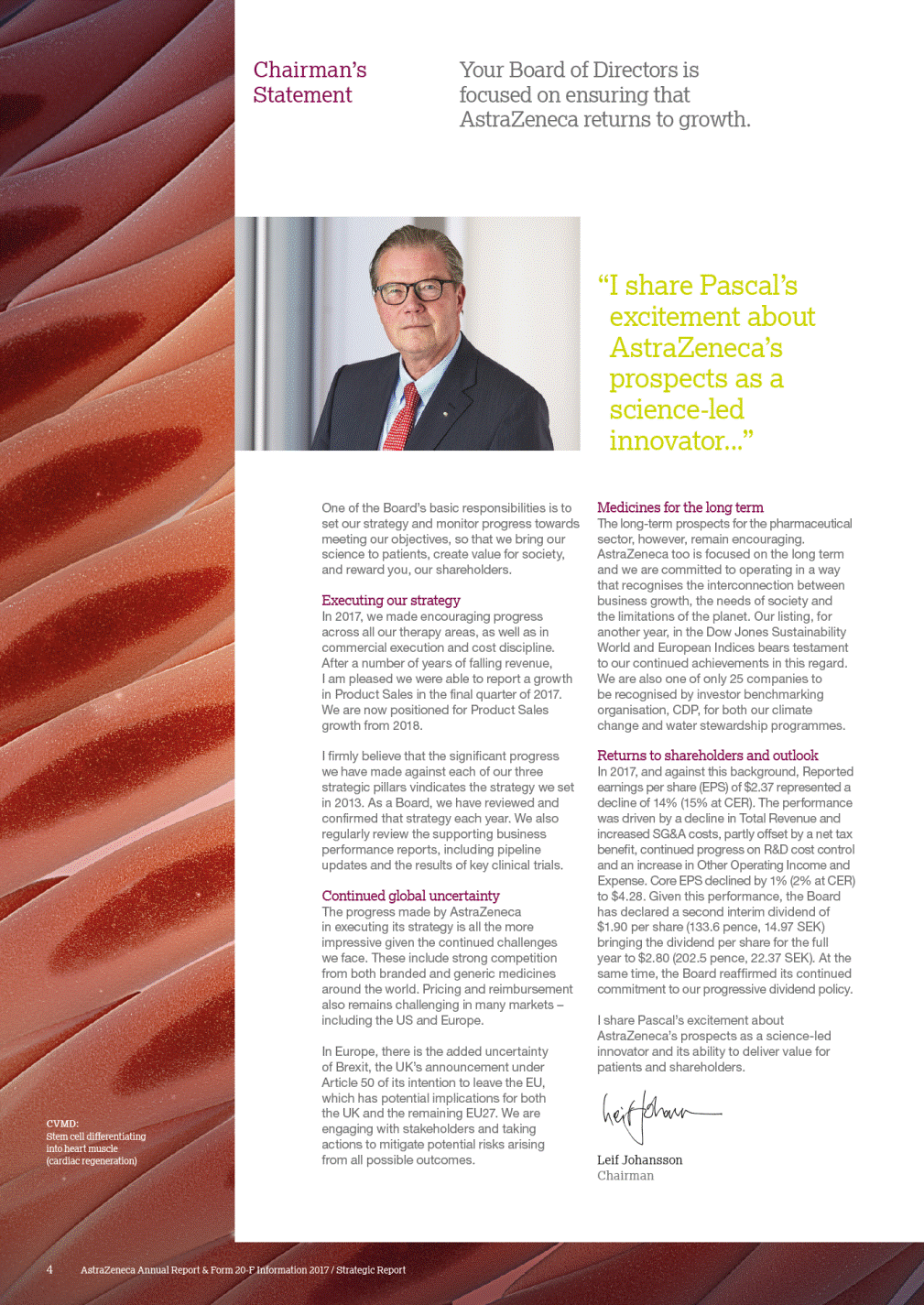 Chairman’s Statement Your Board of Directors is focused on ensuring that AstraZeneca returns to growth. “I share Pascal’s excitement about AstraZeneca’s prospects as a science-led innovator...” Medicines for the long term The long-term prospects for the pharmaceutical sector, however, remain encouraging. AstraZeneca too is focused on the long term and we are committed to operating in a way that recognises the interconnection between business growth, the needs of society and the limitations of the planet. Our listing, for another year, in the Dow Jones Sustainability World and European Indices bears testament to our continued achievements in this regard. We are also one of only 25 companies to be recognised by investor benchmarking organisation, CDP, for both our climate change and water stewardship programmes. One of the Board’s basic responsibilities is to set our strategy and monitor progress towards meeting our objectives, so that we bring our science to patients, create value for society, and reward you, our shareholders. Executing our strategy In 2017, we made encouraging progress across all our therapy areas, as well as in commercial execution and cost discipline. After a number of years of falling revenue, I am pleased we were able to report a growth in Product Sales in the final quarter of 2017. We are now positioned for Product Sales growth from 2018. Returns to shareholders and outlook In 2017, and against this background, Reported earnings per share (EPS) of $2.37 represented a decline of 14% (15% at CER). The performance was driven by a decline in Total Revenue and increased SG&A costs, partly offset by a net tax benefit, continued progress on R&D cost control and an increase in Other Operating Income and Expense. Core EPS declined by 1% (2% at CER) to $4.28. Given this performance, the Board has declared a second interim dividend of $1.90 per share (133.6 pence, 14.97 SEK) bringing the dividend per share for the full year to $2.80 (202.5 pence, 22.37 SEK). At the same time, the Board reaffirmed its continued commitment to our progressive dividend policy. I firmly believe that the significant progress we have made against each of our three strategic pillars vindicates the strategy we set in 2013. As a Board, we have reviewed and confirmed that strategy each year. We also regularly review the supporting business performance reports, including pipeline updates and the results of key clinical trials. Continued global uncertainty The progress made by AstraZeneca in executing its strategy is all the more impressive given the continued challenges we face. These include strong competition from both branded and generic medicines around the world. Pricing and reimbursement also remains challenging in many markets – including the US and Europe. I share Pascal’s excitement about AstraZeneca’s prospects as a science-led innovator and its ability to deliver value for patients and shareholders. In Europe, there is the added uncertainty of Brexit, the UK’s announcement under Article 50 of its intention to leave the EU, which has potential implications for both the UK and the remaining EU27. We are engaging with stakeholders and taking actions to mitigate potential risks arising from all possible outcomes. CVMD: Stem cell differentiating into heart muscle (cardiac regeneration) Leif Johansson Chairman 4 AstraZeneca Annual Report & Form 20-F Information 2017 / Strategic Report