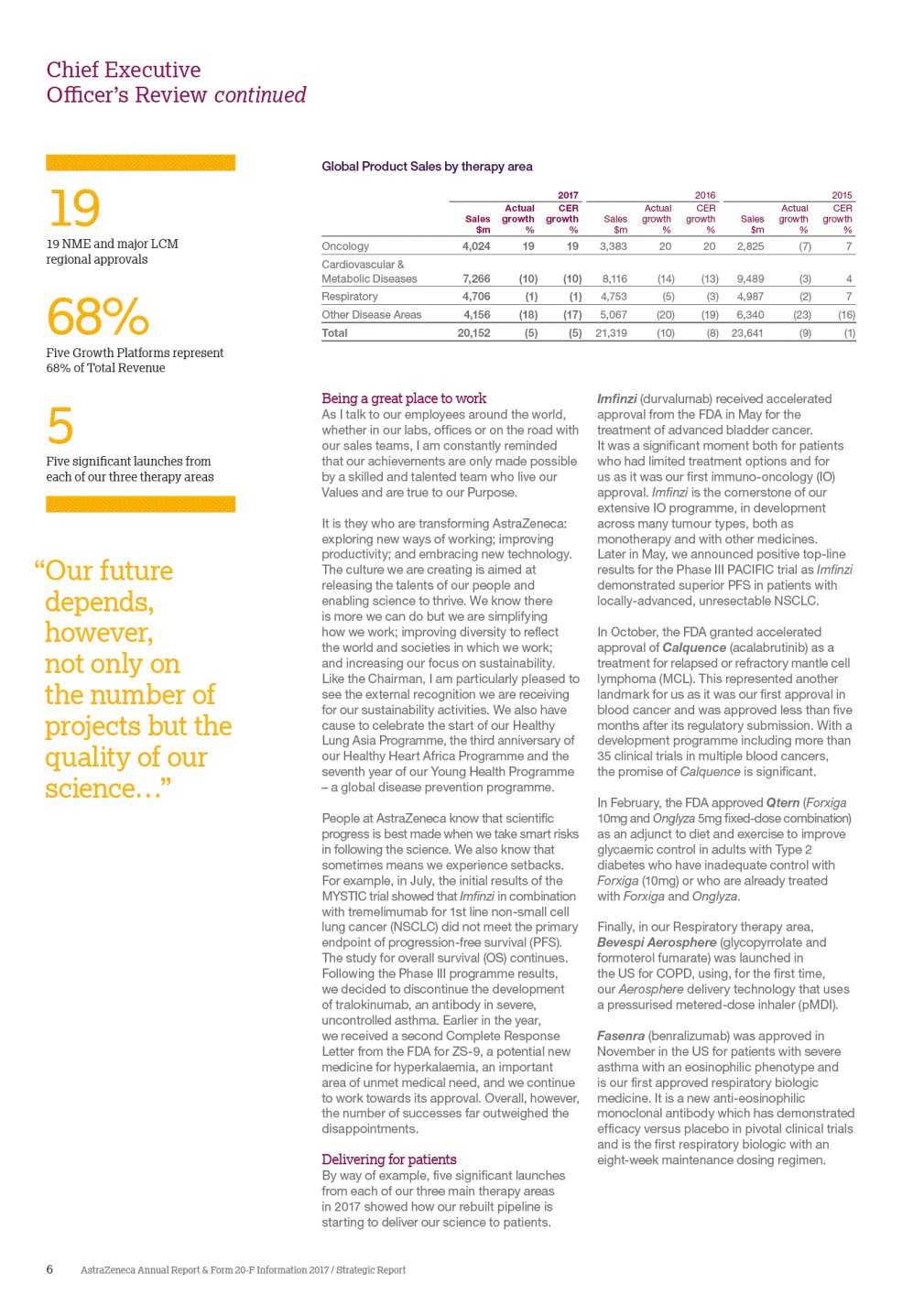 Chief Executive Officer’s Review continued Global Product Sales by therapy area 19 19 NME and major LCM regional approvals 2017 2016 2015 Actual growth % CER growth % Actual growth % CER growth % Actual growth % CER growth % Sales $m Sales $m Sales $m Oncology 4,024 19 19 3,383 20 20 2,825 (7) 7 Cardiovascular & Metabolic Diseases 7,266 (10) (10) 8,116 (14) (13) 9,489 (3) 4 68% Five Growth Platforms represent 68% of Total Revenue Respiratory 4,706 (1) (1) 4,753 (5) (3) 4,987 (2) 7 Other Disease Areas 4,156 (18) (17) 5,067 (20) (19) 6,340 (23) (16) Total 20,152 (5) (5) 21,319 (10) (8) 23,641 (9) (1) Being a great place to work As I talk to our employees around the world, whether in our labs, offices or on the road with our sales teams, I am constantly reminded that our achievements are only made possible by a skilled and talented team who live our Values and are true to our Purpose. Imfinzi (durvalumab) received accelerated approval from the FDA in May for the treatment of advanced bladder cancer. It was a significant moment both for patients who had limited treatment options and for us as it was our first immuno-oncology (IO) approval. Imfinzi is the cornerstone of our extensive IO programme, in development across many tumour types, both as monotherapy and with other medicines. Later in May, we announced positive top-line results for the Phase III PACIFIC trial as Imfinzi demonstrated superior PFS in patients with locally-advanced, unresectable NSCLC. 5 Five significant launches from each of our three therapy areas It is they who are transforming AstraZeneca: exploring new ways of working; improving productivity; and embracing new technology. The culture we are creating is aimed at releasing the talents of our people and enabling science to thrive. We know there is more we can do but we are simplifying how we work; improving diversity to reflect the world and societies in which we work; and increasing our focus on sustainability. Like the Chairman, I am particularly pleased to see the external recognition we are receiving for our sustainability activities. We also have cause to celebrate the start of our Healthy Lung Asia Programme, the third anniversary of our Healthy Heart Africa Programme and the seventh year of our Young Health Programme – a global disease prevention programme. “Our future depends, however, not only on the number of projects but the quality of our science…” In October, the FDA granted accelerated approval of Calquence (acalabrutinib) as a treatment for relapsed or refractory mantle cell lymphoma (MCL). This represented another landmark for us as it was our first approval in blood cancer and was approved less than five months after its regulatory submission. With a development programme including more than 35 clinical trials in multiple blood cancers, the promise of Calquence is significant. In February, the FDA approved Qtern (Forxiga 10mg and Onglyza 5mg fixed-dose combination) as an adjunct to diet and exercise to improve glycaemic control in adults with Type 2 diabetes who have inadequate control with Forxiga (10mg) or who are already treated with Forxiga and Onglyza. People at AstraZeneca know that scientific progress is best made when we take smart risks in following the science. We also know that sometimes means we experience setbacks. For example, in July, the initial results of the MYSTIC trial showed that Imfinzi in combination with tremelimumab for 1st line non-small cell lung cancer (NSCLC) did not meet the primary endpoint of progression-free survival (PFS). The study for overall survival (OS) continues. Following the Phase III programme results, we decided to discontinue the development of tralokinumab, an antibody in severe, uncontrolled asthma. Earlier in the year, we received a second Complete Response Letter from the FDA for ZS-9, a potential new medicine for hyperkalaemia, an important area of unmet medical need, and we continue to work towards its approval. Overall, however, the number of successes far outweighed the disappointments. Finally, in our Respiratory therapy area, Bevespi Aerosphere (glycopyrrolate and formoterol fumarate) was launched in the US for COPD, using, for the first time, our Aerosphere delivery technology that uses a pressurised metered-dose inhaler (pMDI). Fasenra (benralizumab) was approved in November in the US for patients with severe asthma with an eosinophilic phenotype and is our first approved respiratory biologic medicine. It is a new anti-eosinophilic monoclonal antibody which has demonstrated efficacy versus placebo in pivotal clinical trials and is the first respiratory biologic with an eight-week maintenance dosing regimen. Delivering for patients By way of example, five significant launches from each of our three main therapy areas in 2017 showed how our rebuilt pipeline is starting to deliver our science to patients. 6 AstraZeneca Annual Report & Form 20-F Information 2017 / Strategic Report