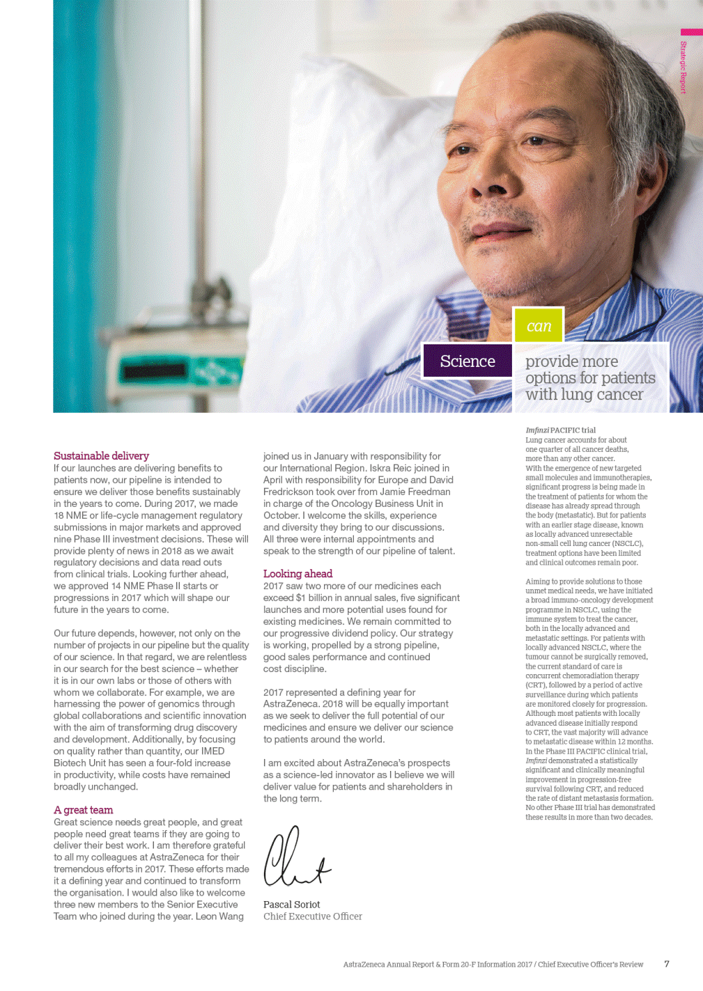 de more options for patients with lung cancer Imfinzi PACIFIC trial Lung cancer accounts for about one quarter of all cancer deaths, more than any other cancer. With the emergence of new targeted small molecules and immunotherapies, significant progress is being made in the treatment of patients for whom the disease has already spread through the body (metastatic). But for patients with an earlier stage disease, known as locally advanced unresectable non-small cell lung cancer (NSCLC), treatment options have been limited and clinical outcomes remain poor. Sustainable delivery If our launches are delivering benefits to patients now, our pipeline is intended to ensure we deliver those benefits sustainably in the years to come. During 2017, we made 18 NME or life-cycle management regulatory submissions in major markets and approved nine Phase III investment decisions. These will provide plenty of news in 2018 as we await regulatory decisions and data read outs from clinical trials. Looking further ahead, we approved 14 NME Phase II starts or progressions in 2017 which will shape our future in the years to come. joined us in January with responsibility for our International Region. Iskra Reic joined in April with responsibility for Europe and David Fredrickson took over from Jamie Freedman in charge of the Oncology Business Unit in October. I welcome the skills, experience and diversity they bring to our discussions. All three were internal appointments and speak to the strength of our pipeline of talent. Looking ahead 2017 saw two more of our medicines each exceed $1 billion in annual sales, five significant launches and more potential uses found for existing medicines. We remain committed to our progressive dividend policy. Our strategy is working, propelled by a strong pipeline, good sales performance and continued cost discipline. Aiming to provide solutions to those unmet medical needs, we have initiated a broad immuno-oncology development programme in NSCLC, using the immune system to treat the cancer, both in the locally advanced and metastatic settings. For patients with locally advanced NSCLC, where the tumour cannot be surgically removed, the current standard of care is concurrent chemoradiation therapy (CRT), followed by a period of active surveillance during which patients are monitored closely for progression. Although most patients with locally advanced disease initially respond to CRT, the vast majority will advance to metastatic disease within 12 months. In the Phase III PACIFIC clinical trial, Imfinzi demonstrated a statistically significant and clinically meaningful improvement in progression-free survival following CRT, and reduced the rate of distant metastasis formation. No other Phase III trial has demonstrated these results in more than two decades. Our future depends, however, not only on the number of projects in our pipeline but the quality of our science. In that regard, we are relentless in our search for the best science – whether it is in our own labs or those of others with whom we collaborate. For example, we are harnessing the power of genomics through global collaborations and scientific innovation with the aim of transforming drug discovery and development. Additionally, by focusing on quality rather than quantity, our IMED Biotech Unit has seen a four-fold increase in productivity, while costs have remained broadly unchanged. 2017 represented a defining year for AstraZeneca. 2018 will be equally important as we seek to deliver the full potential of our medicines and ensure we deliver our science to patients around the world. I am excited about AstraZeneca’s prospects as a science-led innovator as I believe we will deliver value for patients and shareholders in the long term. A great team Great science needs great people, and great people need great teams if they are going to deliver their best work. I am therefore grateful to all my colleagues at AstraZeneca for their tremendous efforts in 2017. These efforts made it a defining year and continued to transform the organisation. I would also like to welcome three new members to the Senior Executive Team who joined during the year. Leon Wang Pascal Soriot Chief Executive Officer 7 AstraZeneca Annual Report & Form 20-F Information 2017 / Chief Executive Officer’s Review Strategic Report can Science provi