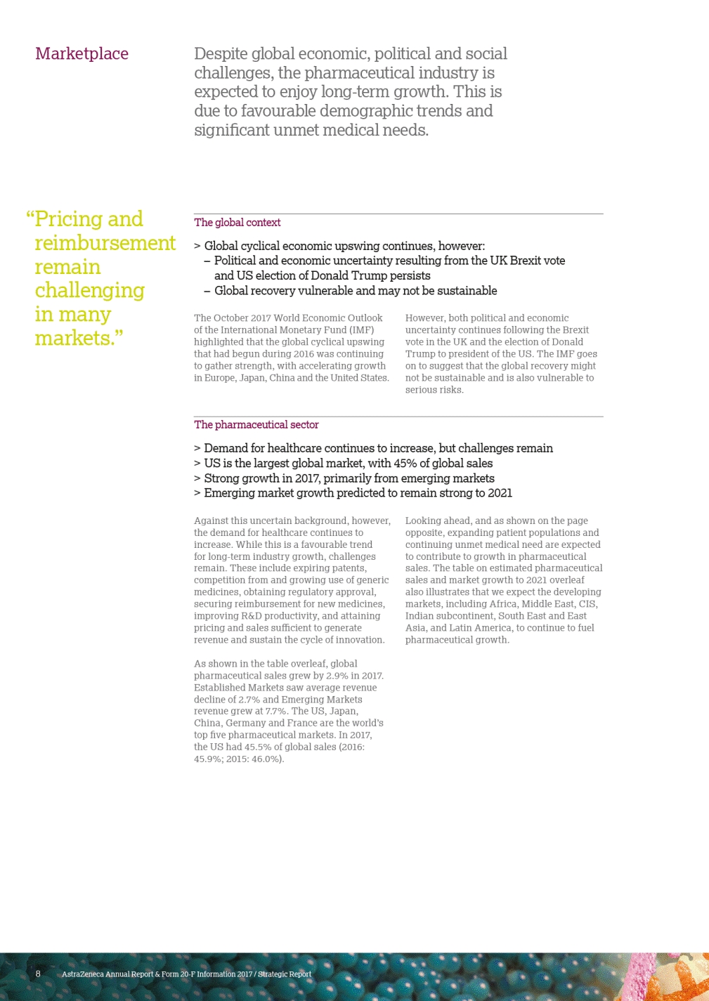 Marketplace Despite global economic, political and social challenges, the pharmaceutical industry is expected to enjoy long-term growth. This is due to favourable demographic trends and significant unmet medical needs. “Pricing and reimbursement remain challenging in many markets.” The global context > Global cyclical economic upswing continues, however: – Political and economic uncertainty resulting from the UK Brexit vote and US election of Donald Trump persists – Global recovery vulnerable and may not be sustainable The October 2017 World Economic Outlook of the International Monetary Fund (IMF) highlighted that the global cyclical upswing that had begun during 2016 was continuing to gather strength, with accelerating growth in Europe, Japan, China and the United States. However, both political and economic uncertainty continues following the Brexit vote in the UK and the election of Donald Trump to president of the US. The IMF goes on to suggest that the global recovery might not be sustainable and is also vulnerable to serious risks. The pharmaceutical sector > Demand for healthcare continues to increase, but challenges remain > US is the largest global market, with 45% of global sales > Strong growth in 2017, primarily from emerging markets > Emerging market growth predicted to remain strong to 2021 Against this uncertain background, however, the demand for healthcare continues to increase. While this is a favourable trend for long-term industry growth, challenges remain. These include expiring patents, competition from and growing use of generic medicines, obtaining regulatory approval, securing reimbursement for new medicines, improving R&D productivity, and attaining pricing and sales sufficient to generate revenue and sustain the cycle of innovation. Looking ahead, and as shown on the page opposite, expanding patient populations and continuing unmet medical need are expected to contribute to growth in pharmaceutical sales. The table on estimated pharmaceutical sales and market growth to 2021 overleaf also illustrates that we expect the developing markets, including Africa, Middle East, CIS, Indian subcontinent, South East and East Asia, and Latin America, to continue to fuel pharmaceutical growth. As shown in the table overleaf, global pharmaceutical sales grew by 2.9% in 2017. Established Markets saw average revenue decline of 2.7% and Emerging Markets revenue grew at 7.7%. The US, Japan, China, Germany and France are the world’s top five pharmaceutical markets. In 2017, the US had 45.5% of global sales (2016: 45.9%; 2015: 46.0%). 8 AstraZeneca Annual Report & Form 20-F Information 2017 / Strategic Report