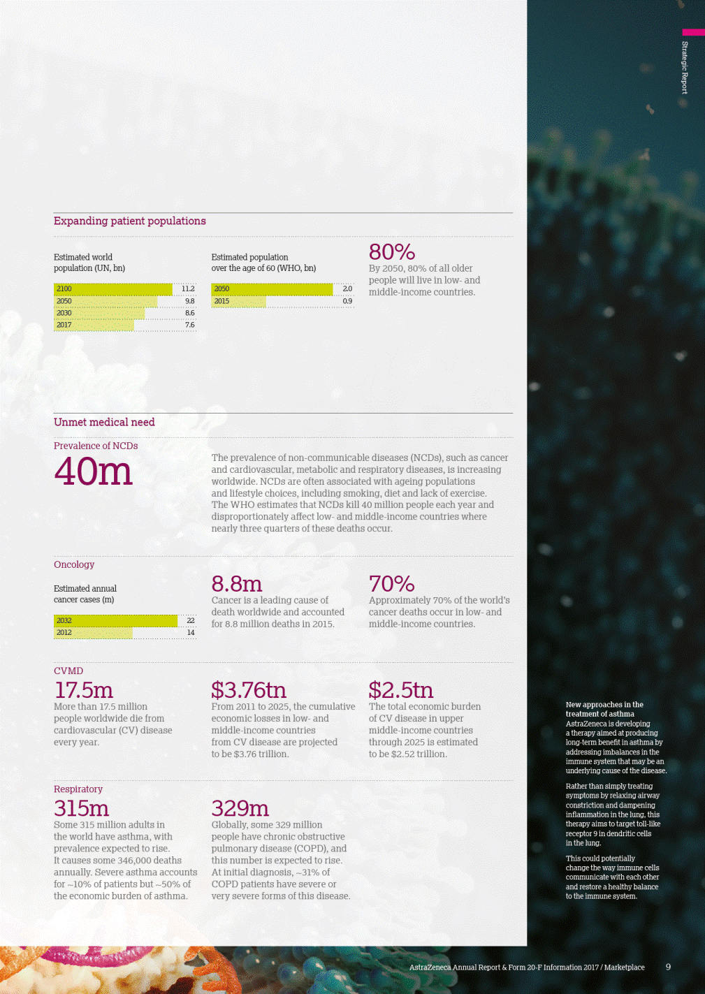 Expanding patient populations 80% By 2050, 80% of all older people will live in low-and middle-income countries. Estimated world population (UN, bn) Estimated population over the age of 60 (WHO, bn) Unmet medical need Prevalence of NCDs 40m The prevalence of non-communicable diseases (NCDs), such as cancer and cardiovascular, metabolic and respiratory diseases, is increasing worldwide. NCDs are often associated with ageing populations and lifestyle choices, including smoking, diet and lack of exercise. The WHO estimates that NCDs kill 40 million people each year and disproportionately affect low-and middle-income countries where nearly three quarters of these deaths occur. Oncology 8.8m Cancer is a leading cause of death worldwide and accounted for 8.8 million deaths in 2015. 70% Approximately 70% of the world’s cancer deaths occur in low-and middle-income countries. Estimated annual cancer cases (m) CVMD 17.5m More than 17.5 million people worldwide die from cardiovascular (CV) disease every year. $3.76tn From 2011 to 2025, the cumulative economic losses in low-and middle-income countries from CV disease are projected to be $3.76 trillion. $2.5tn The total economic burden of CV disease in upper middle-income countries through 2025 is estimated to be $2.52 trillion. New approaches in the treatment of asthma AstraZeneca is developing a therapy aimed at producing long-term benefit in asthma by addressing imbalances in the immune system that may be an underlying cause of the disease. Rather than simply treating symptoms by relaxing airway constriction and dampening inflammation in the lung, this therapy aims to target toll-like receptor 9 in dendritic cells in the lung. Respiratory 315m Some 315 million adults in the world have asthma, with prevalence expected to rise. It causes some 346,000 deaths annually. Severe asthma accounts for ~10% of patients but ~50% of the economic burden of asthma. 329m Globally, some 329 million people have chronic obstructive pulmonary disease (COPD), and this number is expected to rise. At initial diagnosis, ~31% of COPD patients have severe or very severe forms of this disease. This could potentially change the way immune cells communicate with each other and restore a healthy balance to the immune system. 9 AstraZeneca Annual Report & Form 20-F Information 2017 / Marketplace Strategic Report 2032 22 2012 14 2050 2.0 2015 0.9 2100 11.2 2050 9.8 2030 8.6 2017 7.6
