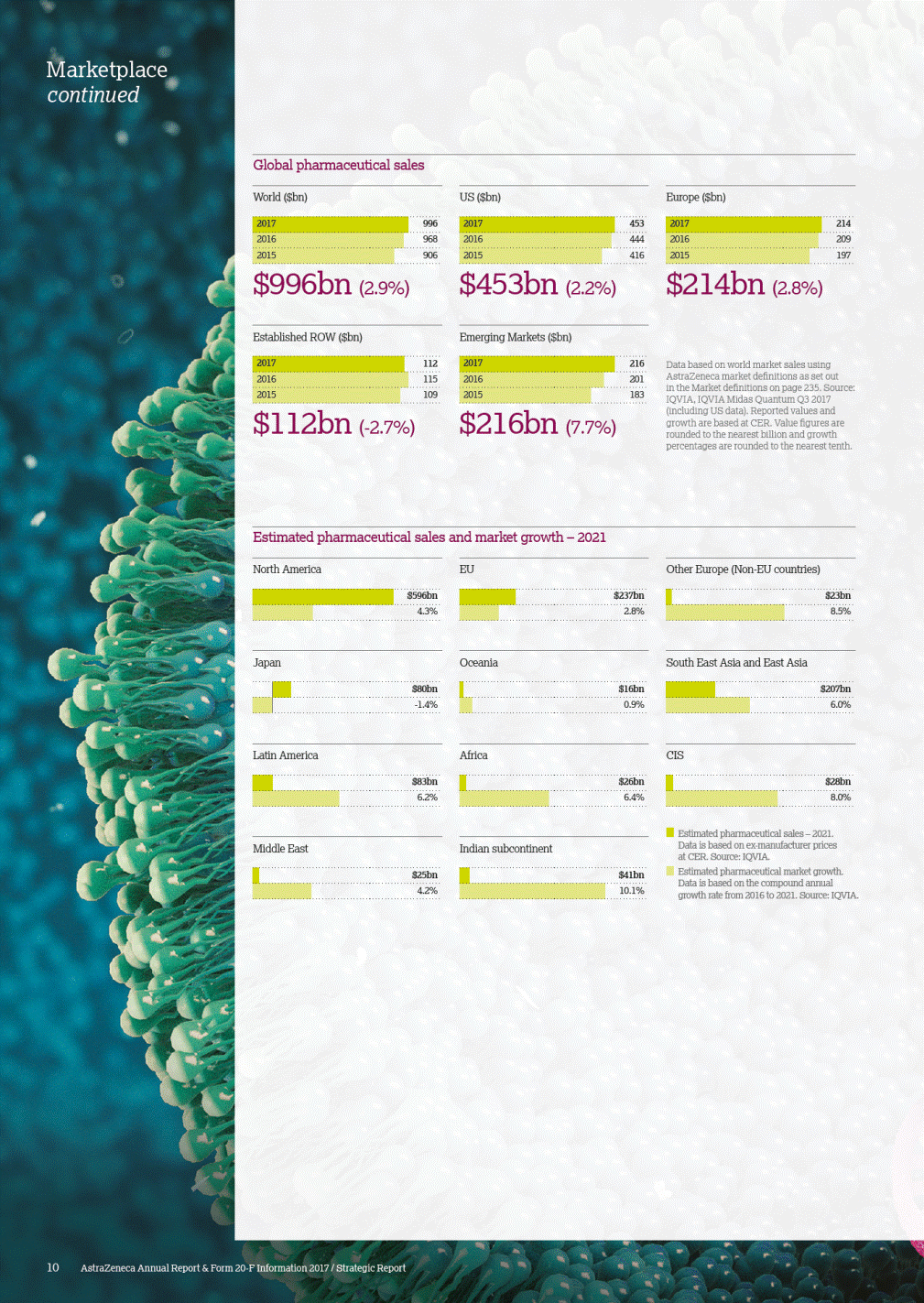 Marketplace continued Global pharmaceutical sales World ($bn) US ($bn) Europe ($bn) $996bn (2.9%) $453bn (2.2%) $214bn (2.8%) Established ROW ($bn) Emerging Markets ($bn) Data based on world market sales using AstraZeneca market definitions as set out in the Market definitions on page 235. Source: IQVIA, IQVIA Midas Quantum Q3 2017 (including US data). Reported values and growth are based at CER. Value figures are rounded to the nearest billion and growth percentages are rounded to the nearest tenth. $112bn (-2.7%) $216bn (7.7%) Estimated pharmaceutical sales and market growth – 2021 North America EU Other Europe (Non-EU countries) Japan Oceania South East Asia and East Asia Latin America Africa CIS Estimated pharmaceutical sales – 2021. Data is based on ex-manufacturer prices at CER. Source: IQVIA. Estimated pharmaceutical market growth. Data is based on the compound annual growth rate from 2016 to 2021. Source: IQVIA. Middle East Indian subcontinent 10 AstraZeneca Annual Report & Form 20-F Information 2017 / Strategic Report $25bn 4.2% $41bn 10.1% $83bn 6.2% $26bn 6.4% $28bn 8.0% $80bn -1.4% $16bn 0.9% $207bn 6.0% $596bn 4.3% $237bn 2.8% $23bn 8.5% 2017 112 2016 115 2015 109 2017 216 2016 201 2015 183 2017 996 2016 968 2015 906 2017 453 2016 444 2015 416 2017 214 2016 209 2015 197