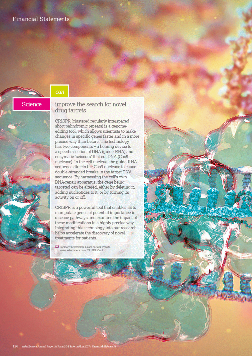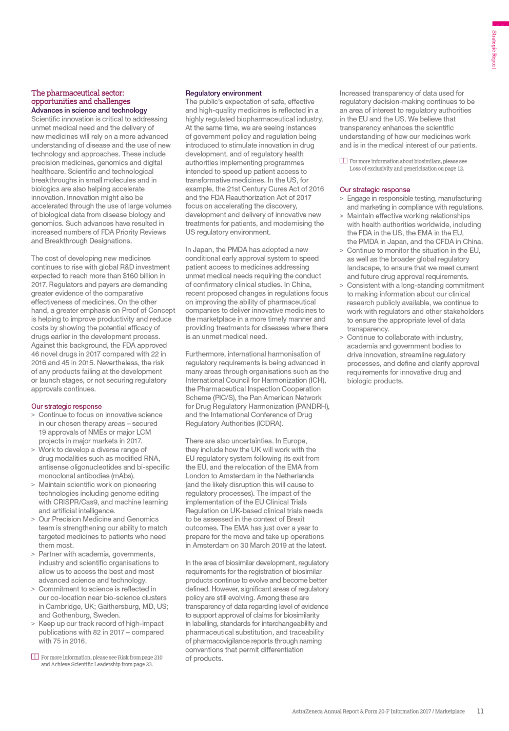 The pharmaceutical sector: opportunities and challenges Advances in science and technology Scientific innovation is critical to addressing unmet medical need and the delivery of new medicines will rely on a more advanced understanding of disease and the use of new technology and approaches. These include precision medicines, genomics and digital healthcare. Scientific and technological breakthroughs in small molecules and in biologics are also helping accelerate innovation. Innovation might also be accelerated through the use of large volumes of biological data from disease biology and genomics. Such advances have resulted in increased numbers of FDA Priority Reviews and Breakthrough Designations. Regulatory environment The public’s expectation of safe, effective and high-quality medicines is reflected in a highly regulated biopharmaceutical industry. At the same time, we are seeing instances of government policy and regulation being introduced to stimulate innovation in drug development, and of regulatory health authorities implementing programmes intended to speed up patient access to transformative medicines. In the US, for example, the 21st Century Cures Act of 2016 and the FDA Reauthorization Act of 2017 focus on accelerating the discovery, development and delivery of innovative new treatments for patients, and modernising the US regulatory environment. Increased transparency of data used for regulatory decision-making continues to be an area of interest to regulatory authorities in the EU and the US. We believe that transparency enhances the scientific understanding of how our medicines work and is in the medical interest of our patients. For more information about biosimilars, please see Loss of exclusivity and genericisation on page 12. Our strategic response > Engage in responsible testing, manufacturing and marketing in compliance with regulations. > Maintain effective working relationships with health authorities worldwide, including the FDA in the US, the EMA in the EU, the PMDA in Japan, and the CFDA in China. > Continue to monitor the situation in the EU, as well as the broader global regulatory landscape, to ensure that we meet current and future drug approval requirements. > Consistent with a long-standing commitment to making information about our clinical research publicly available, we continue to work with regulators and other stakeholders to ensure the appropriate level of data transparency. > Continue to collaborate with industry, academia and government bodies to drive innovation, streamline regulatory processes, and define and clarify approval requirements for innovative drug and biologic products. In Japan, the PMDA has adopted a new conditional early approval system to speed patient access to medicines addressing unmet medical needs requiring the conduct of confirmatory clinical studies. In China, recent proposed changes in regulations focus on improving the ability of pharmaceutical companies to deliver innovative medicines to the marketplace in a more timely manner and providing treatments for diseases where there is an unmet medical need. The cost of developing new medicines continues to rise with global R&D investment expected to reach more than $160 billion in 2017. Regulators and payers are demanding greater evidence of the comparative effectiveness of medicines. On the other hand, a greater emphasis on Proof of Concept is helping to improve productivity and reduce costs by showing the potential efficacy of drugs earlier in the development process. Against this background, the FDA approved 46 novel drugs in 2017 compared with 22 in 2016 and 45 in 2015. Nevertheless, the risk of any products failing at the development or launch stages, or not securing regulatory approvals continues. Furthermore, international harmonisation of regulatory requirements is being advanced in many areas through organisations such as the International Council for Harmonization (ICH), the Pharmaceutical Inspection Cooperation Scheme (PIC/S), the Pan American Network for Drug Regulatory Harmonization (PANDRH), and the International Conference of Drug Regulatory Authorities (ICDRA). Our strategic response > Continue to focus on innovative science in our chosen therapy areas – secured 19 approvals of NMEs or major LCM projects in major markets in 2017. > Work to develop a diverse range of drug modalities such as modified RNA, antisense oligonucleotides and bi-specific monoclonal antibodies (mAbs). > Maintain scientific work on pioneering technologies including genome editing with CRISPR/Cas9, and machine learning and artificial intelligence. > Our Precision Medicine and Genomics team is strengthening our ability to match targeted medicines to patients who need them most. > Partner with academia, governments, industry and scientific organisations to allow us to access the best and most advanced science and technology. > Commitment to science is reflected in our co-location near bio-science clusters in Cambridge, UK; Gaithersburg, MD, US; and Gothenburg, Sweden. > Keep up our track record of high-impact publications with 82 in 2017 – compared with 75 in 2016. There are also uncertainties. In Europe, they include how the UK will work with the EU regulatory system following its exit from the EU, and the relocation of the EMA from London to Amsterdam in the Netherlands (and the likely disruption this will cause to regulatory processes). The impact of the implementation of the EU Clinical Trials Regulation on UK-based clinical trials needs to be assessed in the context of Brexit outcomes. The EMA has just over a year to prepare for the move and take up operations in Amsterdam on 30 March 2019 at the latest. In the area of biosimilar development, regulatory requirements for the registration of biosimilar products continue to evolve and become better defined. However, significant areas of regulatory policy are still evolving. Among these are transparency of data regarding level of evide