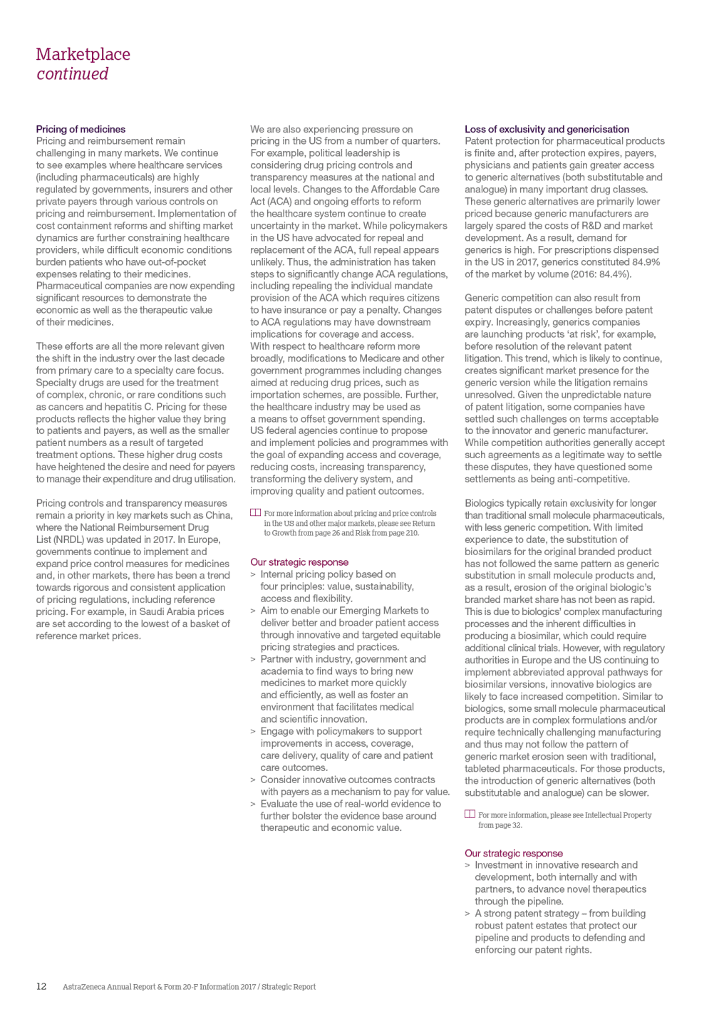 Marketplace continued Pricing of medicines Pricing and reimbursement remain challenging in many markets. We continue to see examples where healthcare services (including pharmaceuticals) are highly regulated by governments, insurers and other private payers through various controls on pricing and reimbursement. Implementation of cost containment reforms and shifting market dynamics are further constraining healthcare providers, while difficult economic conditions burden patients who have out-of-pocket expenses relating to their medicines. Pharmaceutical companies are now expending significant resources to demonstrate the economic as well as the therapeutic value of their medicines. We are also experiencing pressure on pricing in the US from a number of quarters. For example, political leadership is considering drug pricing controls and transparency measures at the national and local levels. Changes to the Affordable Care Act (ACA) and ongoing efforts to reform the healthcare system continue to create uncertainty in the market. While policymakers in the US have advocated for repeal and replacement of the ACA, full repeal appears unlikely. Thus, the administration has taken steps to significantly change ACA regulations, including repealing the individual mandate provision of the ACA which requires citizens to have insurance or pay a penalty. Changes to ACA regulations may have downstream implications for coverage and access. With respect to healthcare reform more broadly, modifications to Medicare and other government programmes including changes aimed at reducing drug prices, such as importation schemes, are possible. Further, the healthcare industry may be used as a means to offset government spending. US federal agencies continue to propose and implement policies and programmes with the goal of expanding access and coverage, reducing costs, increasing transparency, transforming the delivery system, and improving quality and patient outcomes. Loss of exclusivity and genericisation Patent protection for pharmaceutical products is finite and, after protection expires, payers, physicians and patients gain greater access to generic alternatives (both substitutable and analogue) in many important drug classes. These generic alternatives are primarily lower priced because generic manufacturers are largely spared the costs of R&D and market development. As a result, demand for generics is high. For prescriptions dispensed in the US in 2017, generics constituted 84.9% of the market by volume (2016: 84.4%). Generic competition can also result from patent disputes or challenges before patent expiry. Increasingly, generics companies are launching products ‘at risk’, for example, before resolution of the relevant patent litigation. This trend, which is likely to continue, creates significant market presence for the generic version while the litigation remains unresolved. Given the unpredictable nature of patent litigation, some companies have settled such challenges on terms acceptable to the innovator and generic manufacturer. While competition authorities generally accept such agreements as a legitimate way to settle these disputes, they have questioned some settlements as being anti-competitive. These efforts are all the more relevant given the shift in the industry over the last decade from primary care to a specialty care focus. Specialty drugs are used for the treatment of complex, chronic, or rare conditions such as cancers and hepatitis C. Pricing for these products reflects the higher value they bring to patients and payers, as well as the smaller patient numbers as a result of targeted treatment options. These higher drug costs have heightened the desire and need for payers to manage their expenditure and drug utilisation. Pricing controls and transparency measures remain a priority in key markets such as China, where the National Reimbursement Drug List (NRDL) was updated in 2017. In Europe, governments continue to implement and expand price control measures for medicines and, in other markets, there has been a trend towards rigorous and consistent application of pricing regulations, including reference pricing. For example, in Saudi Arabia prices are set according to the lowest of a basket of reference market prices. Biologics typically retain exclusivity for longer than traditional small molecule pharmaceuticals, with less generic competition. With limited experience to date, the substitution of biosimilars for the original branded product has not followed the same pattern as generic substitution in small molecule products and, as a result, erosion of the original biologic’s branded market share has not been as rapid. This is due to biologics’ complex manufacturing processes and the inherent difficulties in producing a biosimilar, which could require additional clinical trials. However, with regulatory authorities in Europe and the US continuing to implement abbreviated approval pathways for biosimilar versions, innovative biologics are likely to face increased competition. Similar to biologics, some small molecule pharmaceutical products are in complex formulations and/or require technically challenging manufacturing and thus may not follow the pattern of generic market erosion seen with traditional, tableted pharmaceuticals. For those products, the introduction of generic alternatives (both substitutable and analogue) can be slower. For more information about pricing and price controls in the US and other major markets, please see Return to Growth from page 26 and Risk from page 210. Our strategic response > Internal pricing policy based on four principles: value, sustainability, access and flexibility. > Aim to enable our Emerging Markets to deliver better and broader patient access through innovative and targeted equitable pricing strategies and practices. > Partner with industry, government and academia to find ways to bring new medicines to market more quickly and efficien