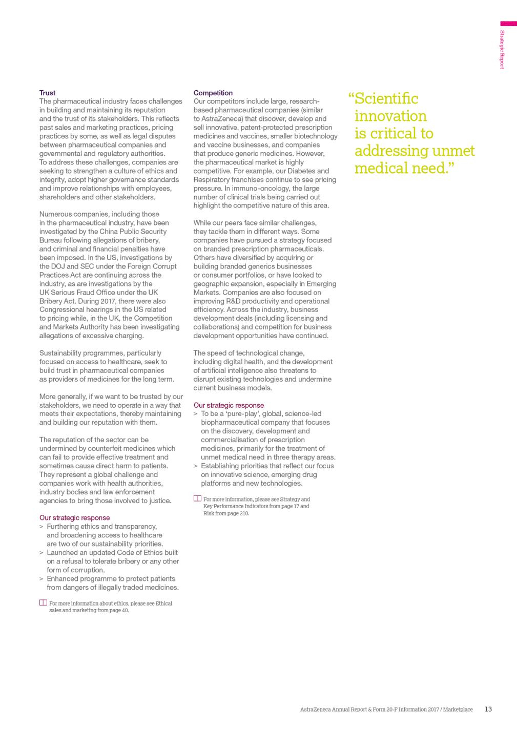 Trust The pharmaceutical industry faces challenges in building and maintaining its reputation and the trust of its stakeholders. This reflects past sales and marketing practices, pricing practices by some, as well as legal disputes between pharmaceutical companies and governmental and regulatory authorities. To address these challenges, companies are seeking to strengthen a culture of ethics and integrity, adopt higher governance standards and improve relationships with employees, shareholders and other stakeholders. Competition Our competitors include large, research-based pharmaceutical companies (similar to AstraZeneca) that discover, develop and sell innovative, patent-protected prescription medicines and vaccines, smaller biotechnology and vaccine businesses, and companies that produce generic medicines. However, the pharmaceutical market is highly competitive. For example, our Diabetes and Respiratory franchises continue to see pricing pressure. In immuno-oncology, the large number of clinical trials being carried out highlight the competitive nature of this area. “Scientific innovation is critical to addressing unmet medical need.” Numerous companies, including those in the pharmaceutical industry, have been investigated by the China Public Security Bureau following allegations of bribery, and criminal and financial penalties have been imposed. In the US, investigations by the DOJ and SEC under the Foreign Corrupt Practices Act are continuing across the industry, as are investigations by the UK Serious Fraud Office under the UK Bribery Act. During 2017, there were also Congressional hearings in the US related to pricing while, in the UK, the Competition and Markets Authority has been investigating allegations of excessive charging. While our peers face similar challenges, they tackle them in different ways. Some companies have pursued a strategy focused on branded prescription pharmaceuticals. Others have diversified by acquiring or building branded generics businesses or consumer portfolios, or have looked to geographic expansion, especially in Emerging Markets. Companies are also focused on improving R&D productivity and operational efficiency. Across the industry, business development deals (including licensing and collaborations) and competition for business development opportunities have continued. Sustainability programmes, particularly focused on access to healthcare, seek to build trust in pharmaceutical companies as providers of medicines for the long term. The speed of technological change, including digital health, and the development of artificial intelligence also threatens to disrupt existing technologies and undermine current business models. More generally, if we want to be trusted by our stakeholders, we need to operate in a way that meets their expectations, thereby maintaining and building our reputation with them. Our strategic response > To be a ‘pure-play’, global, science-led biopharmaceutical company that focuses on the discovery, development and commercialisation of prescription medicines, primarily for the treatment of unmet medical need in three therapy areas. > Establishing priorities that reflect our focus on innovative science, emerging drug platforms and new technologies. The reputation of the sector can be undermined by counterfeit medicines which can fail to provide effective treatment and sometimes cause direct harm to patients. They represent a global challenge and companies work with health authorities, industry bodies and law enforcement agencies to bring those involved to justice. For more information, please see Strategy and Key Performance Indicators from page 17 and Risk from page 210. Our strategic response > Furthering ethics and transparency, and broadening access to healthcare are two of our sustainability priorities. > Launched an updated Code of Ethics built on a refusal to tolerate bribery or any other form of corruption. > Enhanced programme to protect patients from dangers of illegally traded medicines. For more information about ethics, please see Ethical sales and marketing from page 40. 13 AstraZeneca Annual Report & Form 20-F Information 2017 / Marketplace Strategic Report