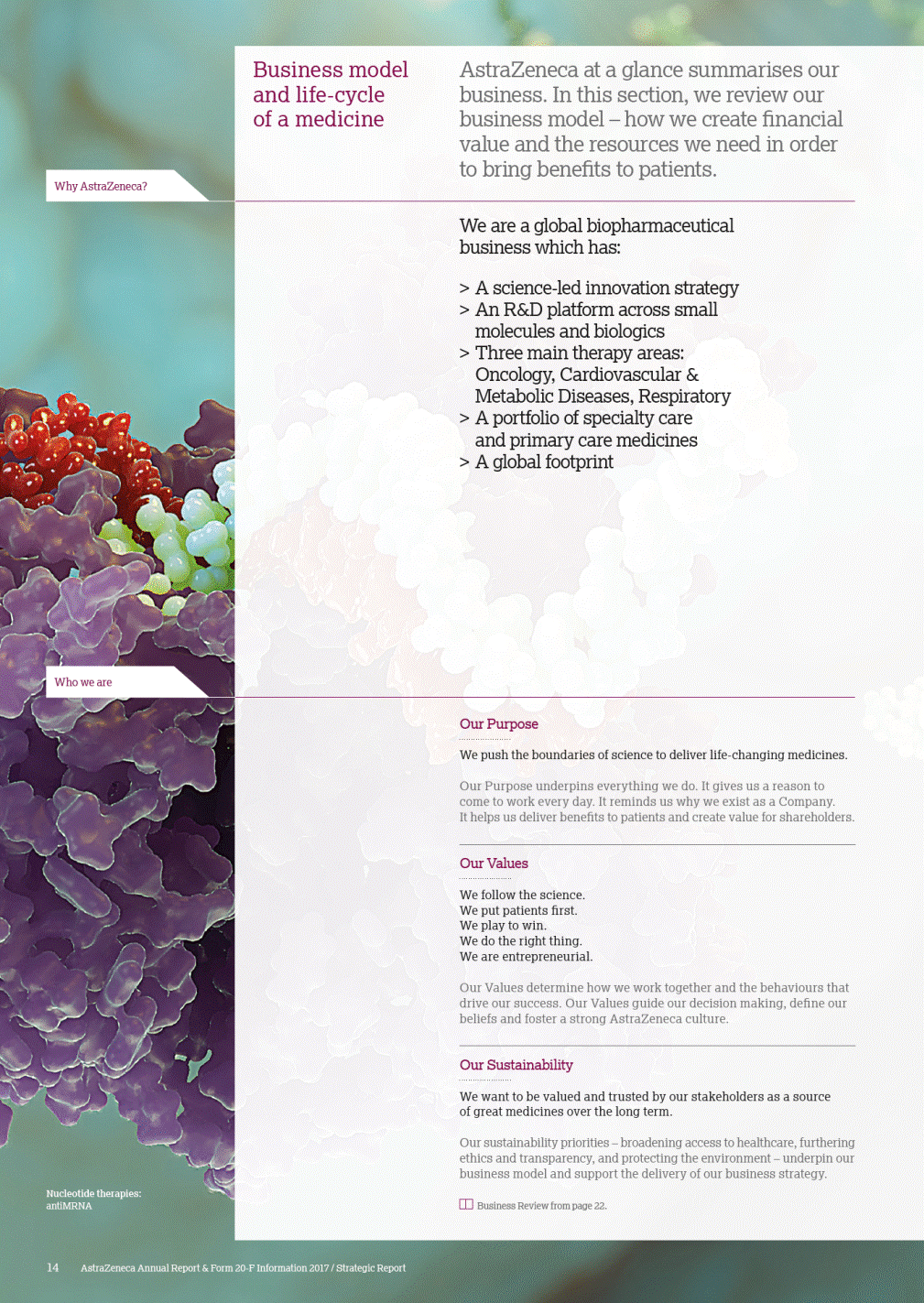Business model and life-cycle of a medicine AstraZeneca at a glance summarises our business. In this section, we review our business model – how we create financial value and the resources we need in order to bring benefits to patients. Why AstraZeneca? We are a global biopharmaceutical business which has: > A science-led innovation strategy > An R&D platform across small molecules and biologics > Three main therapy areas: Oncology, Cardiovascular & Metabolic Diseases, Respiratory > A portfolio of specialty care and primary care medicines > A global footprint Who we are Our Purpose We push the boundaries of science to deliver life-changing medicines. Our Purpose underpins everything we do. It gives us a reason to come to work every day. It reminds us why we exist as a Company. It helps us deliver benefits to patients and create value for shareholders. Our Values We follow the science. We put patients first. We play to win. We do the right thing. We are entrepreneurial. Our Values determine how we work together and the behaviours that drive our success. Our Values guide our decision making, define our beliefs and foster a strong AstraZeneca culture. Our Sustainability We want to be valued and trusted by our stakeholders as a source of great medicines over the long term. Our sustainability priorities – broadening access to healthcare, furthering ethics and transparency, and protecting the environment – underpin our business model and support the delivery of our business strategy. Nucleotide therapies: antiMRNA Business Review from page 22. 14 AstraZeneca Annual Report & Form 20-F Information 2017 / Strategic Report