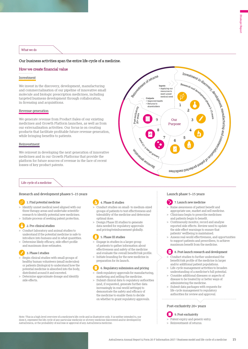 What we do Our business activities span the entire life-cycle of a medicine. How we create financial value Investment We invest in the discovery, development, manufacturing and commercialisation of our pipeline of innovative small molecule and biologic prescription medicines, including targeted business development through collaboration, in-licensing and acquisitions. Inputs > Applying our resources to meet unmet medical need Outputs > Improved health > Returns to shareholders 1 2 Revenue generation We generate revenue from Product Sales of our existing medicines and Growth Platform launches, as well as from our externalisation activities. Our focus is on creating products that facilitate profitable future revenue generation, while bringing benefits to patients. 9 3 Our Purpose 8 4 7 5 6 Reinvestment We reinvest in developing the next generation of innovative medicines and in our Growth Platforms that provide the platform for future sources of revenue in the face of recent losses of key product patents. Life-cycle of a medicine Research and development phases 5–15 years Launch phase 5–15 years 1. Find potential medicine > Identify unmet medical need aligned with our three therapy areas and undertake scientific research to identify potential new medicines. > Initiate process of seeking patent protection. 4. Phase II studies 7. Launch new medicine > Raise awareness of patient benefit and appropriate use, market and sell medicine. > Clinicians begin to prescribe medicines and patients begin to benefit. > Continuously monitor, record and analyse reported side effects. Review need to update the side effect warnings to ensure that patients’ wellbeing is maintained. > Assess real-world effectiveness, and opportunities to support patients and prescribers, to achieve maximum benefit from the medicine. > Conduct studies on small-to medium-sized groups of patients to test effectiveness and tolerability of the medicine and determine optimal dose. > Design Phase III studies to generate data needed for regulatory approvals and pricing/reimbursement globally. 2. Pre-clinical studies > Conduct laboratory and animal studies to understand if the potential medicine is safe to introduce into humans and in what quantities. > Determine likely efficacy, side effect profile and maximum dose estimates. 5. Phase III studies > Engage in studies in a larger group of patients to gather information about effectiveness and safety of the medicine and evaluate the overall benefit/risk profile. > Initiate branding for the new medicine in preparation for its launch. 8. Post-launch research and development > Conduct studies to further understand the benefit/risk profile of the medicine in larger and/or additional patient populations. > Life-cycle management activities to broaden understanding of a medicine’s full potential. > Consider additional diseases or aspects of disease to be treated by or better ways of administering the medicine. > Submit data packages with requests for life-cycle management to regulatory authorities for review and approval. 3. Phase I studies > Begin clinical studies with small groups of healthy human volunteers (small molecules) or patients (biologics) to understand how the potential medicine is absorbed into the body, distributed around it and excreted. > Determine approximate dosage and identify side effects. 6. Regulatory submission and pricing > Seek regulatory approvals for manufacturing, marketing and selling the medicine. > Submit clinical data to regulatory authorities (and, if requested, generate further data increasingly in real-world settings) to demonstrate the safety and efficacy of the medicine to enable them to decide on whether to grant regulatory approvals. Post-exclusivity 20+ years 9. Post-exclusivity > Patent expiry and generic entry. > Reinvestment of returns. Note: This is a high-level overview of a medicine’s life-cycle and is illustrative only. It is neither intended to, nor does it, represent the life-cycle of any particular medicine or of every medicine discovered and/or developed by AstraZeneca, or the probability of success or approval of any AstraZeneca medicine. 15 AstraZeneca Annual Report & Form 20-F Information 2017 / Business model and life-cycle of a medicine Strategic Report u Po 20