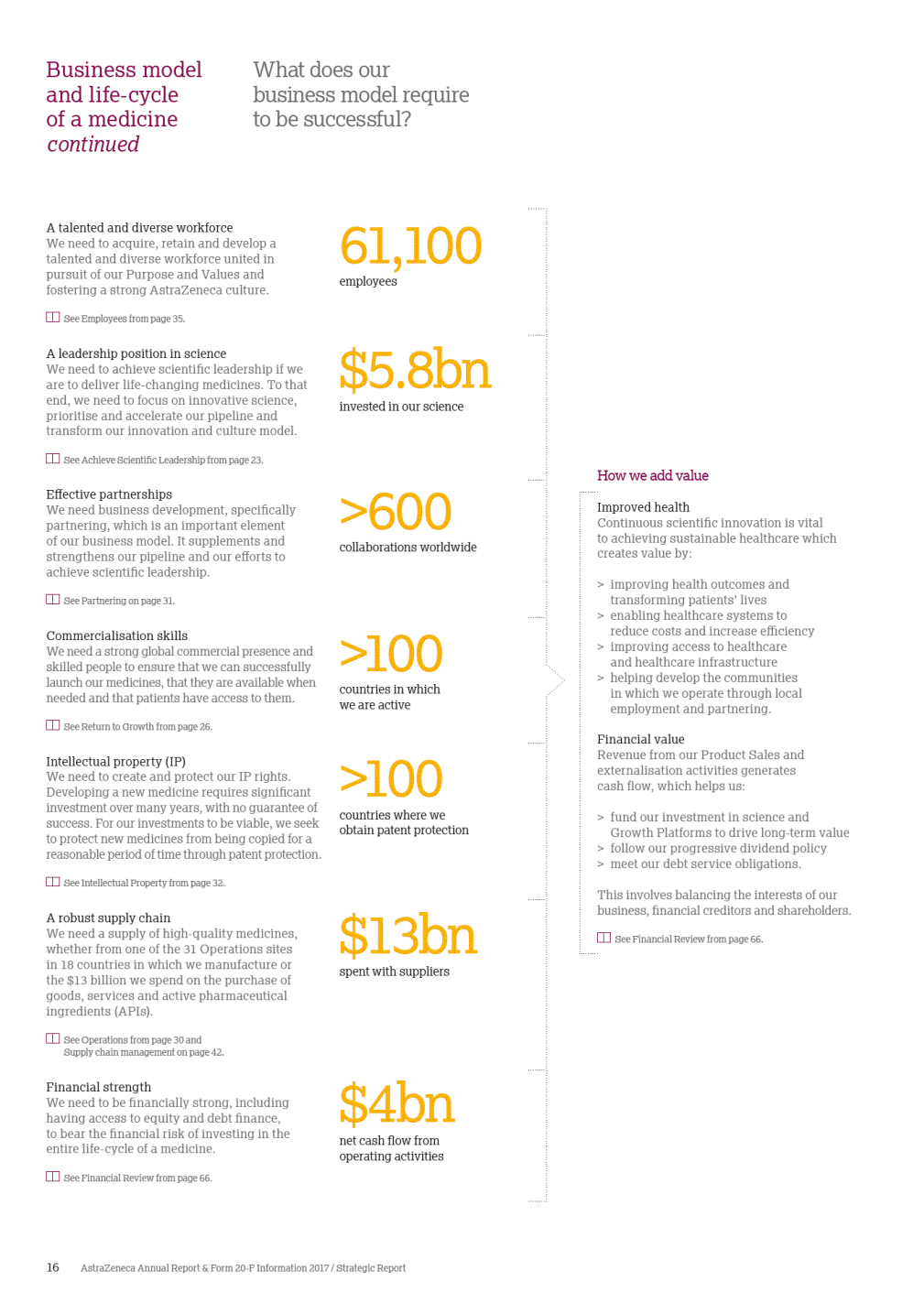 Business model and life-cycle of a medicine continued What does our business model require to be successful? 61,100 employees A talented and diverse workforce We need to acquire, retain and develop a talented and diverse workforce united in pursuit of our Purpose and Values and fostering a strong AstraZeneca culture. See Employees from page 35. $5.8bn invested in our science A leadership position in science We need to achieve scientific leadership if we are to deliver life-changing medicines. To that end, we need to focus on innovative science, prioritise and accelerate our pipeline and transform our innovation and culture model. See Achieve Scientific Leadership from page 23. How we add value >600 collaborations worldwide Effective partnerships We need business development, specifically partnering, which is an important element of our business model. It supplements and strengthens our pipeline and our efforts to achieve scientific leadership. Improved health Continuous scientific innovation is vital to achieving sustainable healthcare which creates value by: > improving health outcomes and transforming patients’ lives > enabling healthcare systems to reduce costs and increase efficiency > improving access to healthcare and healthcare infrastructure > helping develop the communities in which we operate through local employment and partnering. See Partnering on page 31. >100 countries in which we are active Commercialisation skills We need a strong global commercial presence and skilled people to ensure that we can successfully launch our medicines, that they are available when needed and that patients have access to them. See Return to Growth from page 26. Financial value Revenue from our Product Sales and externalisation activities generates cash flow, which helps us: >100 countries where we obtain patent protection Intellectual property (IP) We need to create and protect our IP rights. Developing a new medicine requires significant investment over many years, with no guarantee of success. For our investments to be viable, we seek to protect new medicines from being copied for a reasonable period of time through patent protection. > fund our investment in science and Growth Platforms to drive long-term value > follow our progressive dividend policy > meet our debt service obligations. See Intellectual Property from page 32. This involves balancing the interests of our business, financial creditors and shareholders. $13bn spent with suppliers A robust supply chain We need a supply of high-quality medicines, whether from one of the 31 Operations sites in 18 countries in which we manufacture or the $13 billion we spend on the purchase of goods, services and active pharmaceutical ingredients (APIs). See Financial Review from page 66. See Operations from page 30 and Supply chain management on page 42. $4bn net cash flow from operating activities Financial strength We need to be financially strong, including having access to equity and debt finance, to bear the financial risk of investing in the entire life-cycle of a medicine. See Financial Review from page 66. 16 AstraZeneca Annual Report & Form 20-F Information 2017 / Strategic Report