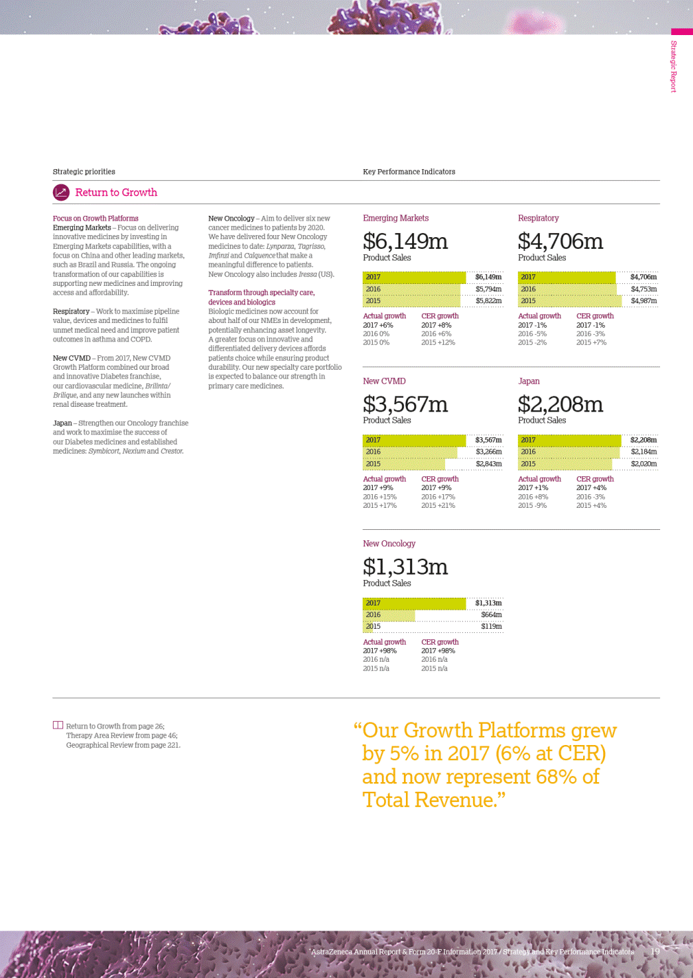 Strategic priorities Key Performance Indicators Return to Growth Emerging Markets $6,149m Product Sales Respiratory $4,706m Product Sales Focus on Growth Platforms Emerging Markets – Focus on delivering innovative medicines by investing in Emerging Markets capabilities, with a focus on China and other leading markets, such as Brazil and Russia. The ongoing transformation of our capabilities is supporting new medicines and improving access and affordability. New Oncology – Aim to deliver six new cancer medicines to patients by 2020. We have delivered four New Oncology medicines to date: Lynparza, Tagrisso, Imfinzi and Calquence that make a meaningful difference to patients. New Oncology also includes Iressa (US). Transform through specialty care, devices and biologics Biologic medicines now account for about half of our NMEs in development, potentially enhancing asset longevity. A greater focus on innovative and differentiated delivery devices affords patients choice while ensuring product durability. Our new specialty care portfolio is expected to balance our strength in primary care medicines. Respiratory – Work to maximise pipeline value, devices and medicines to fulfil unmet medical need and improve patient outcomes in asthma and COPD. Actual growth 2017 +6% 2016 0% 2015 0% CER growth 2017 +8% 2016 +6% 2015 +12% Actual growth 2017 -1% 2016 -5% 2015 -2% CER growth 2017 -1% 2016 -3% 2015 +7% New CVMD – From 2017, New CVMD Growth Platform combined our broad and innovative Diabetes franchise, our cardiovascular medicine, Brilinta/ Brilique, and any new launches within renal disease treatment. New CVMD $3,567m Product Sales Japan $2,208m Product Sales Japan – Strengthen our Oncology franchise and work to maximise the success of our Diabetes medicines and established medicines: Symbicort, Nexium and Crestor. Actual growth 2017 +9% 2016 +15% 2015 +17% CER growth 2017 +9% 2016 +17% 2015 +21% Actual growth 2017 +1% 2016 +8% 2015 -9% CER growth 2017 +4% 2016 -3% 2015 +4% New Oncology $1,313m Product Sales Actual growth 2017 +98% 2016 n/a 2015 n/a CER growth 2017 +98% 2016 n/a 2015 n/a “Our Growth Platforms grew by 5% in 2017 (6% at CER) and now represent 68% of Total Revenue.” Return to Growth from page 26; Therapy Area Review from page 46; Geographical Review from page 221. 19 AstraZeneca Annual Report & Form 20-F Information 2017 / Strategy and Key Performance Indicators Strategic Report 2017 $1,313m 2016 $664m 20 15 $119m 2017 $2,208m 2016 $2,184m 2015 $2,020m 2017 $3,567m 2016 $3,266m 2015 $2,843m 2017 $4,706m 2016 $4,753m 2015 $4,987m 2017 $6,149m 2016 $5,794m 2015 $5,822m