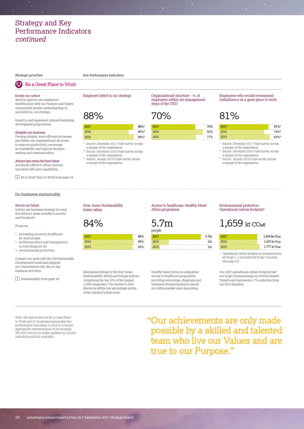 Strategy and Key Performance Indicators continued Strategic priorities Key Performance Indicators Be a Great Place to Work Employee belief in our strategy Organisational structure – % of employees within six management steps of the CEO Employees who would recommend AstraZeneca as a great place to work Evolve our culture Work to improve our employees’ identification with our Purpose and Values and promote greater understanding of, and belief in, our strategy. 88% 70% 81% Invest in and implement tailored leadership development programmes. ¹ ¹ ² ² Simplify our business Develop simpler, more efficient processes and flatten our organisational structure to improve productivity, encourage accountability and improve decision making and communication. ³ ³ ¹ Source: December 2017 Pulse survey across a sample of the organisation. ² Source: December 2016 Pulse survey across a sample of the organisation. ³ Source: January 2016 Pulse survey across a sample of the organisation. ¹ Source: December 2017 Pulse survey across a sample of the organisation. ² Source: December 2016 Pulse survey across a sample of the organisation. ³ Source: January 2016 Pulse survey across a sample of the organisation. Attract and retain the best talent Accelerate efforts to attract diverse, top talent with new capabilities. Be a Great Place to Work from page 34. Do business sustainably Dow Jones Sustainability Index rating Access to healthcare: Healthy Heart Africa programme Environmental protection: Operational carbon footprint¹ Secure our future Deliver our business strategy in a way that delivers wider benefits to society and the planet. 84% 5.7m people 1,659 kt COe Focus on: > increasing access to healthcare for more people > furthering ethics and transparency in everything we do > environmental protection. ¹ Operational carbon footprint is emissions from all Scope 1, 2 and selected Scope 3 sources. See page 227. Connect our work with the UN Sustainable Development Goals and integrate our commitments into day-to-day business activities. Maintained listing in the Dow Jones Sustainability World and Europe Indices comprising the top 10% of the largest 2,500 companies. The decline to 84% places us within two percentage points of the industry’s best score. Healthy Heart Africa is a signature access to healthcare programme providing screenings, diagnosis and treatment of hypertension to nearly six million people since launching. Our 2017 operational carbon footprint met our target of progressing our Science Based Targets and represents a 7% reduction from our 2015 baseline. Sustainability from page 38. Note: We will review the Be a Great Place to Work and Do business sustainably key performance indicators in 2018 to evaluate appropriate representation of the strategy. We will continue to make updates on current indicators publicly available. “Our achievements are only made possible by a skilled and talented team who live our Values and are true to our Purpose.” 20 AstraZeneca Annual Report & Form 20-F Information 2017 / Strategic Report 2017 1,659 kt COe 2016 1,659 kt COe 2015 1,777 kt COe 2017 5.7m 2016 2m 2015 1m 2017 84% 2016 86% 2015 84% 2017 81% 2016 74% 2015 83% 2017 70% 2016 82% 2015 71% 2017 88% 2016 80% 2015 89%