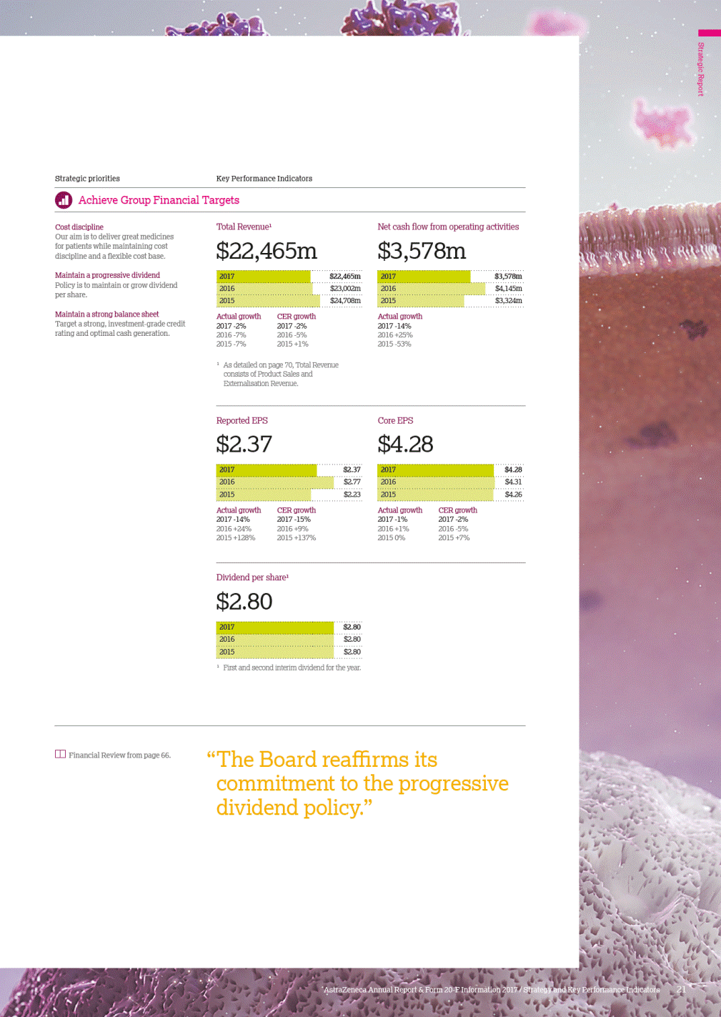 Strategic priorities Key Performance Indicators Achieve Group Financial Targets Total Revenue¹ $22,465m Net cash flow from operating activities $3,578m Cost discipline Our aim is to deliver great medicines for patients while maintaining cost discipline and a flexible cost base. Maintain a progressive dividend Policy is to maintain or grow dividend per share. Maintain a strong balance sheet Target a strong, investment-grade credit rating and optimal cash generation. Actual growth 2017 -2% 2016 -7% 2015 -7% CER growth 2017 -2% 2016 -5% 2015 +1% Actual growth 2017 -14% 2016 +25% 2015 -53% ¹ As detailed on page 70, Total Revenue consists of Product Sales and Externalisation Revenue. Reported EPS $2.37 Core EPS $4.28 Actual growth 2017 -14% 2016 +24% 2015 +128% CER growth 2017 -15% 2016 +9% 2015 +137% Actual growth 2017 -1% 2016 +1% 2015 0% CER growth 2017 -2% 2016 -5% 2015 +7% Dividend per share¹ $2.80 ¹ First and second interim dividend for the year. “The Board reaffirms its commitment to the progressive dividend policy.” Financial Review from page 66. 21 AstraZeneca Annual Report & Form 20-F Information 2017 / Strategy and Key Performance Indicators Strategic Report 2017 $2.80 2016 $2.80 2015 $2.80 2017 $4.28 2016 $4.31 2015 $4.26 2017 $2.37 2016 $2.77 2015 $2.23 2017 $3,578m 2016 $4,145m 2015 $3,324m 2017 $22,465m 2016 $23,002m 2015 $24,708m
