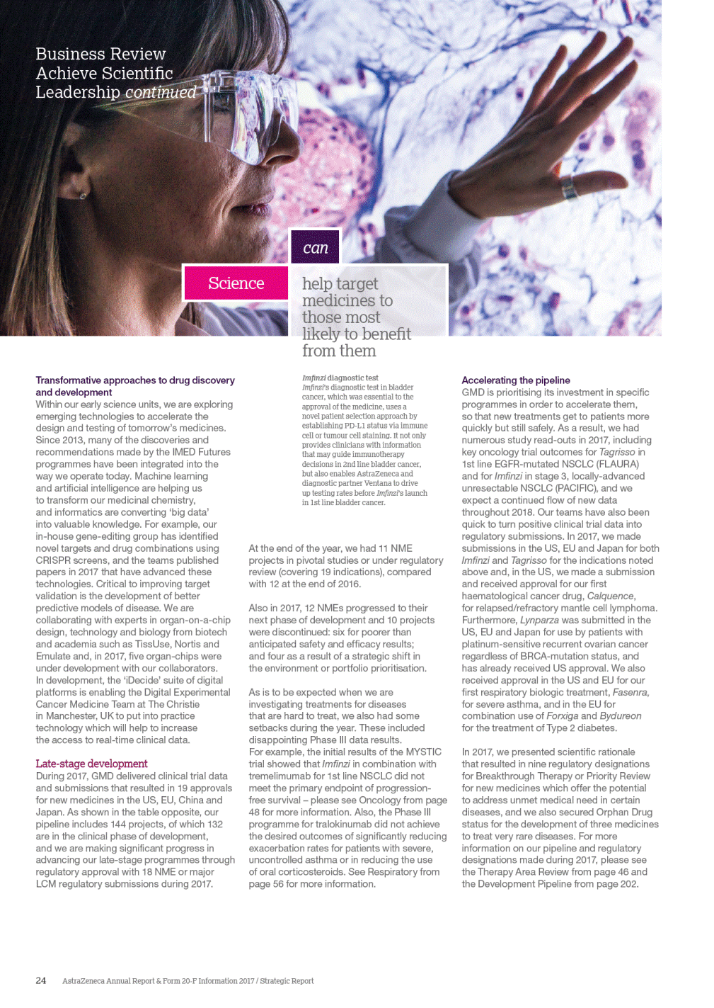 1. Achieve Scientific Leadership We are using our distinctive scientific capabilities, as well as investing in key programmes and focused business development, to deliver life-changing medicines. Early science We want to push the boundaries of science to strengthen our early-stage product portfolio. That means exploring novel biology and using more diverse drug platforms. For example, our partnership with Moderna is exploring the use of modified ribonucleic acid (RNA) for cardiac regeneration in patients undergoing coronary artery bypass graft surgery (AZD8601). With Ionis Therapeutics, we are investigating an antisense oligonucleotide in immuno-oncology (AZD9150), in combination with Imfinzi. Also in 2017, we formed partnerships with APT Therapeutics to access their therapeutic protein platform; with Pieris to develop novel inhaled drugs; and with Bicycle Therapeutics, in support of both our Respiratory and New CVMD Growth Platforms, to develop a new class of therapeutics based on its proprietary bicyclic peptide product platforms. University School of Medicine to advance next generation personalised cancer immunotherapy with neoantigen vaccines. We also renewed our collaboration with a subsidiary of the French National Institute of Health and Medical Research conducting research into translational biology and new disease mechanisms across a range of therapeutic areas. Overview > 19 approvals of NMEs or major LCM projects in major markets – 9 Oncology approvals for Imfinzi, Calquence, Faslodex, Lynparza and Tagrisso – 6 CVMD approvals for Bydureon, Bydureon BCise, Forxiga and Qtern – 1 Respiratory approval for Fasenra – 3 Other approvals for Duzallo, Kyntheum/Siliq > 18 NME or major LCM regulatory submissions in major markets > 9 Phase III NME investment decisions > 14 Phase II starts > Accelerated reviews included – 3 Breakthrough Therapy Designations – 2 Orphan Drug Designations – 2 Accelerated approvals – 6 Priority Review Designations > 10 projects discontinued Precision medicine and genomics Precision medicine, our new name for personalised healthcare, reflects the broad range of cutting-edge diagnostic technologies we use, including molecular diagnostics, tissue diagnostics, next-generation sequencing and point-of-care diagnostics. Building on our historical focus on Oncology, we now cover all three main therapy areas. Today, 90% of our clinical pipeline follows a precision medicine approach – 10 percentage points more than in 2016. We are industry leading in this field with 19 diagnostic tests launched, linked to four of our medicines (Iressa, Lynparza, Tagrisso and Imfinzi) and one linked to a drug we have just externalised (Zurampic); joint first for the number of FDA approvals of precision medicines; and the highest number of biomarker-related publications in scientific journals since 2014. We also identify collaborations that allow us to out-license our own technology platforms. For instance, we continued to expand the utilisation of our antibody-drug conjugates (ADC) technology platform through an agreement with GamaMabs Pharma to produce an ADC as a potential cancer therapy. Working collaboratively and fostering open innovation Our collaborative approach to science was exemplified in 2017 by our partnerships with Imperial College, Crick Institute, and the MRC Laboratory of Molecular Biology to further our understanding of the underlying biology of disease. Additionally, since the start of our joint blue-skies programme with the MRC Laboratory of Molecular Biology in 2014, we have funded 22 research projects. We have also continued to pioneer new approaches to open innovation, enabling our scientists to share their ideas more freely and collaborate on projects with external scientists. The IMED Open Innovation portal allows external researchers to access the full range of open innovation programmes. By the end of 2017, our teams had reviewed more than 500 proposals for new drug projects. Of these, 32 have progressed as far as clinical trials, while more than 294 are at pre-clinical trial stage. In 2017, we delivered four diagnostic tests. These included one diagnostic to detect PD-L1 protein expression on both tumour and immune cells for Imfinzi (bladder cancer); one blood-based laboratory assay for BRCA genes for Lynparza (ovarian cancer); one point of care diagnostic for uric acid in blood that can be used for Zurampic (gout) and one tumour tissue next-generation sequencing diagnostic for Tagrisso (NSCLC). In Respiratory disease, we are now developing our first point-of-care test for eosinophilic respiratory disease with ChemBio Diagnostics. In total, we invested over $185 million in strategic partnerships with leading diagnostic companies in 2017, including Ventana (Roche Tissue Diagnostics), Illumina, Roche Molecular Systems and Myriad Genetics. We have an in-house Centre for Genomics Research which analyses genomes and enables us to identify more effectively novel genetic causes of diseases and integrate this knowledge across our entire drug discovery and development platform. We are also partnering with experts in genomics to enhance our expertise in this field. Scientific leadership and collaboration AstraZeneca’s Purpose is to push the boundaries of science to deliver life-changing medicines. It underpins everything we do. However, as we seek to achieve scientific leadership, we know that we cannot do so alone. We want the way we work to be inclusive, open and collaborative. We believe our biotech-style operating model gives us access to the best science, both internal and external, and we are open to exploring new and different kinds of collaborations. One of the measures of our success in achieving scientific leadership and demonstrating the quality of research conducted in our laboratories is the number of publications in high-quality and ‘high-impact’ journals. It is also critical for recruiting and retaining the best scientists from aroun