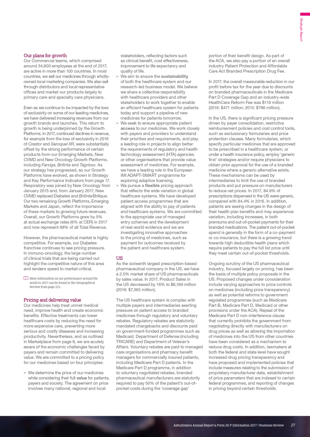 Our plans for growth Our Commercial teams, which comprised around 34,600 employees at the end of 2017, are active in more than 100 countries. In most countries, we sell our medicines through wholly-owned local marketing companies. We also sell through distributors and local representative offices and market our products largely to primary care and specialty care physicians. stakeholders, reflecting factors such as clinical benefit, cost effectiveness, improvement to life expectancy and quality of life. > We aim to ensure the sustainability of both the healthcare system and our research-led business model. We believe we share a collective responsibility with healthcare providers and other stakeholders to work together to enable an efficient healthcare system for patients today and support a pipeline of new medicines for patients tomorrow. > We seek to ensure appropriate patient access to our medicines. We work closely with payers and providers to understand their priorities and requirements, and play a leading role in projects to align better the requirements of regulatory and health technology assessment (HTA) agencies or other organisations that provide value assessment of medicines. For example, we have a leading role in the European IMI ADAPT-SMART programme for exploring adaptive licensing. > We pursue a flexible pricing approach that reflects the wide variation in global healthcare systems. We have developed patient access programmes that are aligned with the ability to pay of patients and healthcare systems. We are committed to the appropriate use of managed entry schemes and the development of real-world evidence and we are investigating innovative approaches to the pricing of medicines, such as payment for outcomes received by the patient and healthcare system. portion of their benefit design. As part of the ACA, we also pay a portion of an overall industry Patient Protection and Affordable Care Act Branded Prescription Drug Fee. In 2017, the overall measurable reduction in our profit before tax for the year due to discounts on branded pharmaceuticals in the Medicare Part D Coverage Gap and an industry-wide HealthCare Reform Fee was $119 million (2016: $471 million; 2015: $786 million). Even as we continue to be impacted by the loss of exclusivity on some of our leading medicines, we have delivered increasing revenues from our growth brands and launches. This return to growth is being underpinned by the Growth Platforms. In 2017, continued declines in revenue, for example from the loss of exclusivity in 2016 of Crestor and Seroquel XR, were substantially offset by the strong performance of certain products from our Emerging Markets, New CVMD and New Oncology Growth Platforms, including Farxiga, Brilinta and Tagrisso. As our strategy has progressed, so our Growth Platforms have evolved, as shown in Strategy and Key Performance Indicators from page 17. Respiratory was joined by New Oncology from January 2015 and, from January 2017, New CVMD replaced Diabetes and Brilinta/Brilique. Our two remaining Growth Platforms, Emerging Markets and Japan, reflect the importance of these markets to growing future revenues. Overall, our Growth Platforms grew by 5% at actual exchange rates (6% at CER) in 2017 and now represent 68% of all Total Revenue. In the US, there is significant pricing pressure driven by payer consolidation, restrictive reimbursement policies and cost control tools, such as exclusionary formularies and price protection clauses. Many formularies, which specify particular medicines that are approved to be prescribed in a healthcare system, or under a health insurance policy, employ ‘generic first’ strategies and/or require physicians to obtain prior approval for the use of a branded medicine where a generic alternative exists. These mechanisms can be used by intermediaries to limit the use of branded products and put pressure on manufacturers to reduce net prices. In 2017, 84.9% of prescriptions dispensed in the US were generic, compared with 84.4% in 2016. In addition, patients are seeing changes in the design of their health plan benefits and may experience variation, including increases, in both premiums and out-of-pocket payments for their branded medications. The patient out-of-pocket spend is generally in the form of a co-payment or co-insurance, but there is a growing trend towards high deductible health plans which require patients to pay the full list price until they meet certain out-of-pocket thresholds. However, the pharmaceutical market is highly competitive. For example, our Diabetes franchise continues to see pricing pressure. In immuno-oncology, the large number of clinical trials that are being carried out highlight the competitive nature of this area and renders speed to market critical. US As the sixteenth largest prescription-based pharmaceutical company in the US, we have a 2.5% market share of US pharmaceuticals by sales value. In 2017, Product Sales in the US decreased by 16% to $6,169 million (2016: $7,365 million). Ongoing scrutiny of the US pharmaceutical industry, focused largely on pricing, has been the basis of multiple policy proposals in the US. Proposed changes under consideration include varying approaches to price controls on medicines (including price transparency) as well as potential reforms to government regulated programmes (such as Medicare Part B, Medicare Part D, Medicaid or other provisions under the ACA). Repeal of the Medicare Part D non-interference clause that currently prohibits the government from negotiating directly with manufacturers on drug prices as well as allowing the importation of medicines into the US from other countries have been considered as a mechanism to reduce drug costs. In addition, lawmakers at both the federal and state level have sought increased drug pricing transparency and have proposed and implemented policies that include measures relating to the submission of proprietary manufacturer data, establ