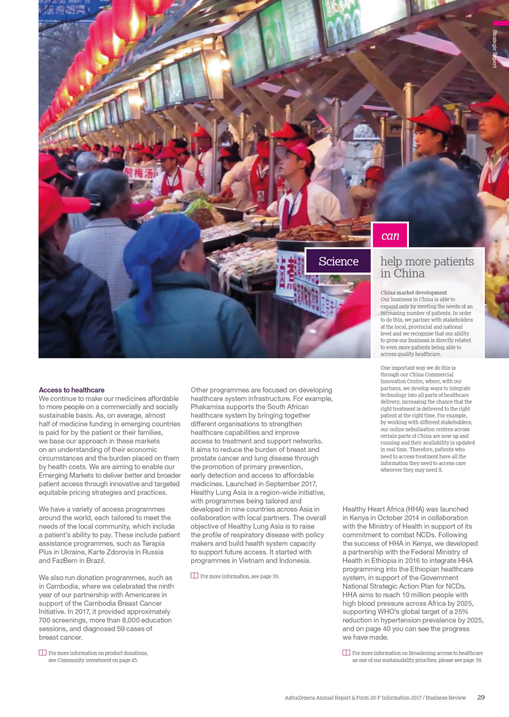 Access to healthcare We continue to make our medicines affordable to more people on a commercially and socially sustainable basis. As, on average, almost half of medicine funding in emerging countries is paid for by the patient or their families, we base our approach in these markets on an understanding of their economic circumstances and the burden placed on them by health costs. We are aiming to enable our Emerging Markets to deliver better and broader patient access through innovative and targeted equitable pricing strategies and practices. Other programmes are focused on developing healthcare system infrastructure. For Phakamisa supports the South Africa healthcare system by bringing together different organisations to strengthen healthcare capabilities and improve access to treatment and support networks. It aims to reduce the burden of breast and prostate cancer and lung disease through the promotion of primary prevention, early detection and access to afforda medicines. Launched in September 2017, Healthy Lung Asia is a region-wide initiative, with programmes being tailored and developed in nine countries across Asia in collaboration with local partners. The overall objective of Healthy Lung Asia is to raise the profile of respiratory disease with policy makers and build health system capacity to support future access. It started with programmes in Vietnam and Indonesia. We have a variety of access programmes around the world, each tailored to meet the needs of the local community, which include a patient’s ability to pay. These include patient assistance programmes, such as Terapia Plus in Ukraine, Karte Zdorovia in Russia and FazBem in Brazil. Healthy Heart Africa (HHA) was launched in Kenya in October 2014 in collaboration with the Ministry of Health in support of its commitment to combat NCDs. Following the success of HHA in Kenya, we developed a partnership with the Federal Ministry of Health in Ethiopia in 2016 to integrate HHA programming into the Ethiopian healthcare system, in support of the Government National Strategic Action Plan for NCDs. HHA aims to reach 10 million people with high blood pressure across Africa by 2025, supporting WHO’s global target of a 25% reduction in hypertension prevalence by 2025, and on page 40 you can see the progress we have made. We also run donation programmes, such as in Cambodia, where we celebrated the ninth year of our partnership with Americares in support of the Cambodia Breast Cancer Initiative. In 2017, it provided approximately 700 screenings, more than 8,000 education sessions, and diagnosed 59 cases of breast cancer. For more information, see page 39. For more information on product donations, see Community investment on page 45. For more information on Broadening access to healthcare as one of our sustainability priorities, please see page 39. 29 AstraZeneca Annual Report & Form 20-F Information 2017 / Business Review Strategic Report can Science help more patients in China China market development Our business in China is able to expand only by meeting the needs of an increasing number of patients. In order to do this, we partner with stakeholders at the local, provincial and national level and we recognise that our ability to grow our business is directly related to even more patients being able to access quality healthcare. One important way we do this is through our China Commercial Innovation Centre, where, with our partners, we develop ways to integrate technology into all parts of healthcare delivery, increasing the chance that the right treatment is delivered to the right patient at the right time. For example, by working with different stakeholders, our online nebulisation centres across certain parts of China are now up and running and their availability is updated in real time. Therefore, patients who need to access treatment have all the information they need to access care wherever they may need it. example, n ble