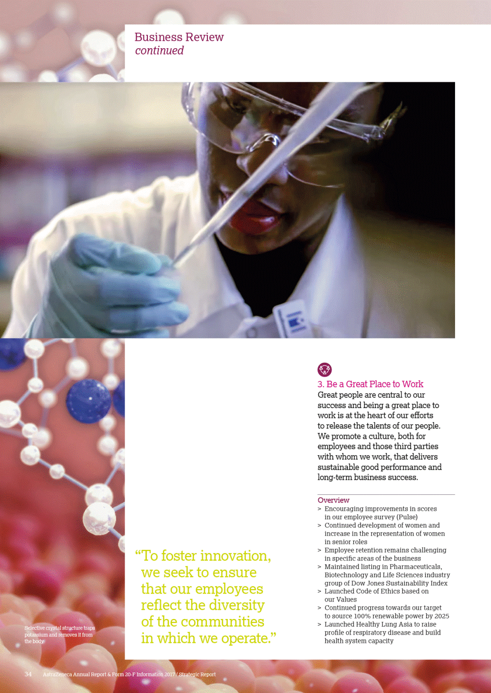 Business Review continued 3. Be a Great Place to Work Great people are central to our success and being a great place to work is at the heart of our efforts to release the talents of our people. We promote a culture, both for employees and those third parties with whom we work, that delivers sustainable good performance and long-term business success. Overview > Encouraging improvements in scores in our employee survey (Pulse) > Continued development of women and increase in the representation of women in senior roles > Employee retention remains challenging in specific areas of the business > Maintained listing in Pharmaceuticals, Biotechnology and Life Sciences industry group of Dow Jones Sustainability Index > Launched Code of Ethics based on our Values > Continued progress towards our target to source 100% renewable power by 2025 > Launched Healthy Lung Asia to raise profile of respiratory disease and build health system capacity “To foster innovation, we seek to ensure that our employees reflect the diversity of the communities in which we operate.” Selective crystal structure traps potassium and removes it from the body 34 AstraZeneca Annual Report & Form 20-F Information 2017 / Strategic Report