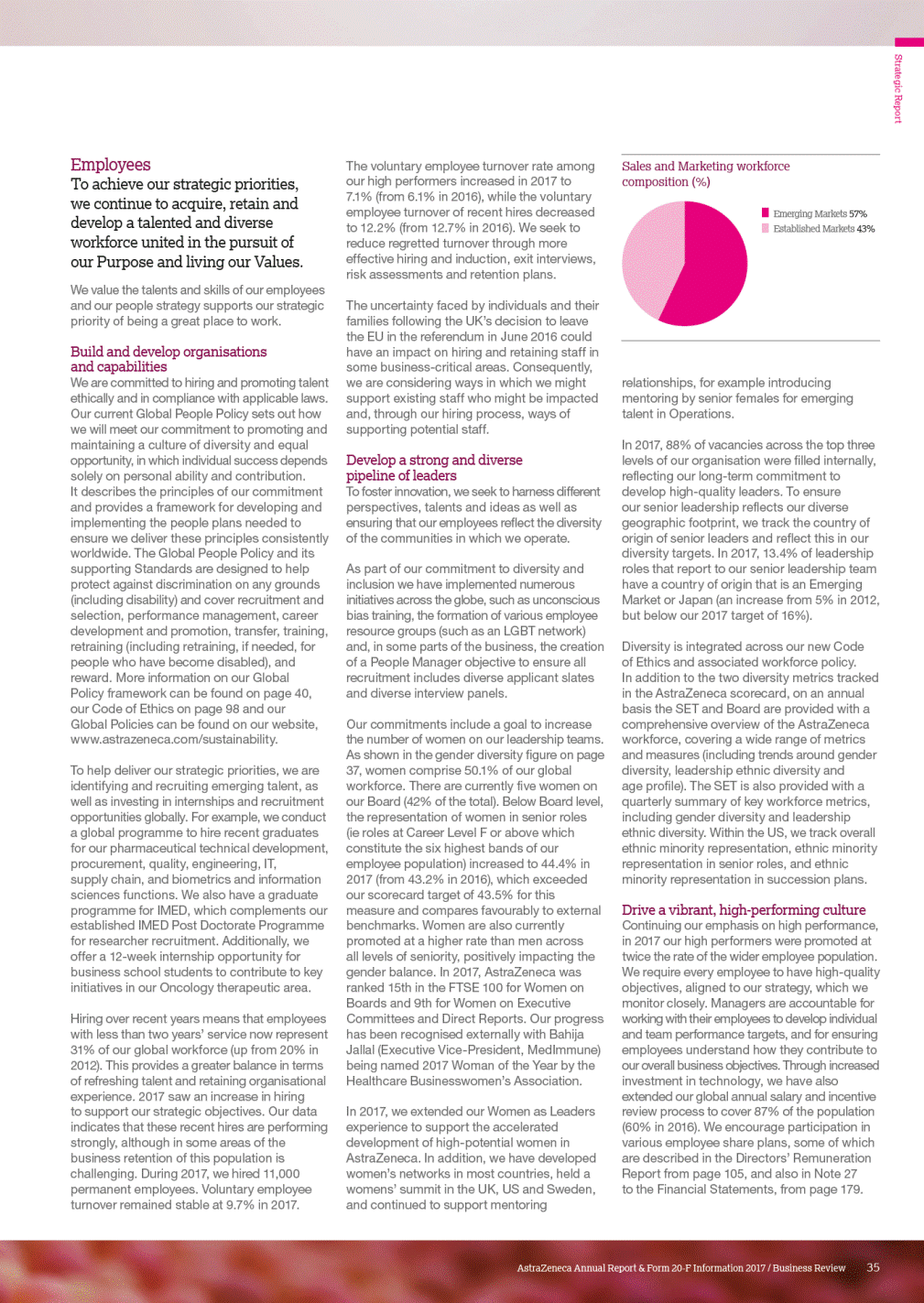 Employees To achieve our strategic priorities, we continue to acquire, retain and develop a talented and diverse workforce united in the pursuit of our Purpose and living our Values. We value the talents and skills of our employees and our people strategy supports our strategic priority of being a great place to work. The voluntary employee turnover rate among our high performers increased in 2017 to 7.1% (from 6.1% in 2016), while the voluntary employee turnover of recent hires decreased to 12.2% (from 12.7% in 2016). We seek to reduce regretted turnover through more effective hiring and induction, exit interviews, risk assessments and retention plans. Sales and Marketing workforce composition (%) Emerging Markets 57% Established Markets 43% The uncertainty faced by individuals and their families following the UK’s decision to leave the EU in the referendum in June 2016 could have an impact on hiring and retaining staff in some business-critical areas. Consequently, we are considering ways in which we might support existing staff who might be impacted and, through our hiring process, ways of supporting potential staff. Build and develop organisations and capabilities We are committed to hiring and promoting talent ethically and in compliance with applicable laws. Our current Global People Policy sets out how we will meet our commitment to promoting and maintaining a culture of diversity and equal opportunity, in which individual success depends solely on personal ability and contribution. It describes the principles of our commitment and provides a framework for developing and implementing the people plans needed to ensure we deliver these principles consistently worldwide. The Global People Policy and its supporting Standards are designed to help protect against discrimination on any grounds (including disability) and cover recruitment and selection, performance management, career development and promotion, transfer, training, retraining (including retraining, if needed, for people who have become disabled), and reward. More information on our Global Policy framework can be found on page 40, our Code of Ethics on page 98 and our Global Policies can be found on our website, www.astrazeneca.com/sustainability. relationships, for example introducing mentoring by senior females for emerging talent in Operations. In 2017, 88% of vacancies across the top three levels of our organisation were filled internally, reflecting our long-term commitment to develop high-quality leaders. To ensure our senior leadership reflects our diverse geographic footprint, we track the country of origin of senior leaders and reflect this in our diversity targets. In 2017, 13.4% of leadership roles that report to our senior leadership team have a country of origin that is an Emerging Market or Japan (an increase from 5% in 2012, but below our 2017 target of 16%). Develop a strong and diverse pipeline of leaders To foster innovation, we seek to harness different perspectives, talents and ideas as well as ensuring that our employees reflect the diversity of the communities in which we operate. As part of our commitment to diversity and inclusion we have implemented numerous initiatives across the globe, such as unconscious bias training, the formation of various employee resource groups (such as an LGBT network) and, in some parts of the business, the creation of a People Manager objective to ensure all recruitment includes diverse applicant slates and diverse interview panels. Diversity is integrated across our new Code of Ethics and associated workforce policy. In addition to the two diversity metrics tracked in the AstraZeneca scorecard, on an annual basis the SET and Board are provided with a comprehensive overview of the AstraZeneca workforce, covering a wide range of metrics and measures (including trends around gender diversity, leadership ethnic diversity and age profile). The SET is also provided with a quarterly summary of key workforce metrics, including gender diversity and leadership ethnic diversity. Within the US, we track overall ethnic minority representation, ethnic minority representation in senior roles, and ethnic minority representation in succession plans. Our commitments include a goal to increase the number of women on our leadership teams. As shown in the gender diversity figure on page 37, women comprise 50.1% of our global workforce. There are currently five women on our Board (42% of the total). Below Board level, the representation of women in senior roles (ie roles at Career Level F or above which constitute the six highest bands of our employee population) increased to 44.4% in 2017 (from 43.2% in 2016), which exceeded our scorecard target of 43.5% for this measure and compares favourably to external benchmarks. Women are also currently promoted at a higher rate than men across all levels of seniority, positively impacting the gender balance. In 2017, AstraZeneca was ranked 15th in the FTSE 100 for Women on Boards and 9th for Women on Executive Committees and Direct Reports. Our progress has been recognised externally with Bahija Jallal (Executive Vice-President, MedImmune) being named 2017 Woman of the Year by the Healthcare Businesswomen’s Association. To help deliver our strategic priorities, we are identifying and recruiting emerging talent, as well as investing in internships and recruitment opportunities globally. For example, we conduct a global programme to hire recent graduates for our pharmaceutical technical development, procurement, quality, engineering, IT, supply chain, and biometrics and information sciences functions. We also have a graduate programme for IMED, which complements our established IMED Post Doctorate Programme for researcher recruitment. Additionally, we offer a 12-week internship opportunity for business school students to contribute to key initiatives in our Oncology therapeutic area. Drive a vibrant, high-performing culture Continuing our emphasis 