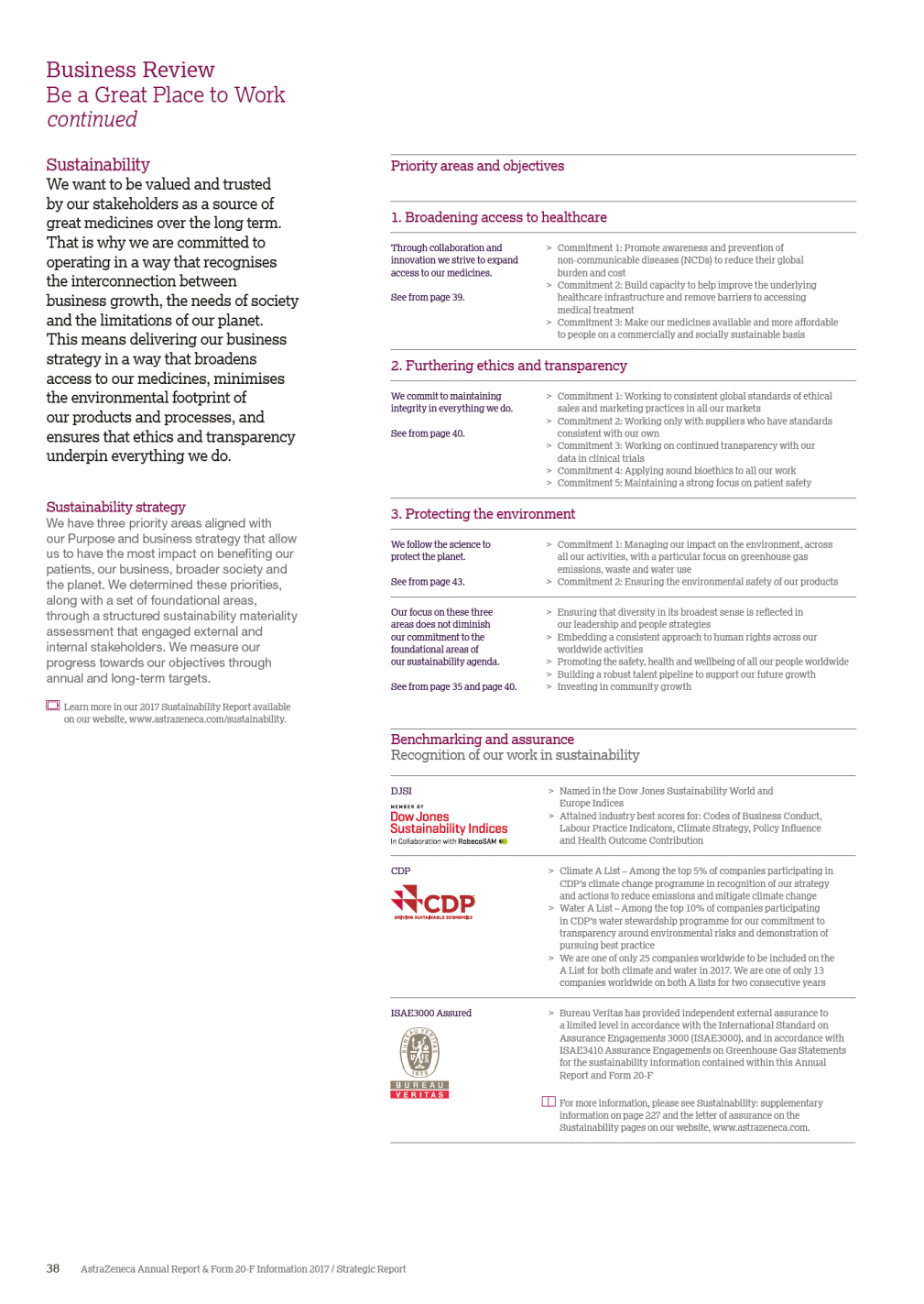 Business Review Be a Great Place to Work continued Sustainability We want to be valued and trusted by our stakeholders as a source of great medicines over the long term. That is why we are committed to operating in a way that recognises the interconnection between business growth, the needs of society and the limitations of our planet. This means delivering our business strategy in a way that broadens access to our medicines, minimises the environmental footprint of our products and processes, and ensures that ethics and transparency underpin everything we do. Priority areas and objectives 1. Broadening access to healthcare Through collaboration and innovation we strive to expand access to our medicines. > Commitment 1: Promote awareness and prevention of non-communicable diseases (NCDs) to reduce their global burden and cost > Commitment 2: Build capacity to help improve the underlying healthcare infrastructure and remove barriers to accessing medical treatment > Commitment 3: Make our medicines available and more affordable to people on a commercially and socially sustainable basis See from page 39. 2. Furthering ethics and transparency We commit to maintaining integrity in everything we do. > Commitment 1: Working to consistent global standards of ethical sales and marketing practices in all our markets > Commitment 2: Working only with suppliers who have standards consistent with our own > Commitment 3: Working on continued transparency with our data in clinical trials > Commitment 4: Applying sound bioethics to all our work > Commitment 5: Maintaining a strong focus on patient safety See from page 40. Sustainability strategy We have three priority areas aligned with our Purpose and business strategy that allow us to have the most impact on benefiting our patients, our business, broader society and the planet. We determined these priorities, along with a set of foundational areas, through a structured sustainability materiality assessment that engaged external and internal stakeholders. We measure our progress towards our objectives through annual and long-term targets. 3. Protecting the environment We follow the science to protect the planet. > Commitment 1: Managing our impact on the environment, across all our activities, with a particular focus on greenhouse gas emissions, waste and water use > Commitment 2: Ensuring the environmental safety of our products See from page 43. Our focus on these three areas does not diminish our commitment to the foundational areas of our sustainability agenda. > Ensuring that diversity in its broadest sense is reflected in our leadership and people strategies > Embedding a consistent approach to human rights across our worldwide activities > Promoting the safety, health and wellbeing of all our people worldwide > Building a robust talent pipeline to support our future growth > Investing in community growth See from page 35 and page 40. Learn more in our 2017 Sustainability Report available on our website, www.astrazeneca.com/sustainability. Benchmarking and assurance Recognition of our work in sustainability DJSI > Named in the Dow Jones Sustainability World and Europe Indices > Attained industry best scores for: Codes of Business Conduct, Labour Practice Indicators, Climate Strategy, Policy Influence and Health Outcome Contribution CDP > Climate A List – Among the top 5% of companies participating in CDP’s climate change programme in recognition of our strategy and actions to reduce emissions and mitigate climate change > Water A List – Among the top 10% of companies participating in CDP’s water stewardship programme for our commitment to transparency around environmental risks and demonstration of pursuing best practice > We are one of only 25 companies worldwide to be included on the A List for both climate and water in 2017. We are one of only 13 companies worldwide on both A lists for two consecutive years ISAE3000 Assured > Bureau Veritas has provided independent external assurance to a limited level in accordance with the International Standard on Assurance Engagements 3000 (ISAE3000), and in accordance with ISAE3410 Assurance Engagements on Greenhouse Gas Statements for the sustainability information contained within this Annual Report and Form 20-F For more information, please see Sustainability: supplementary information on page 227 and the letter of assurance on the Sustainability pages on our website, www.astrazeneca.com. 38 AstraZeneca Annual Report & Form 20-F Information 2017 / Strategic Report