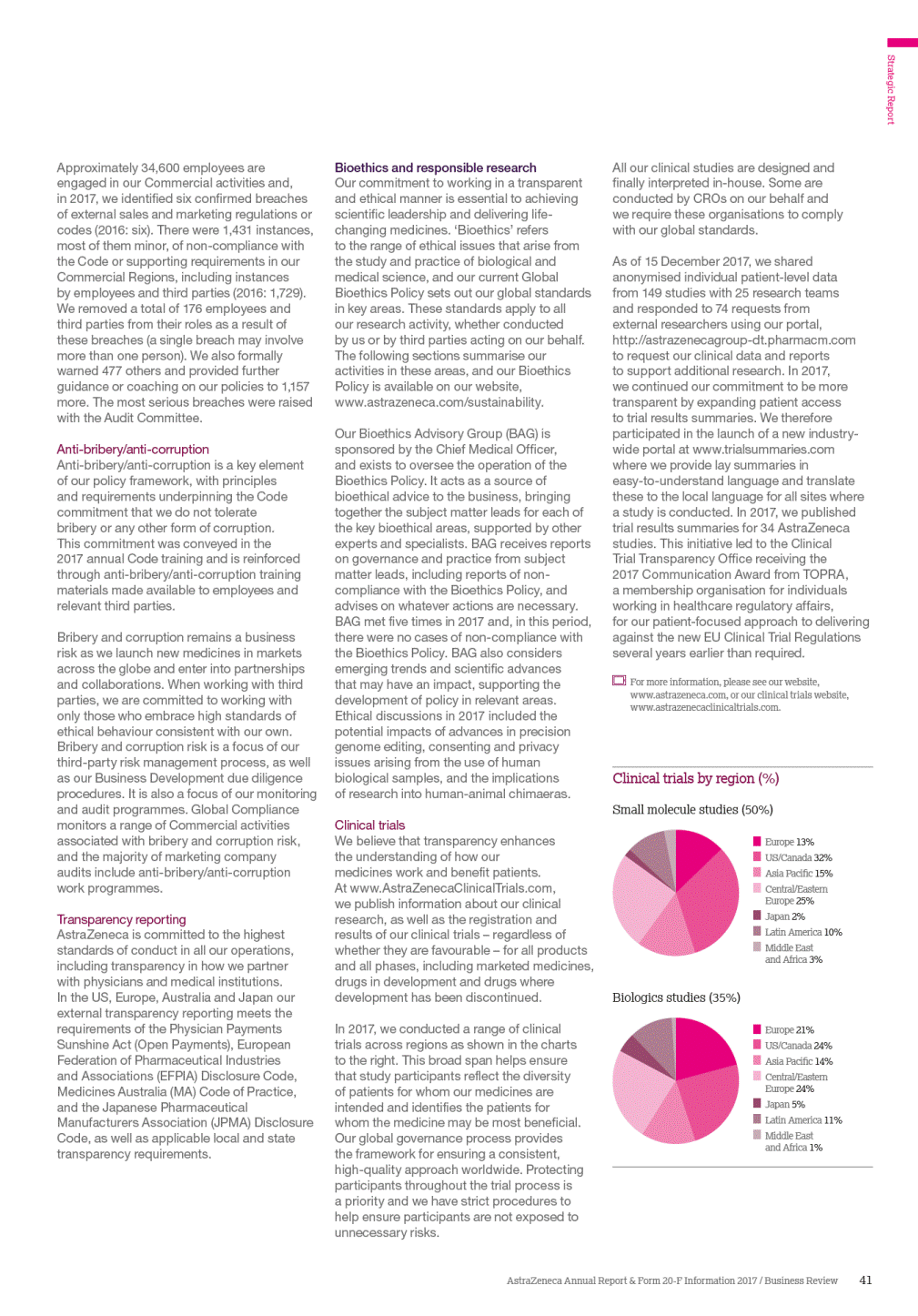 Approximately 34,600 employees are engaged in our Commercial activities and, in 2017, we identified six confirmed breaches of external sales and marketing regulations or codes (2016: six). There were 1,431 instances, most of them minor, of non-compliance with the Code or supporting requirements in our Commercial Regions, including instances by employees and third parties (2016: 1,729). We removed a total of 176 employees and third parties from their roles as a result of these breaches (a single breach may involve more than one person). We also formally warned 477 others and provided further guidance or coaching on our policies to 1,157 more. The most serious breaches were raised with the Audit Committee. Bioethics and responsible research Our commitment to working in a transparent and ethical manner is essential to achieving scientific leadership and delivering life-changing medicines. ‘Bioethics’ refers to the range of ethical issues that arise from the study and practice of biological and medical science, and our current Global Bioethics Policy sets out our global standards in key areas. These standards apply to all our research activity, whether conducted by us or by third parties acting on our behalf. The following sections summarise our activities in these areas, and our Bioethics Policy is available on our website, www.astrazeneca.com/sustainability. All our clinical studies are designed and finally interpreted in-house. Some are conducted by CROs on our behalf and we require these organisations to comply with our global standards. As of 15 December 2017, we shared anonymised individual patient-level data from 149 studies with 25 research teams and responded to 74 requests from external researchers using our portal, http://astrazenecagroup-dt.pharmacm.com to request our clinical data and reports to support additional research. In 2017, we continued our commitment to be more transparent by expanding patient access to trial results summaries. We therefore participated in the launch of a new industry-wide portal at www.trialsummaries.com where we provide lay summaries in easy-to-understand language and translate these to the local language for all sites where a study is conducted. In 2017, we published trial results summaries for 34 AstraZeneca studies. This initiative led to the Clinical Trial Transparency Office receiving the 2017 Communication Award from TOPRA, a membership organisation for individuals working in healthcare regulatory affairs, for our patient-focused approach to delivering against the new EU Clinical Trial Regulations several years earlier than required. Our Bioethics Advisory Group (BAG) is sponsored by the Chief Medical Officer, and exists to oversee the operation of the Bioethics Policy. It acts as a source of bioethical advice to the business, bringing together the subject matter leads for each of the key bioethical areas, supported by other experts and specialists. BAG receives reports on governance and practice from subject matter leads, including reports of non-compliance with the Bioethics Policy, and advises on whatever actions are necessary. BAG met five times in 2017 and, in this period, there were no cases of non-compliance with the Bioethics Policy. BAG also considers emerging trends and scientific advances that may have an impact, supporting the development of policy in relevant areas. Ethical discussions in 2017 included the potential impacts of advances in precision genome editing, consenting and privacy issues arising from the use of human biological samples, and the implications of research into human-animal chimaeras. Anti-bribery/anti-corruption Anti-bribery/anti-corruption is a key element of our policy framework, with principles and requirements underpinning the Code commitment that we do not tolerate bribery or any other form of corruption. This commitment was conveyed in the 2017 annual Code training and is reinforced through anti-bribery/anti-corruption training materials made available to employees and relevant third parties. Bribery and corruption remains a business risk as we launch new medicines in markets across the globe and enter into partnerships and collaborations. When working with third parties, we are committed to working with only those who embrace high standards of ethical behaviour consistent with our own. Bribery and corruption risk is a focus of our third-party risk management process, as well as our Business Development due diligence procedures. It is also a focus of our monitoring and audit programmes. Global Compliance monitors a range of Commercial activities associated with bribery and corruption risk, and the majority of marketing company audits include anti-bribery/anti-corruption work programmes. For more information, please see our website, www.astrazeneca.com, or our clinical trials website, www.astrazenecaclinicaltrials.com. Clinical trials by region (%) Small molecule studies (50%) Clinical trials We believe that transparency enhances the understanding of how our medicines work and benefit patients. At www.AstraZenecaClinicalTrials.com, we publish information about our clinical research, as well as the registration and results of our clinical trials – regardless of whether they are favourable – for all products and all phases, including marketed medicines, drugs in development and drugs where development has been discontinued. Europe 13% US/Canada 32% Asia Pacific 15% Central/Eastern Europe 25% Japan 2% Latin America 10% Middle East and Africa 3% Transparency reporting AstraZeneca is committed to the highest standards of conduct in all our operations, including transparency in how we partner with physicians and medical institutions. In the US, Europe, Australia and Japan our external transparency reporting meets the requirements of the Physician Payments Sunshine Act (Open Payments), European Federation of Pharmaceutical Industries and Associations (EFPIA) Disclosure Code, Medicines Australia (MA) Code o