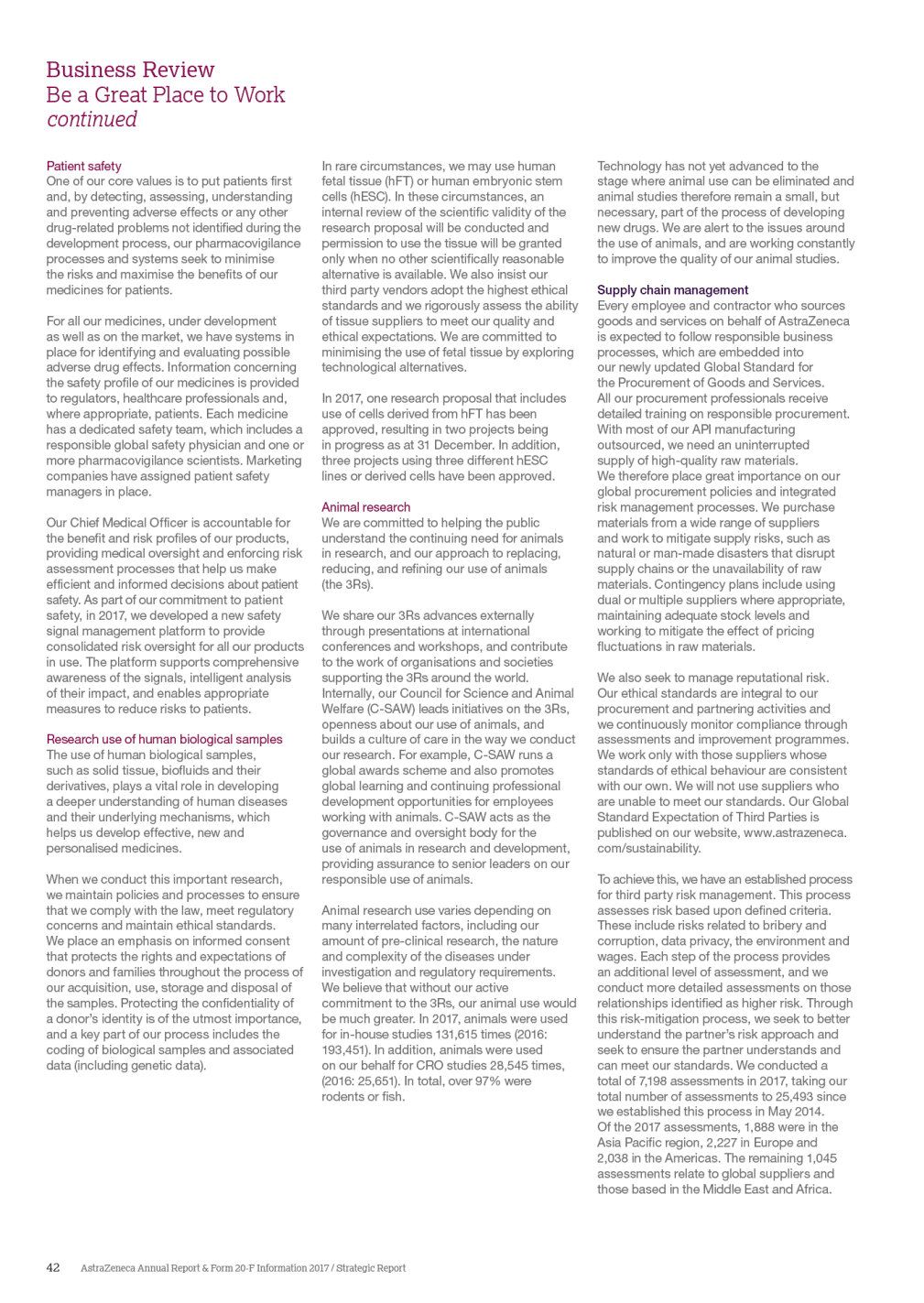Business Review Be a Great Place to Work continued Patient safety One of our core values is to put patients first and, by detecting, assessing, understanding and preventing adverse effects or any other drug-related problems not identified during the development process, our pharmacovigilance processes and systems seek to minimise the risks and maximise the benefits of our medicines for patients. In rare circumstances, we may use human fetal tissue (hFT) or human embryonic stem cells (hESC). In these circumstances, an internal review of the scientific validity of the research proposal will be conducted and permission to use the tissue will be granted only when no other scientifically reasonable alternative is available. We also insist our third party vendors adopt the highest ethical standards and we rigorously assess the ability of tissue suppliers to meet our quality and ethical expectations. We are committed to minimising the use of fetal tissue by exploring technological alternatives. Technology has not yet advanced to the stage where animal use can be eliminated and animal studies therefore remain a small, but necessary, part of the process of developing new drugs. We are alert to the issues around the use of animals, and are working constantly to improve the quality of our animal studies. Supply chain management Every employee and contractor who sources goods and services on behalf of AstraZeneca is expected to follow responsible business processes, which are embedded into our newly updated Global Standard for the Procurement of Goods and Services. All our procurement professionals receive detailed training on responsible procurement. With most of our API manufacturing outsourced, we need an uninterrupted supply of high-quality raw materials. We therefore place great importance on our global procurement policies and integrated risk management processes. We purchase materials from a wide range of suppliers and work to mitigate supply risks, such as natural or man-made disasters that disrupt supply chains or the unavailability of raw materials. Contingency plans include using dual or multiple suppliers where appropriate, maintaining adequate stock levels and working to mitigate the effect of pricing fluctuations in raw materials. For all our medicines, under development as well as on the market, we have systems in place for identifying and evaluating possible adverse drug effects. Information concerning the safety profile of our medicines is provided to regulators, healthcare professionals and, where appropriate, patients. Each medicine has a dedicated safety team, which includes a responsible global safety physician and one or more pharmacovigilance scientists. Marketing companies have assigned patient safety managers in place. In 2017, one research proposal that includes use of cells derived from hFT has been approved, resulting in two projects being in progress as at 31 December. In addition, three projects using three different hESC lines or derived cells have been approved. Animal research We are committed to helping the public understand the continuing need for animals in research, and our approach to replacing, reducing, and refining our use of animals (the 3Rs). Our Chief Medical Officer is accountable for the benefit and risk profiles of our products, providing medical oversight and enforcing risk assessment processes that help us make efficient and informed decisions about patient safety. As part of our commitment to patient safety, in 2017, we developed a new safety signal management platform to provide consolidated risk oversight for all our products in use. The platform supports comprehensive awareness of the signals, intelligent analysis of their impact, and enables appropriate measures to reduce risks to patients. We share our 3Rs advances externally through presentations at international conferences and workshops, and contribute to the work of organisations and societies supporting the 3Rs around the world. Internally, our Council for Science and Animal Welfare (C-SAW) leads initiatives on the 3Rs, openness about our use of animals, and builds a culture of care in the way we conduct our research. For example, C-SAW runs a global awards scheme and also promotes global learning and continuing professional development opportunities for employees working with animals. C-SAW acts as the governance and oversight body for the use of animals in research and development, providing assurance to senior leaders on our responsible use of animals. We also seek to manage reputational risk. Our ethical standards are integral to our procurement and partnering activities and we continuously monitor compliance through assessments and improvement programmes. We work only with those suppliers whose standards of ethical behaviour are consistent with our own. We will not use suppliers who are unable to meet our standards. Our Global Standard Expectation of Third Parties is published on our website, www.astrazeneca. com/sustainability. Research use of human biological samples The use of human biological samples, such as solid tissue, biofluids and their derivatives, plays a vital role in developing a deeper understanding of human diseases and their underlying mechanisms, which helps us develop effective, new and personalised medicines. When we conduct this important research, we maintain policies and processes to ensure that we comply with the law, meet regulatory concerns and maintain ethical standards. We place an emphasis on informed consent that protects the rights and expectations of donors and families throughout the process of our acquisition, use, storage and disposal of the samples. Protecting the confidentiality of a donor’s identity is of the utmost importance, and a key part of our process includes the coding of biological samples and associated data (including genetic data). To achieve this, we have an established process for third party risk management. This process assesses r